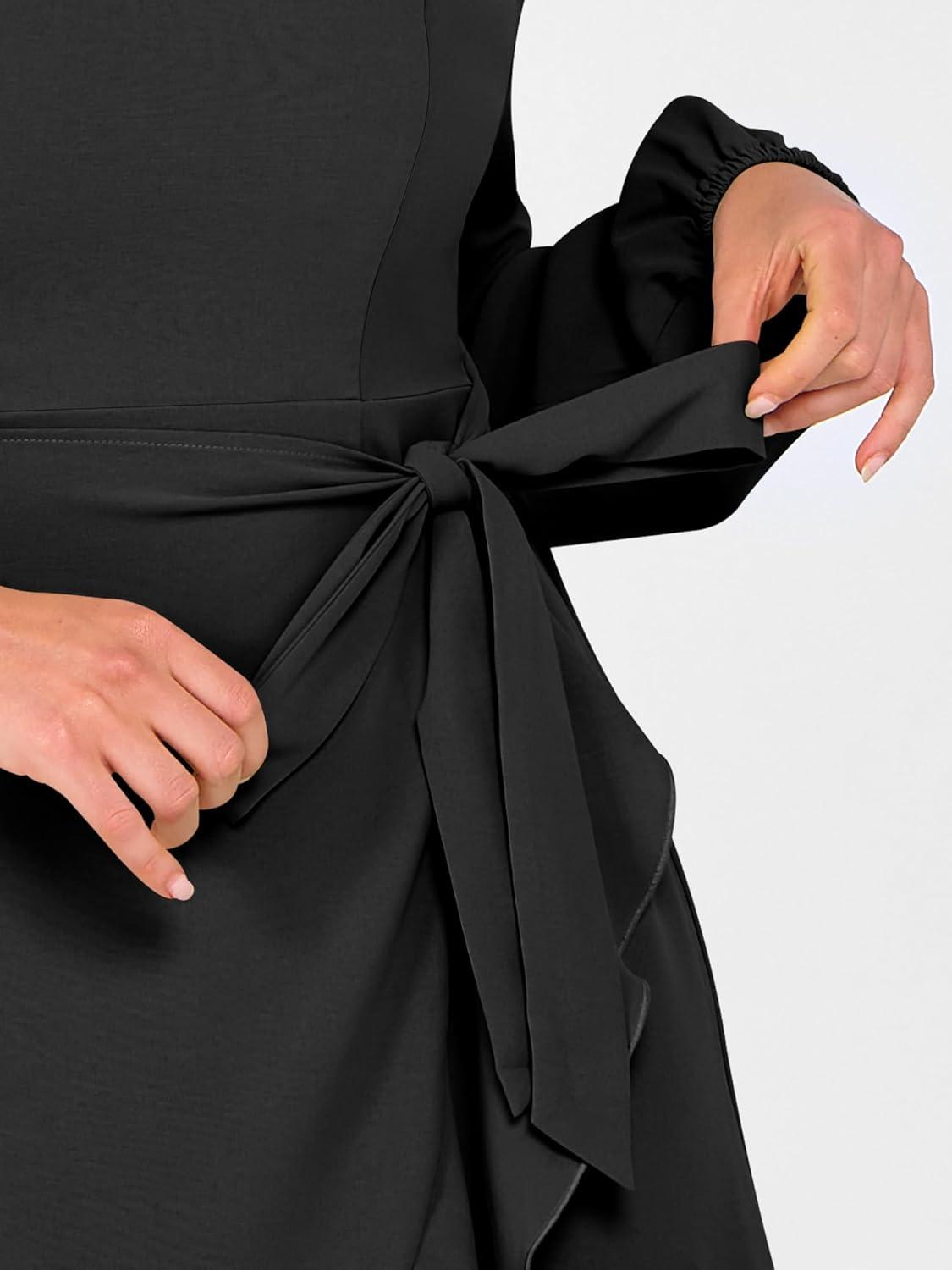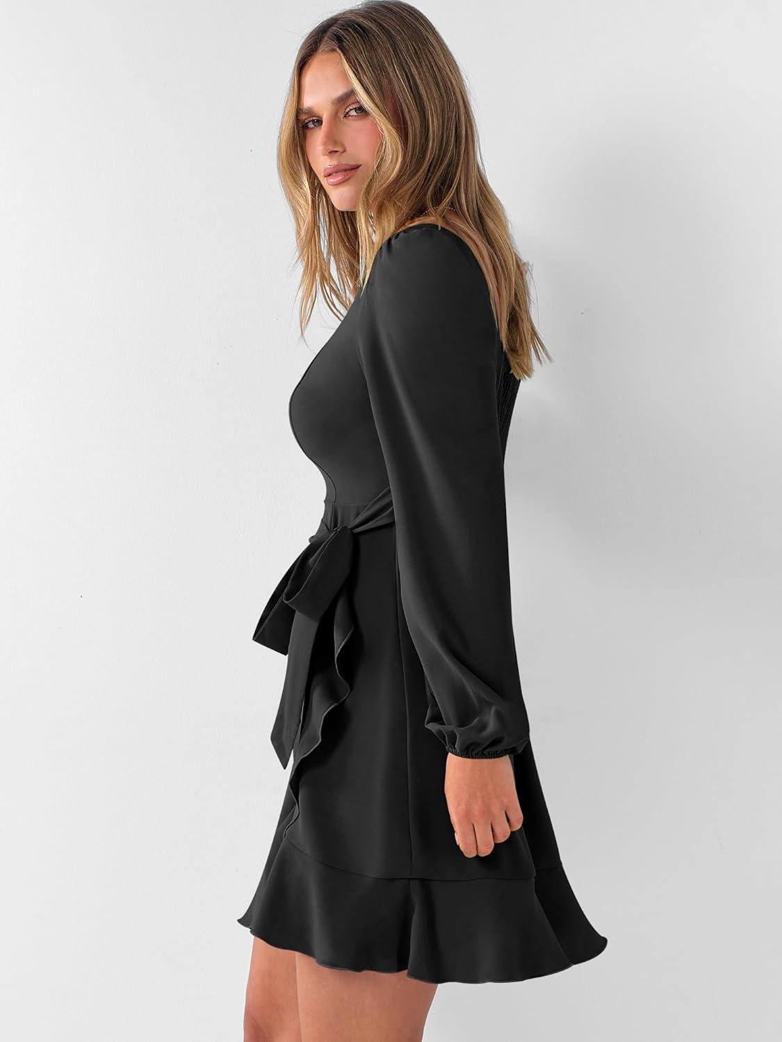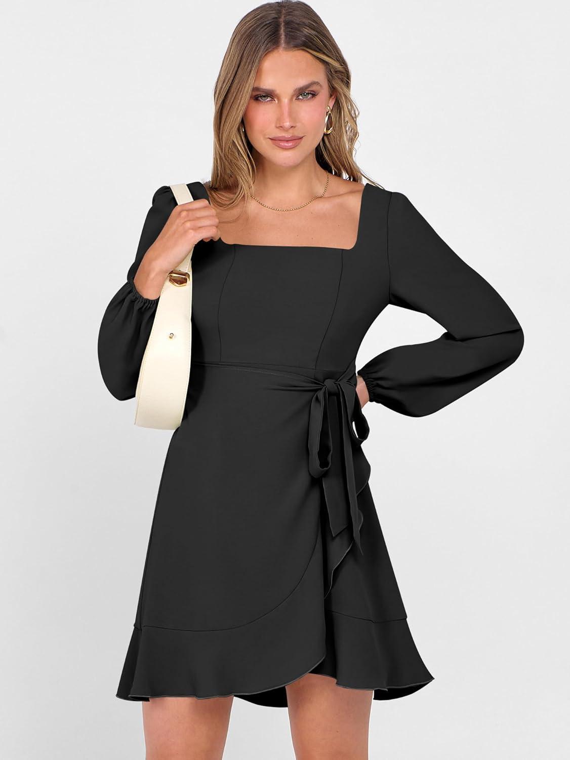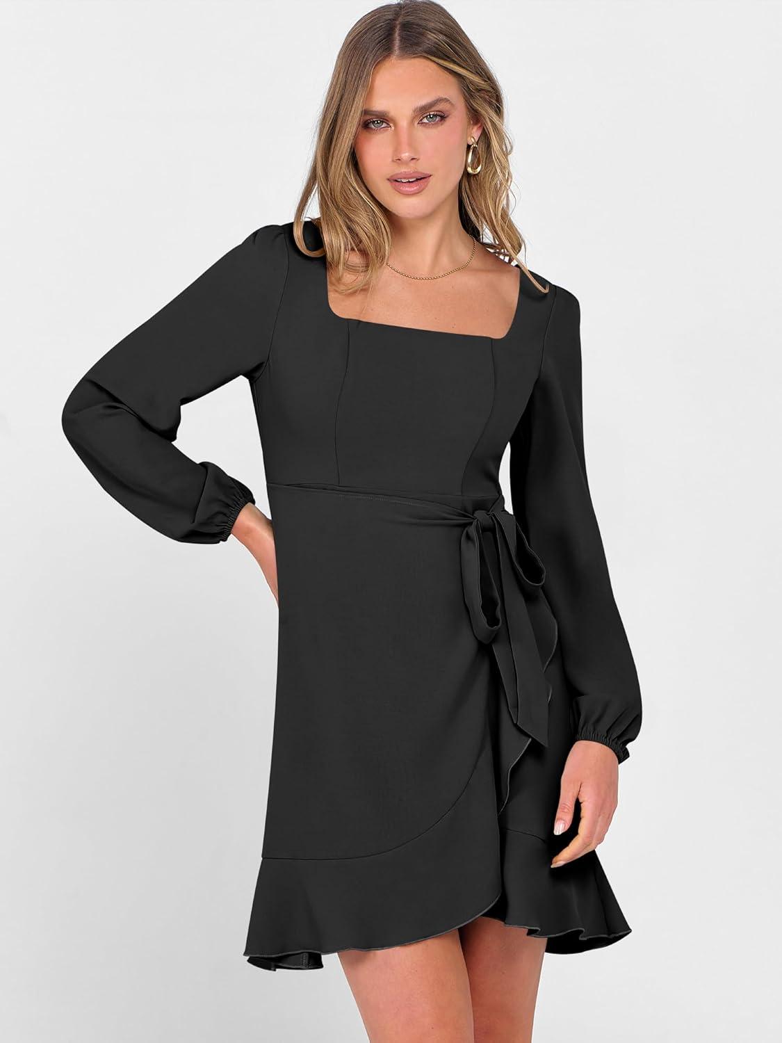 ANRABESS Womens Dress Long Sleeve Square Neck Tie Waist Ruffle Hem Short Cocktail Wedding Guest Fall Party Club Mini Dresses(Black)