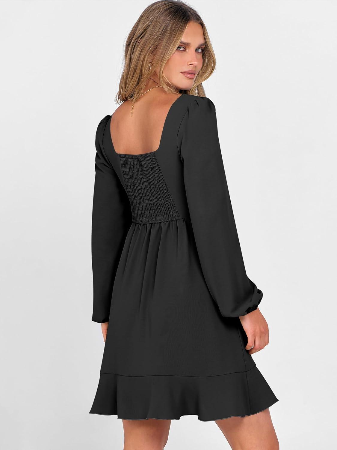 ANRABESS Womens long sleeve dresses made of 100% polyester soft fabric. This mini dress has lantern sleeve, square neck, ruffle hem, tie waist, short length, smocked back, a-line, swing and flowy features. Women’s fall dresses perfect for cocktail, formal, party, date night, wedding guest, travel, work and daily casual wear.