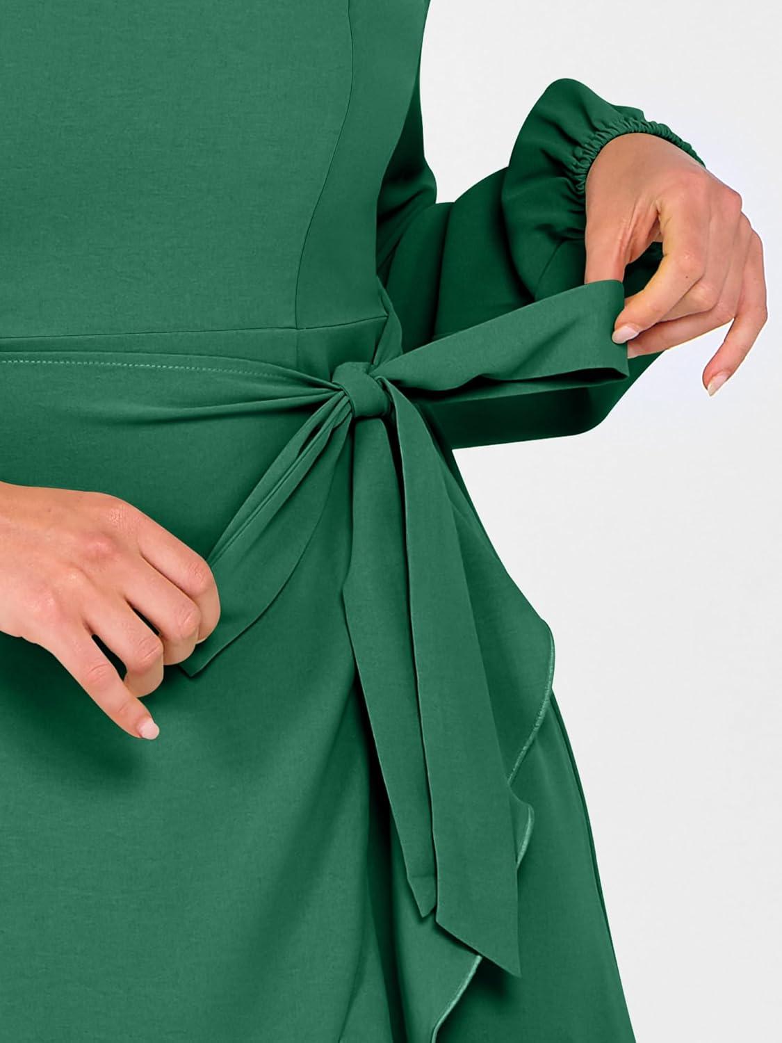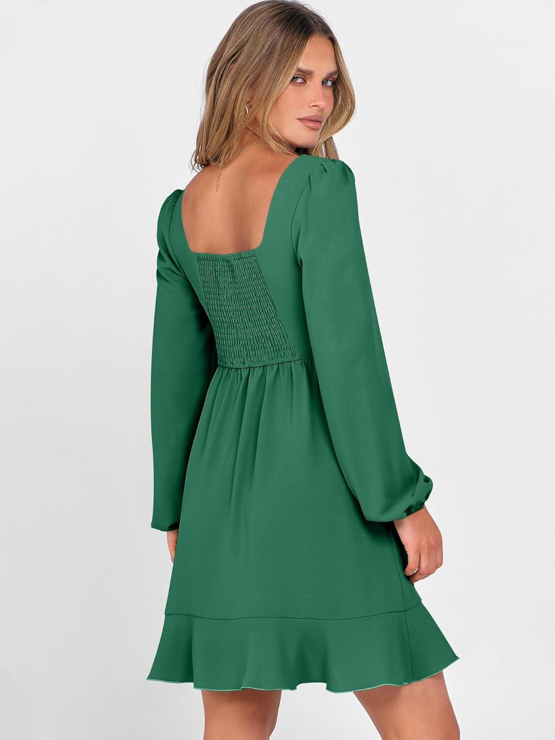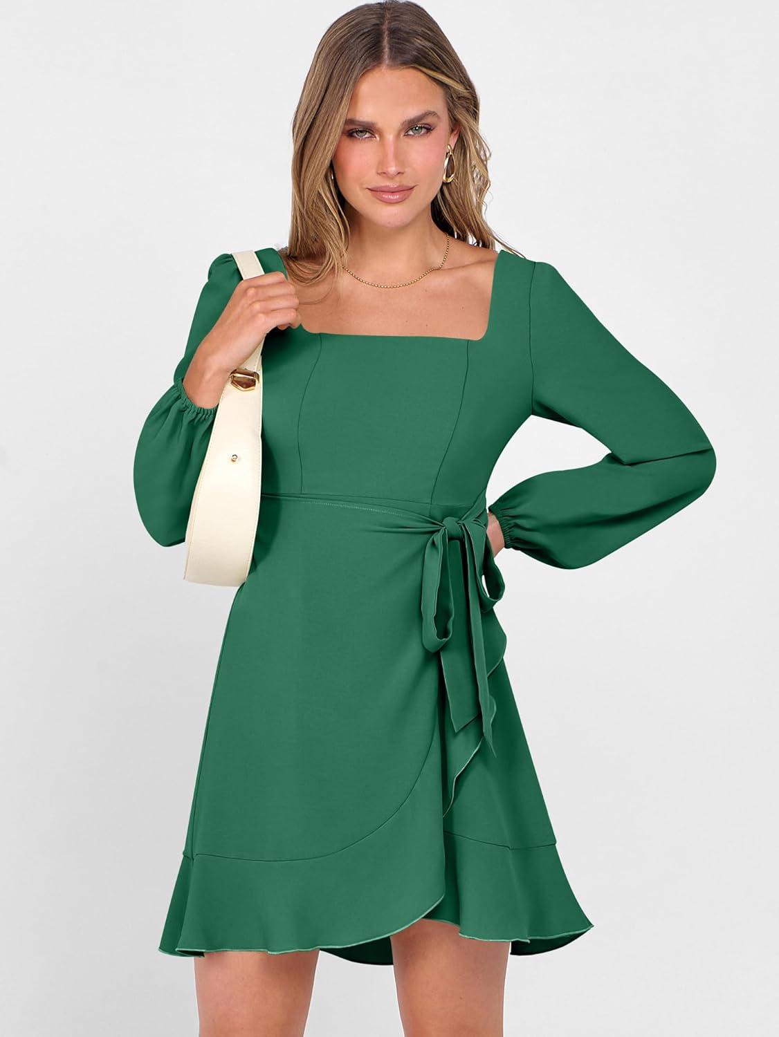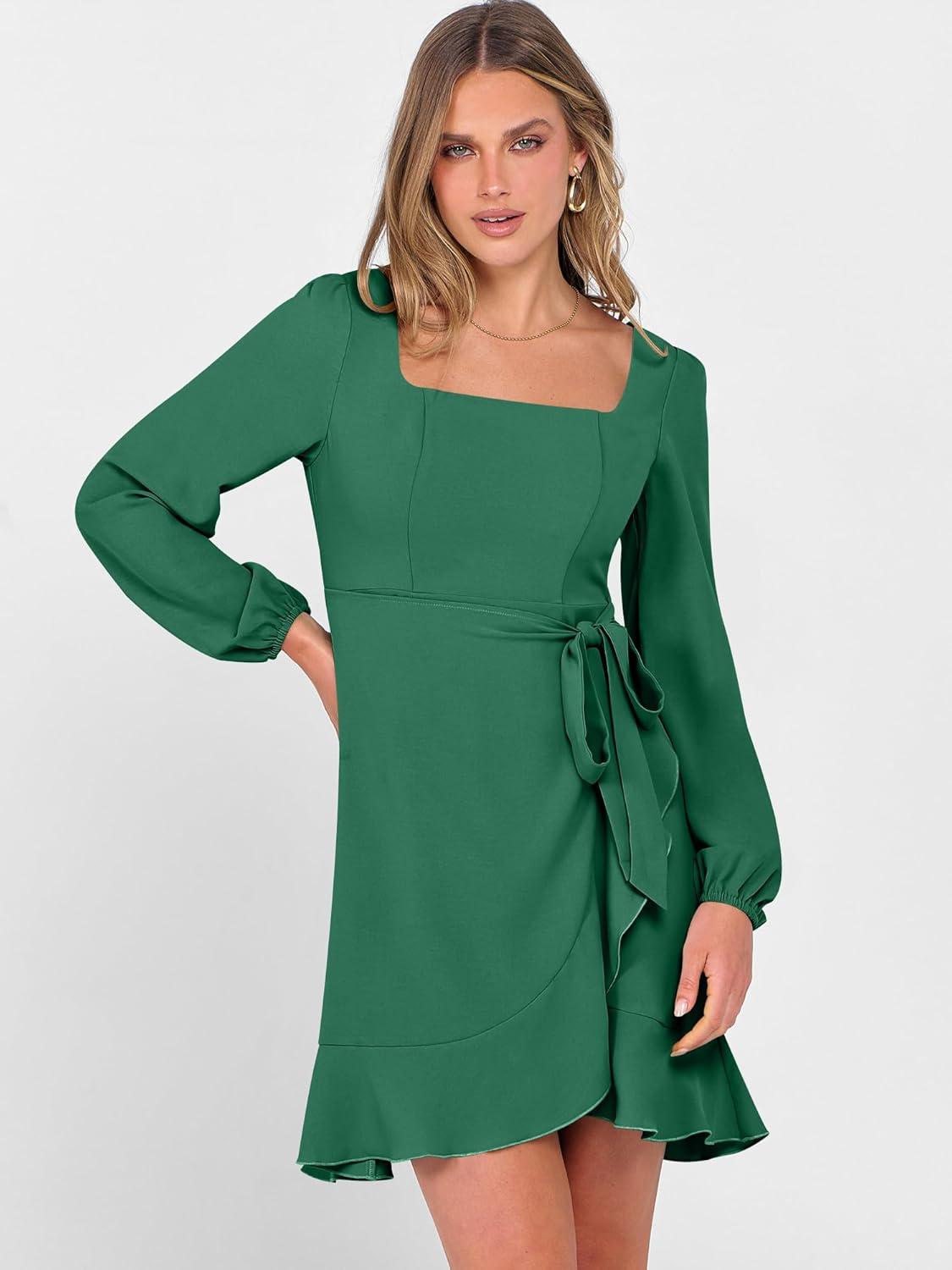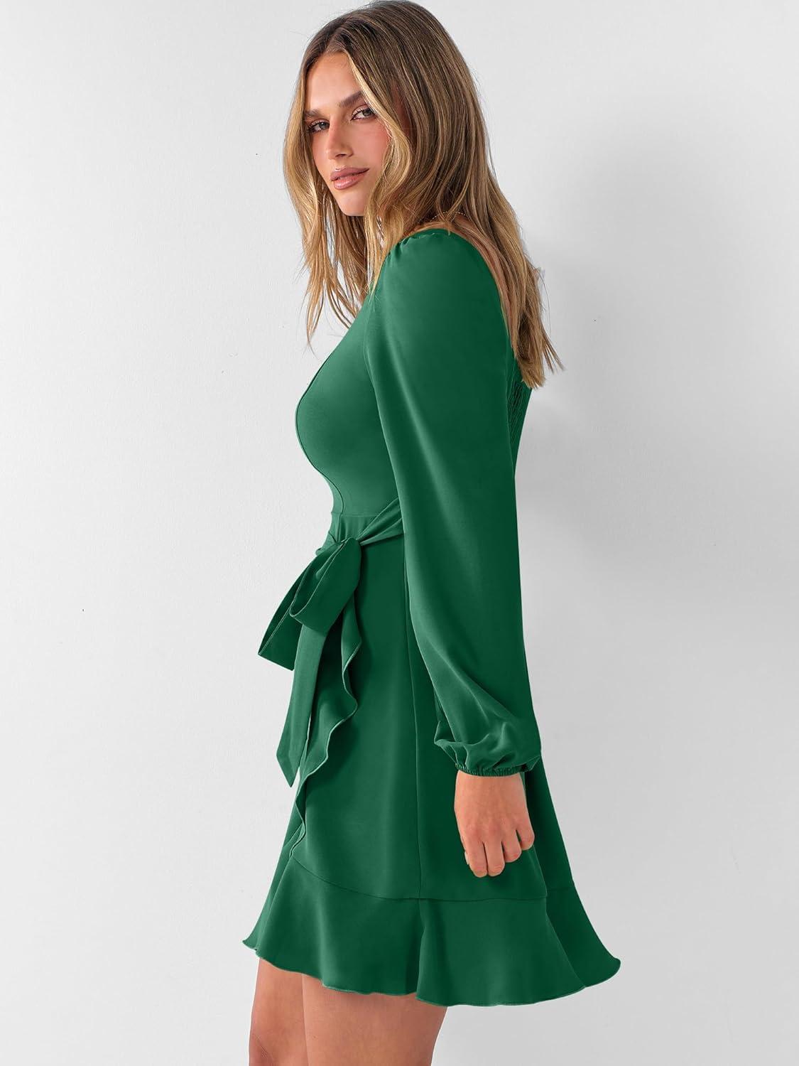 ANRABESS Womens Dress Long Sleeve Square Neck Tie Waist Ruffle Hem Short Cocktail Wedding Guest Fall Party Club Mini Dresses(Forest Green)