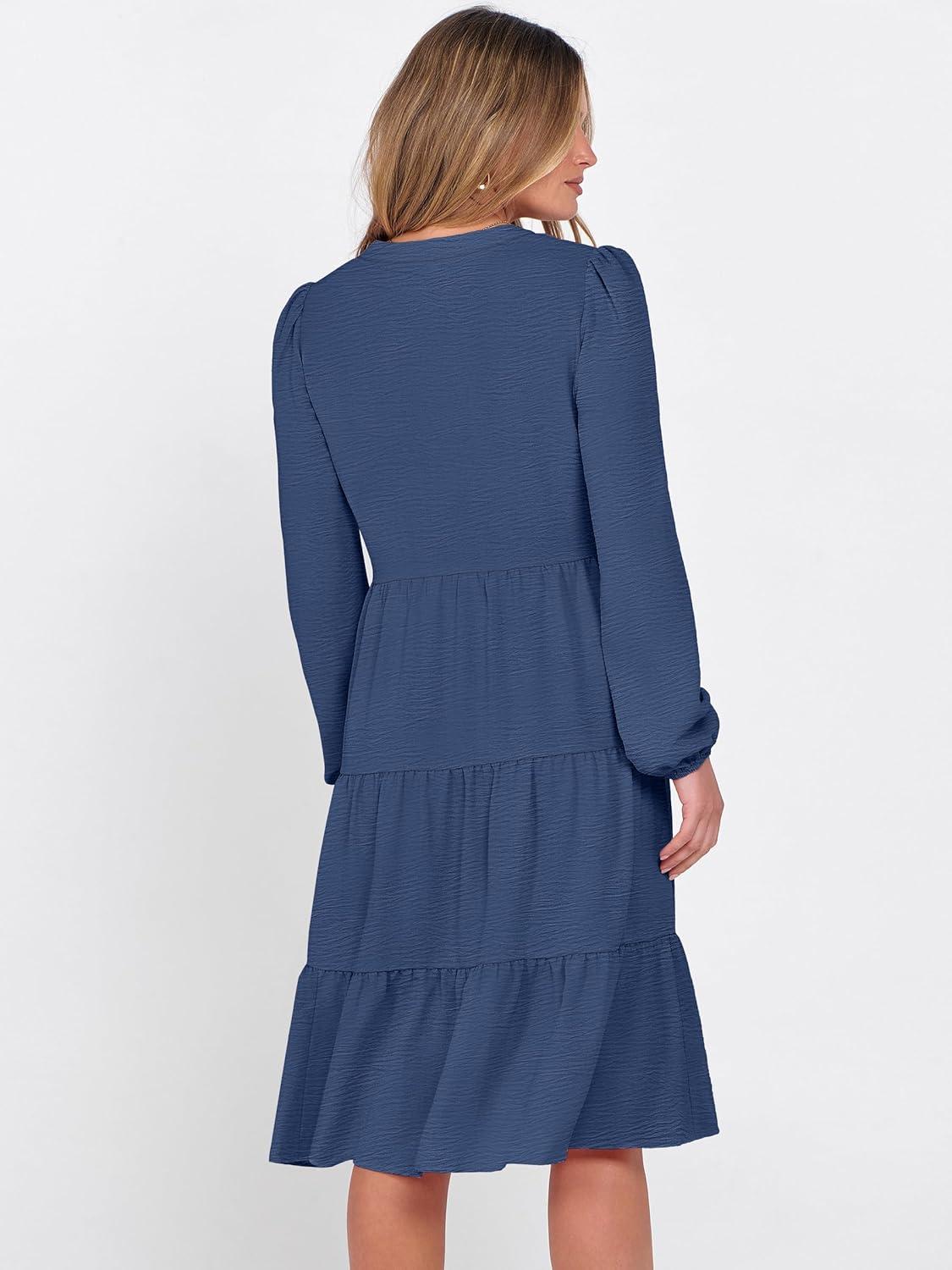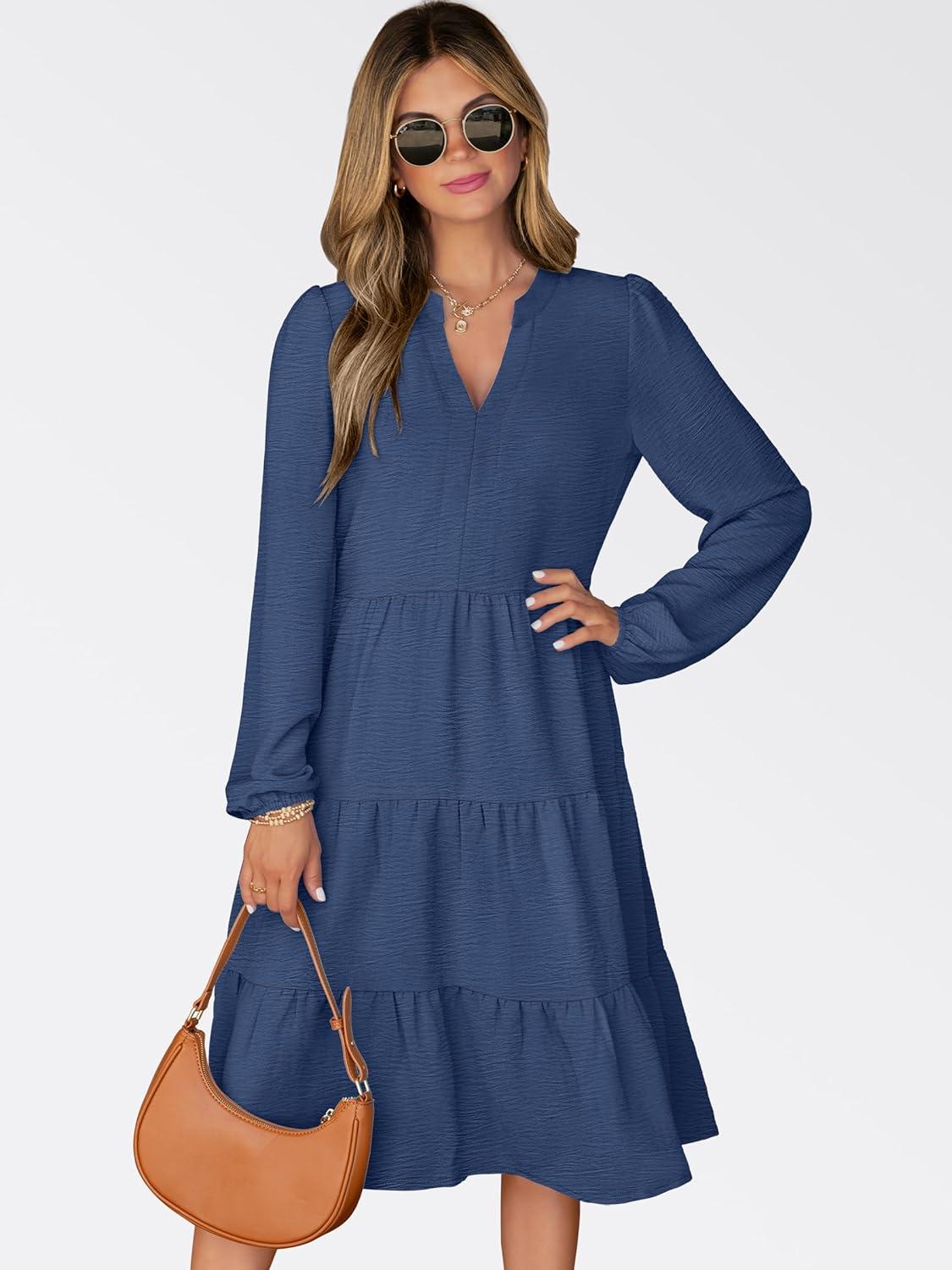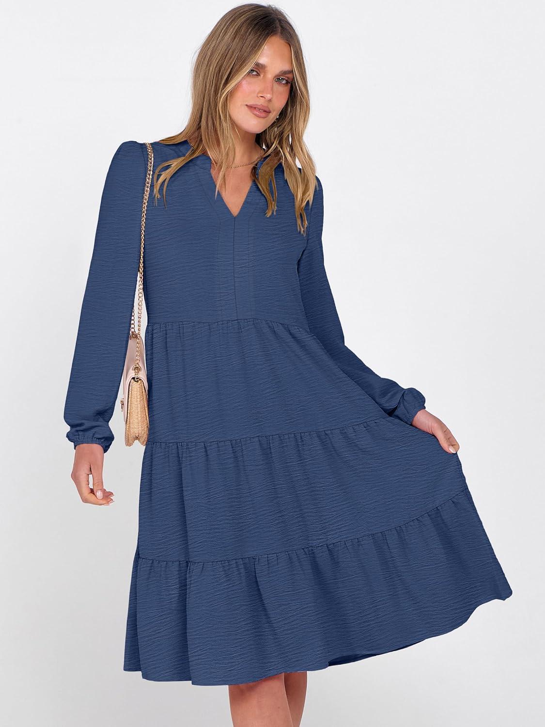 ANRABESS Womens Fall Midi Dresses Long Sleeve V Neck Swing Tiered Work Business Casual 2025 Flowy Beach Vacation Dress(Deep Blue)