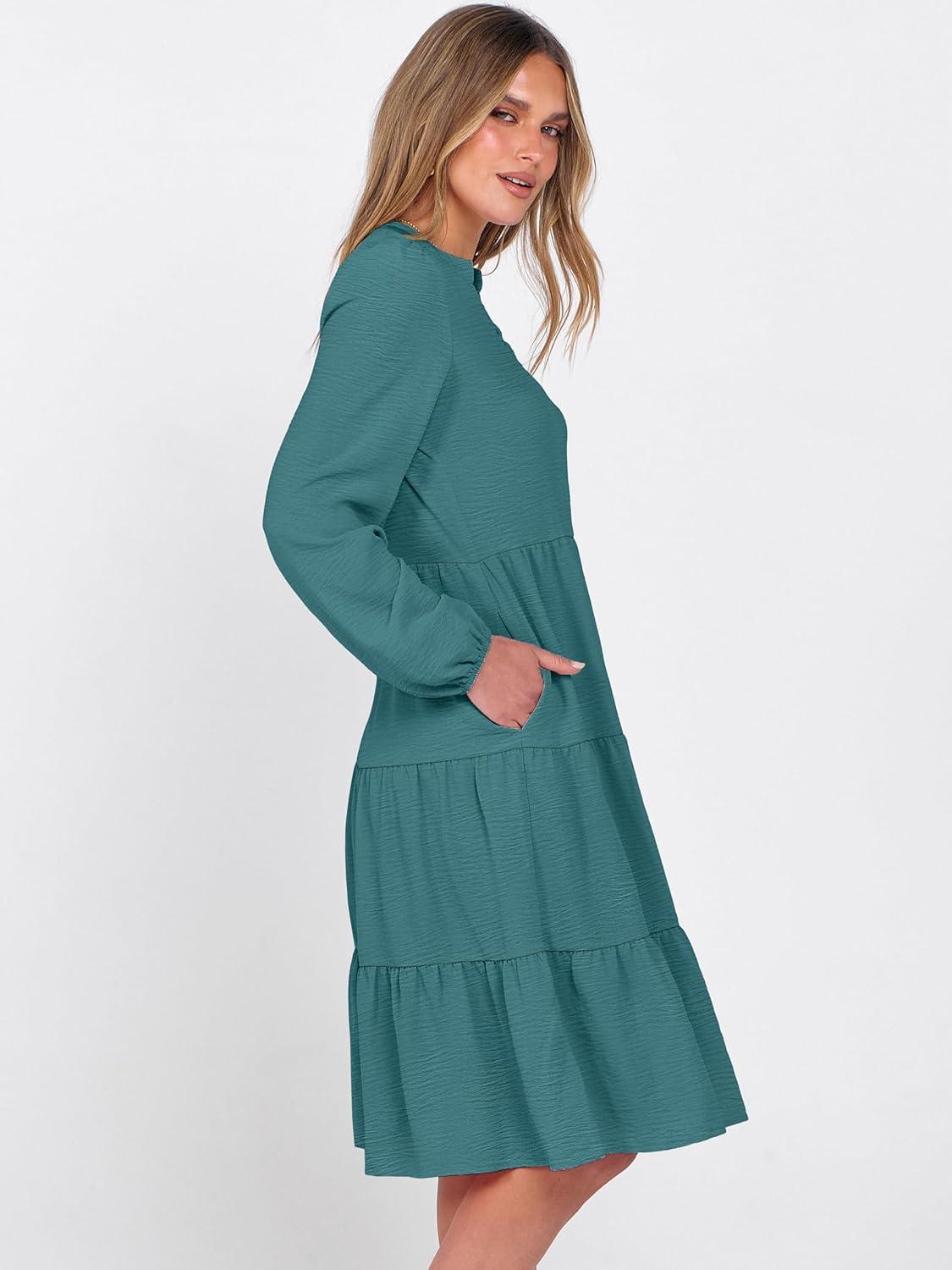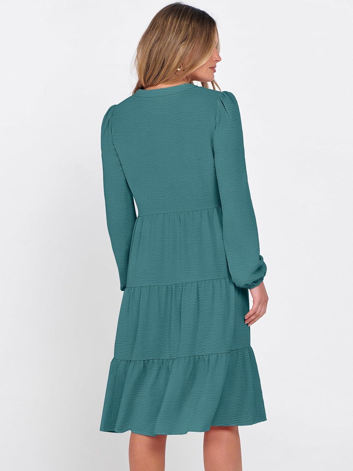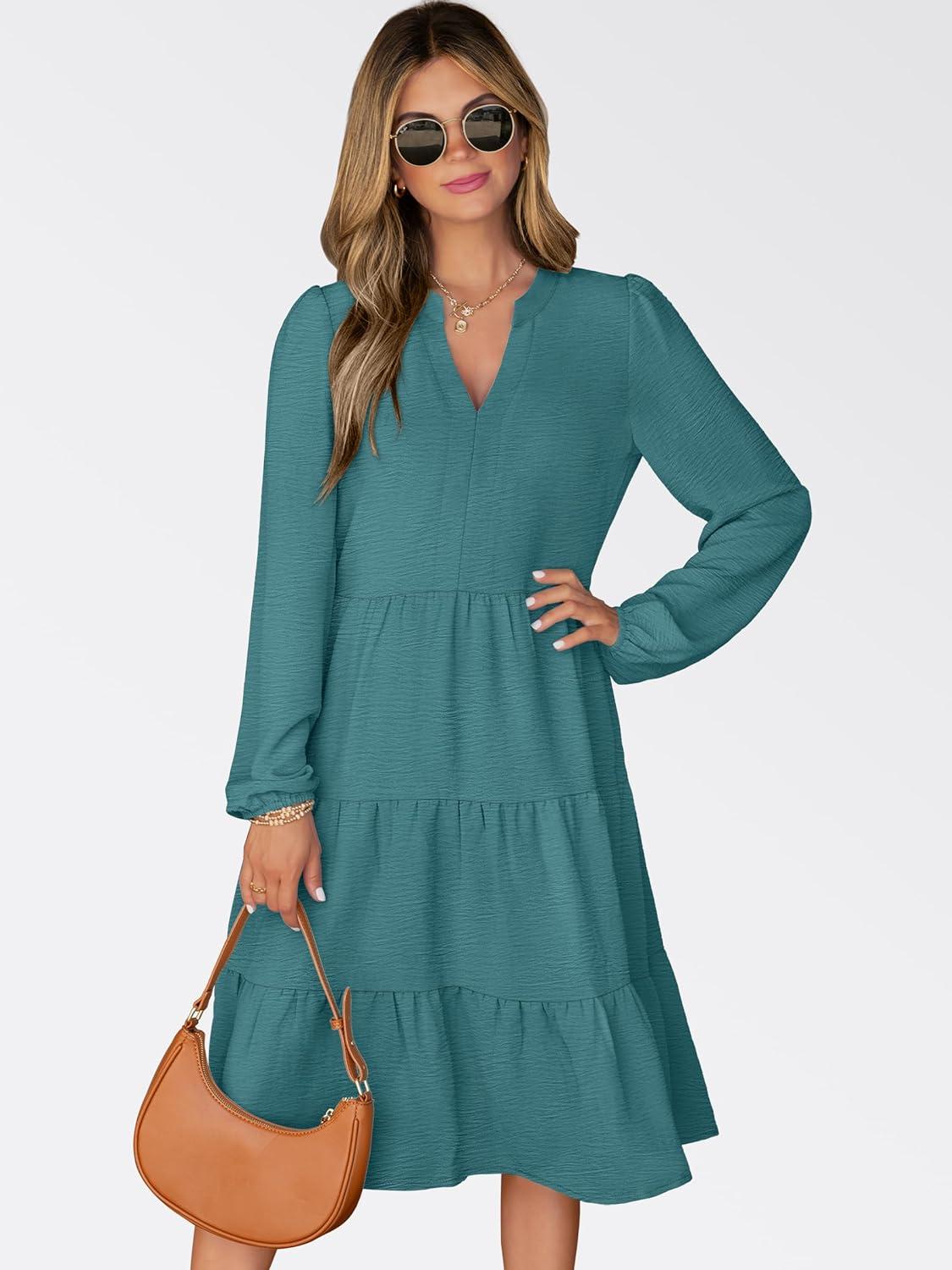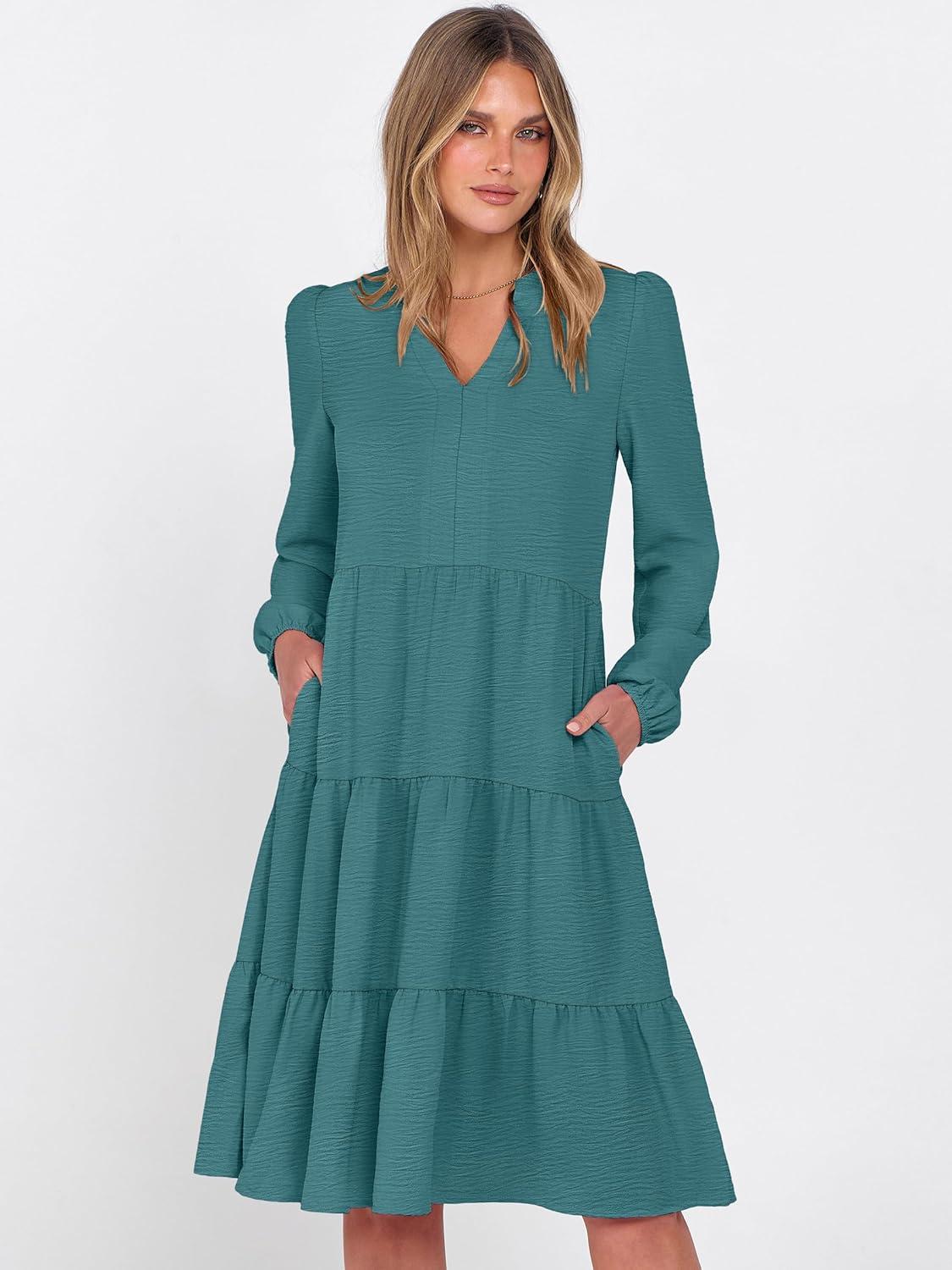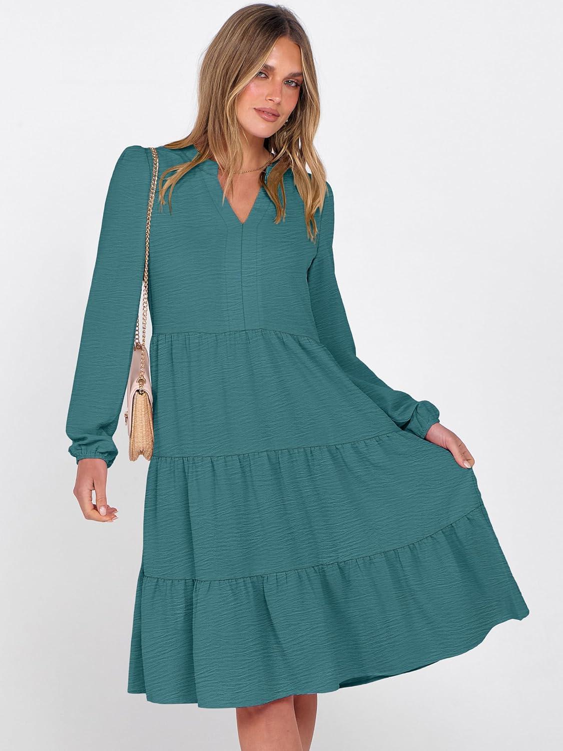 ANRABESS Womens Fall Midi Dresses Long Sleeve V Neck Swing Tiered Work Business Casual 2025 Flowy Beach Vacation Dress(Lake)