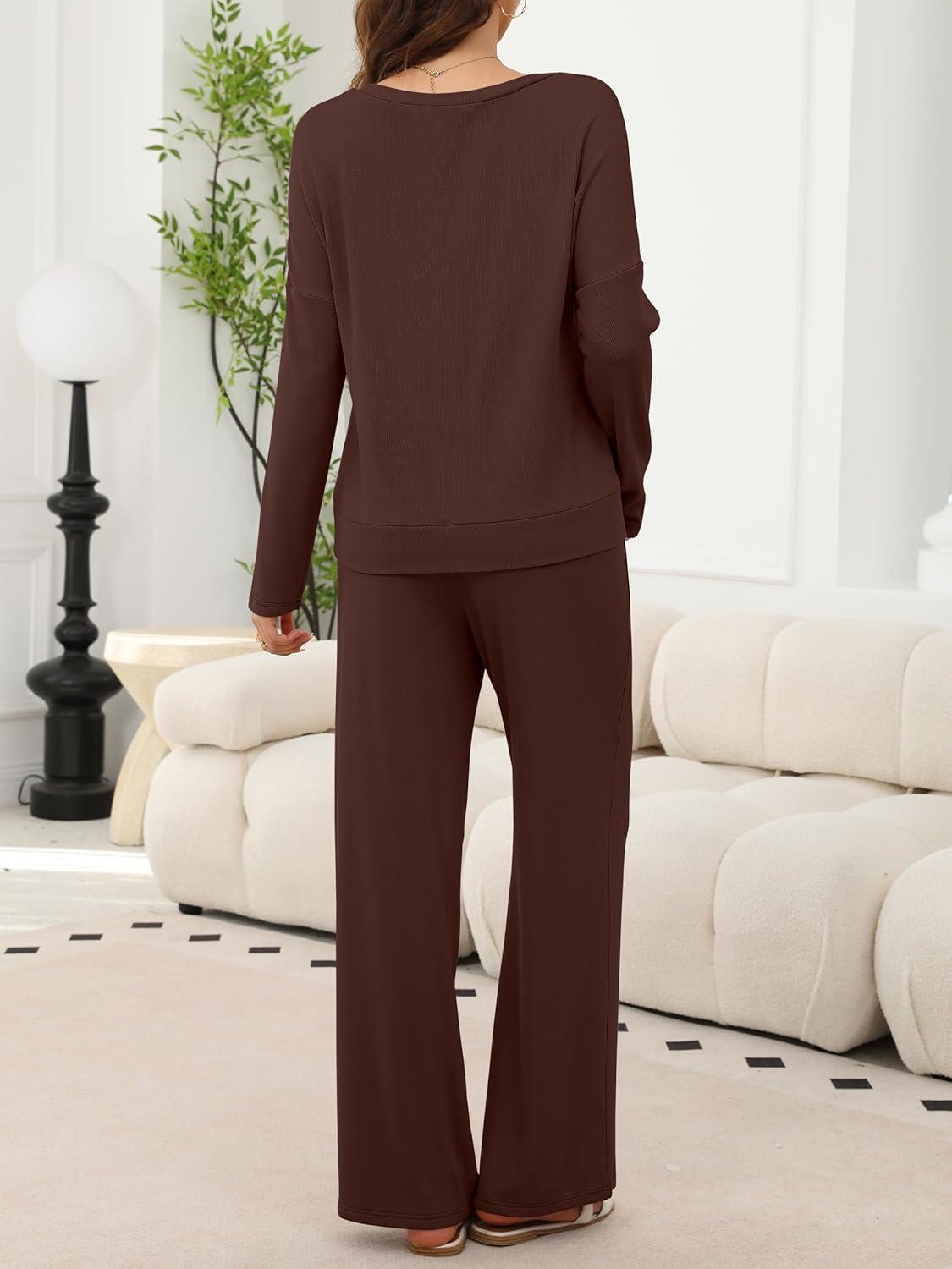 ANRABESS Womens Fleece Pajama Sets 2 Piece Outfits Matching Lounge Set Casual Ribbed Knit Long Sleeve Pj 2025 Fall Sleepwear(Dark Brown)