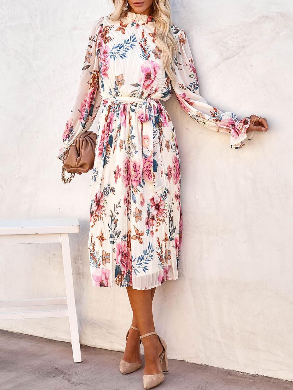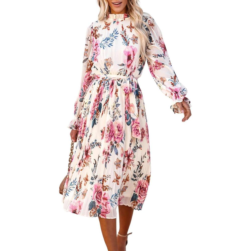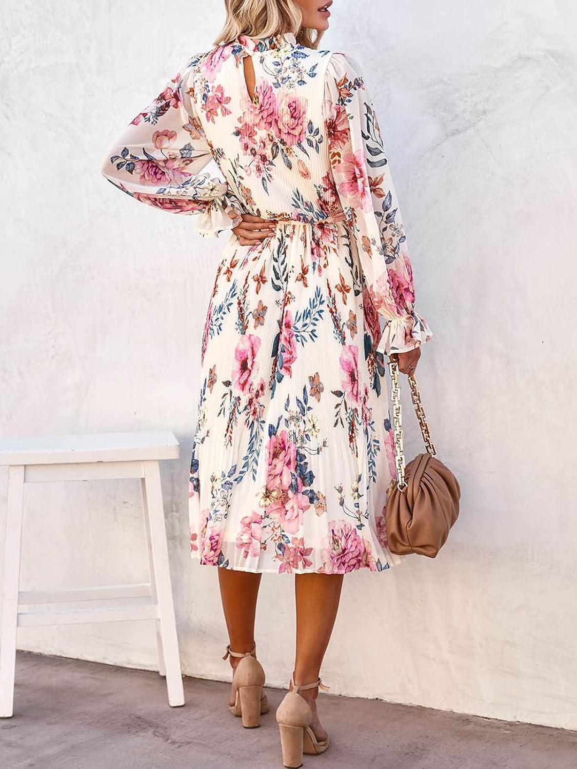 ANRABESS Women’s Floral Chiffon Midi Dress Puff Long Sleeve Mock Neck Summer Wedding Guest Party Dresses Fall 2025 Outfits(Floral Pink)