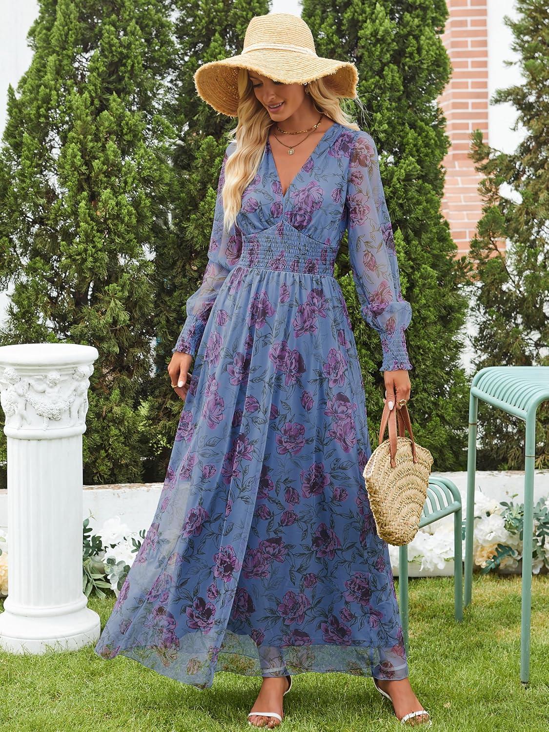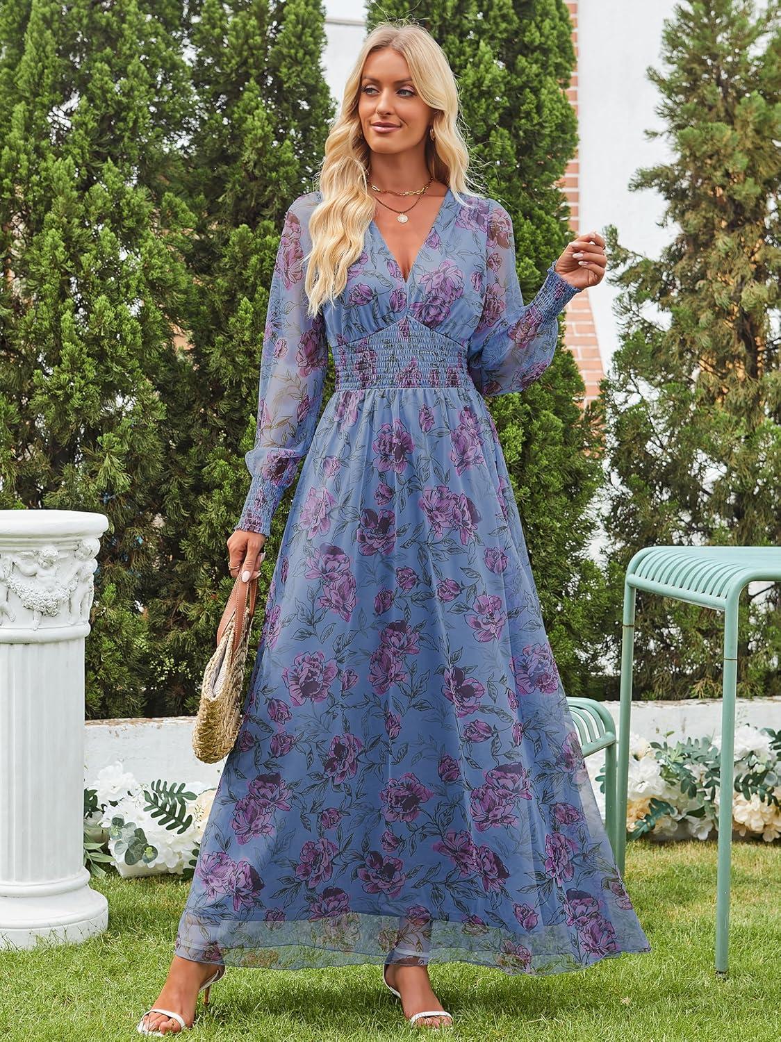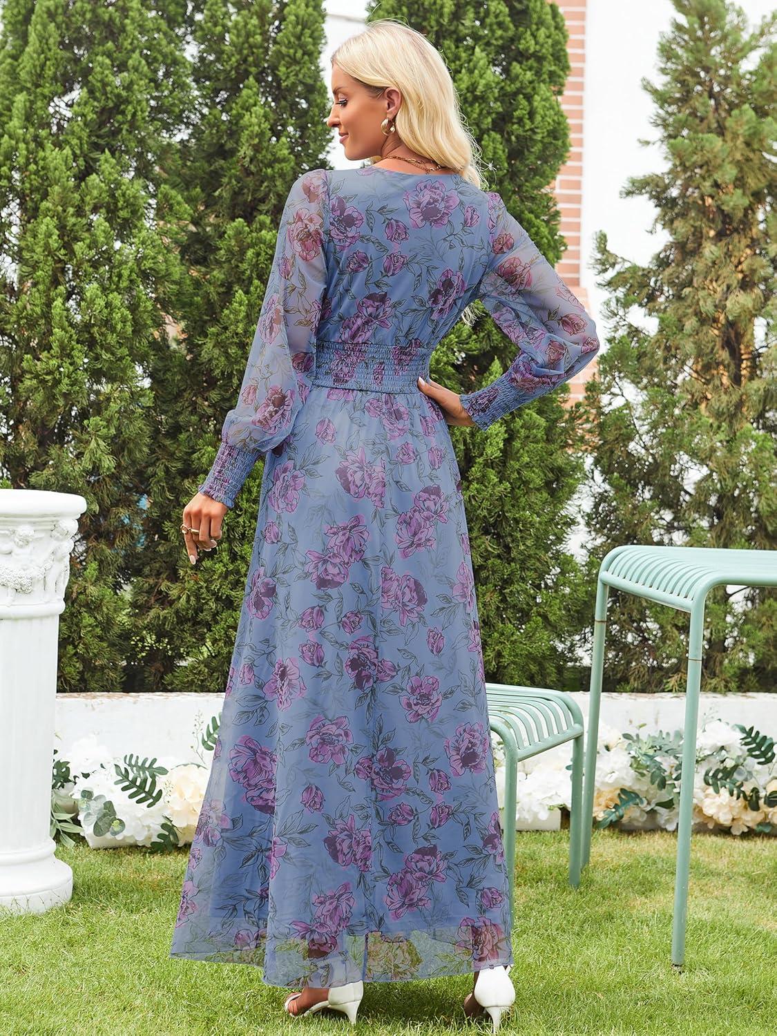 ANRABESS Women’s Floral Maxi Dress 2025 Fall V Neck Puff Long Sleeve Flowy Casual Wedding Guest Tee Party Tulle Dresses(Purple Floral Blue)