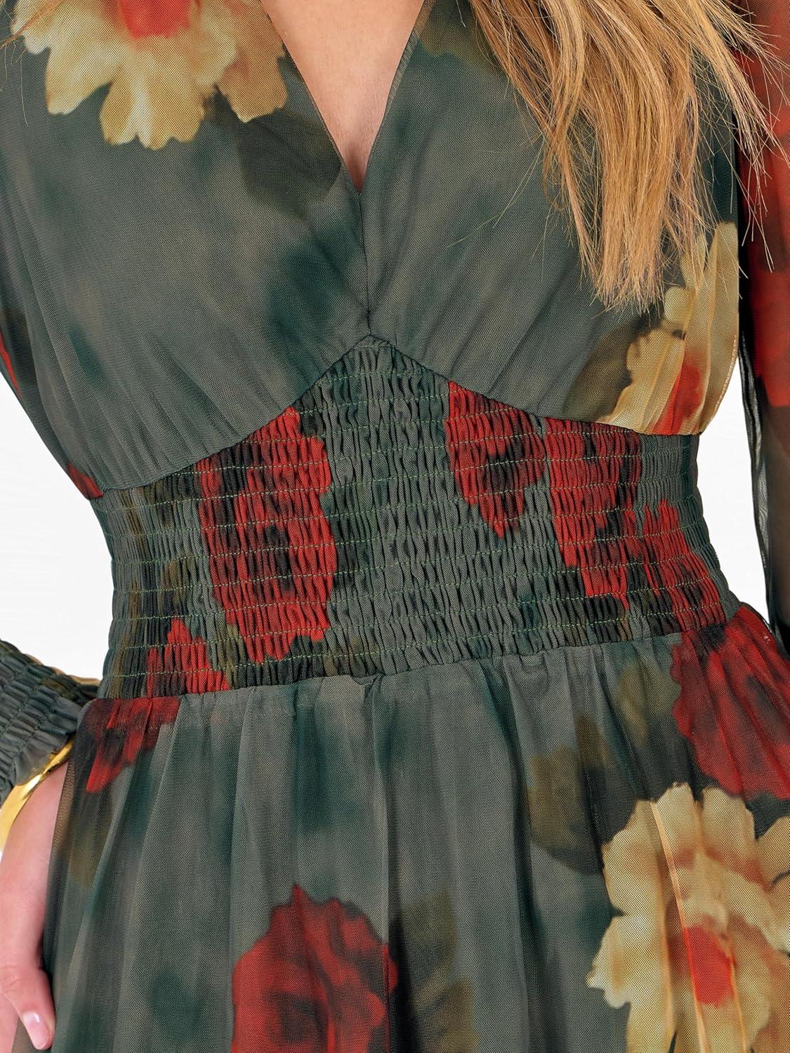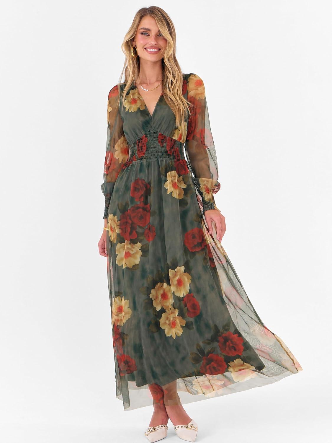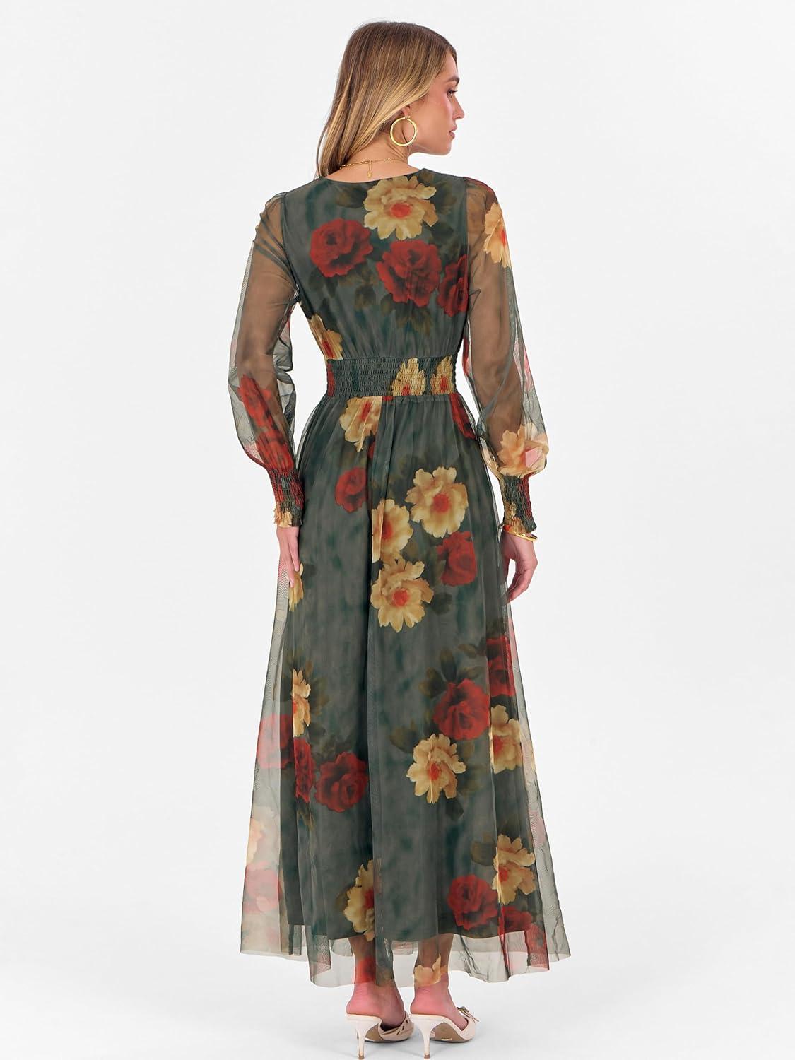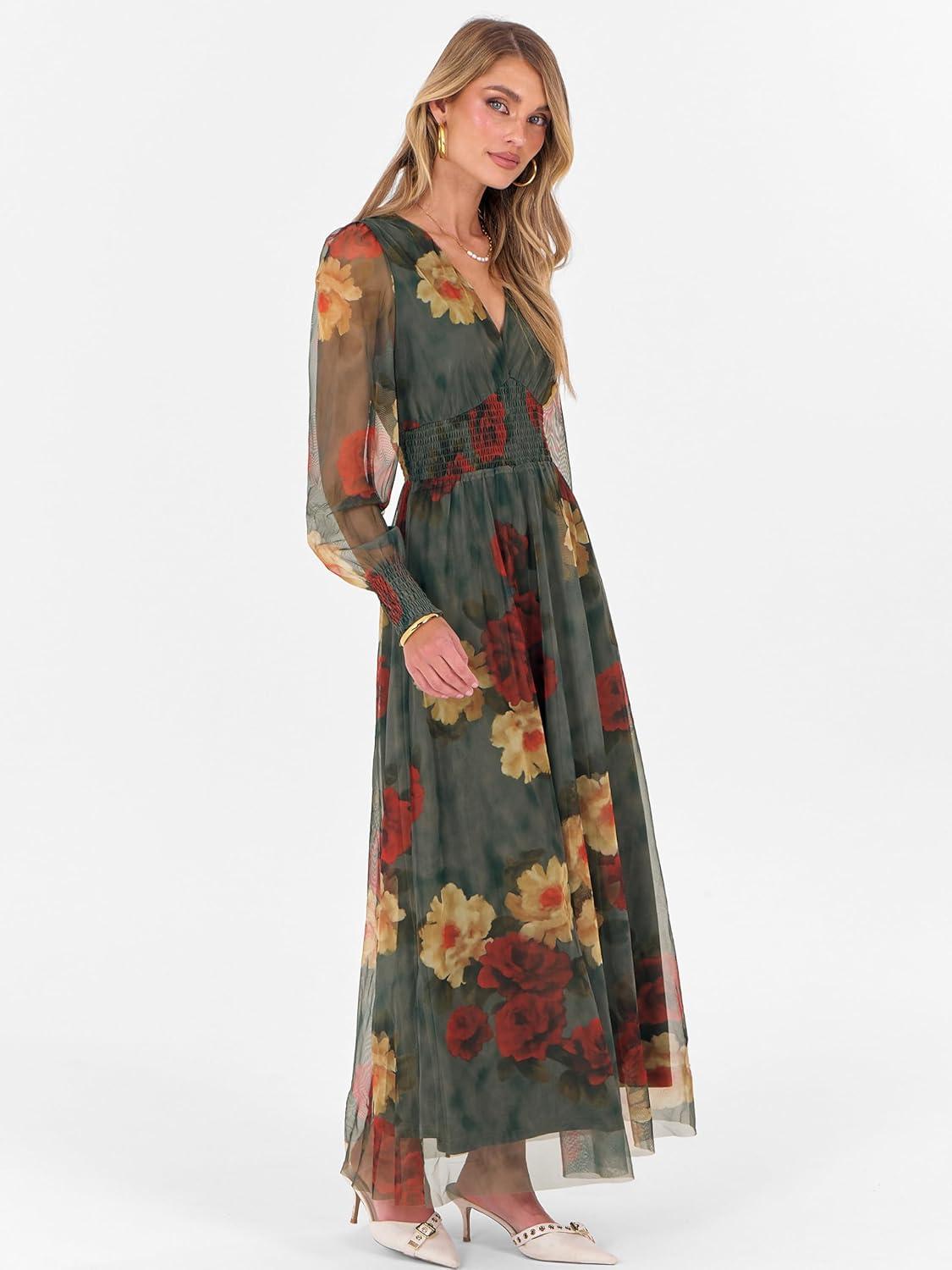 ANRABESS Women’s Floral Maxi Dress 2025 Fall V Neck Puff Long Sleeve Flowy Casual Wedding Guest Tee Party Tulle Dresses(Red and Yellow Rose)