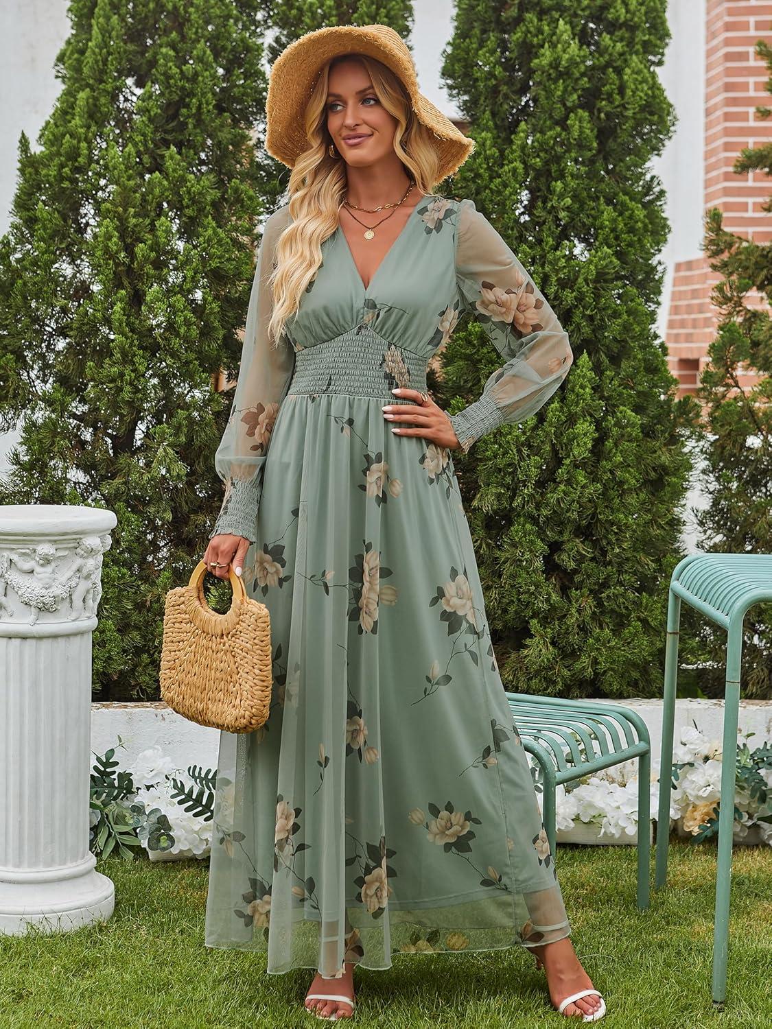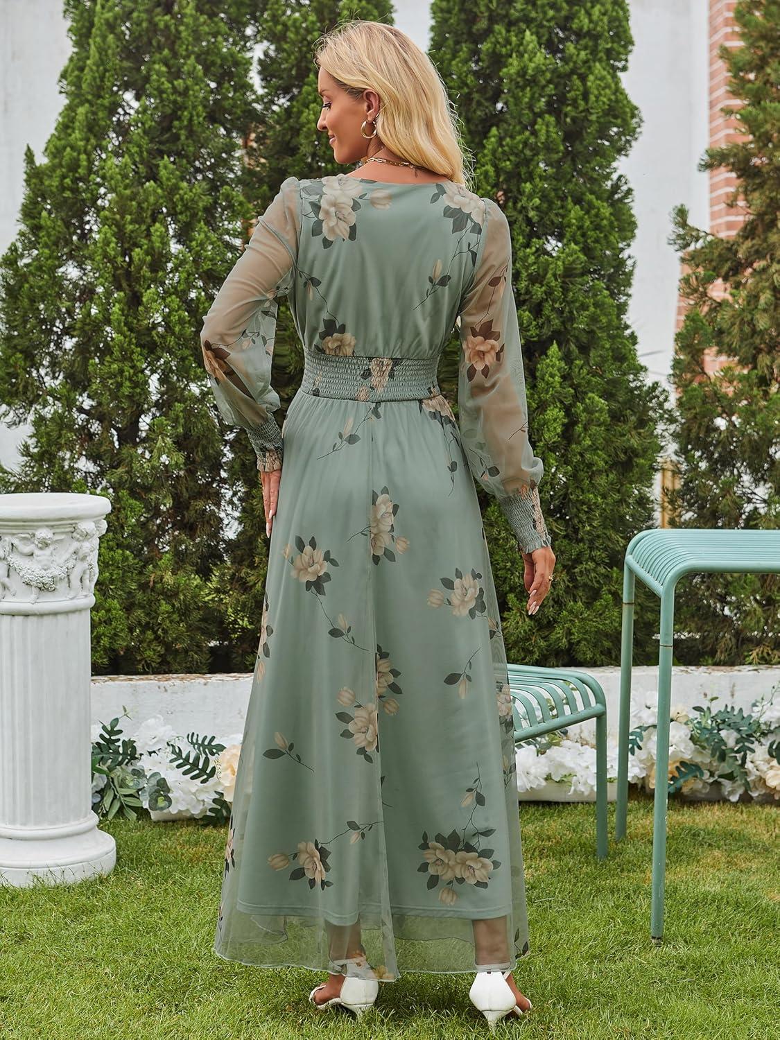 ANRABESS Women’s Floral Maxi Dress 2025 Fall V Neck Puff Long Sleeve Flowy Casual Wedding Guest Tee Party Tulle Dresses(Yellow Floral Green)