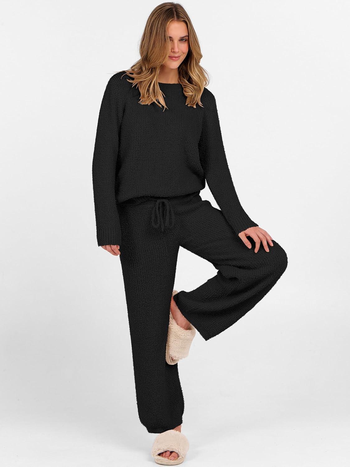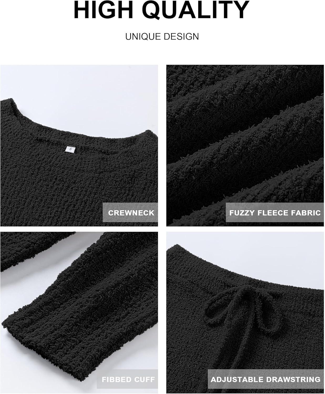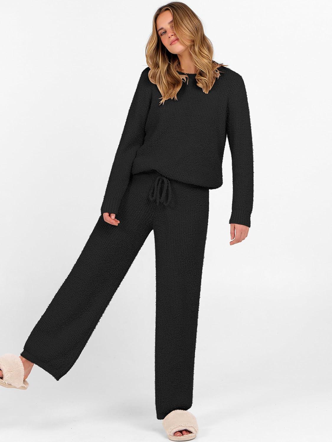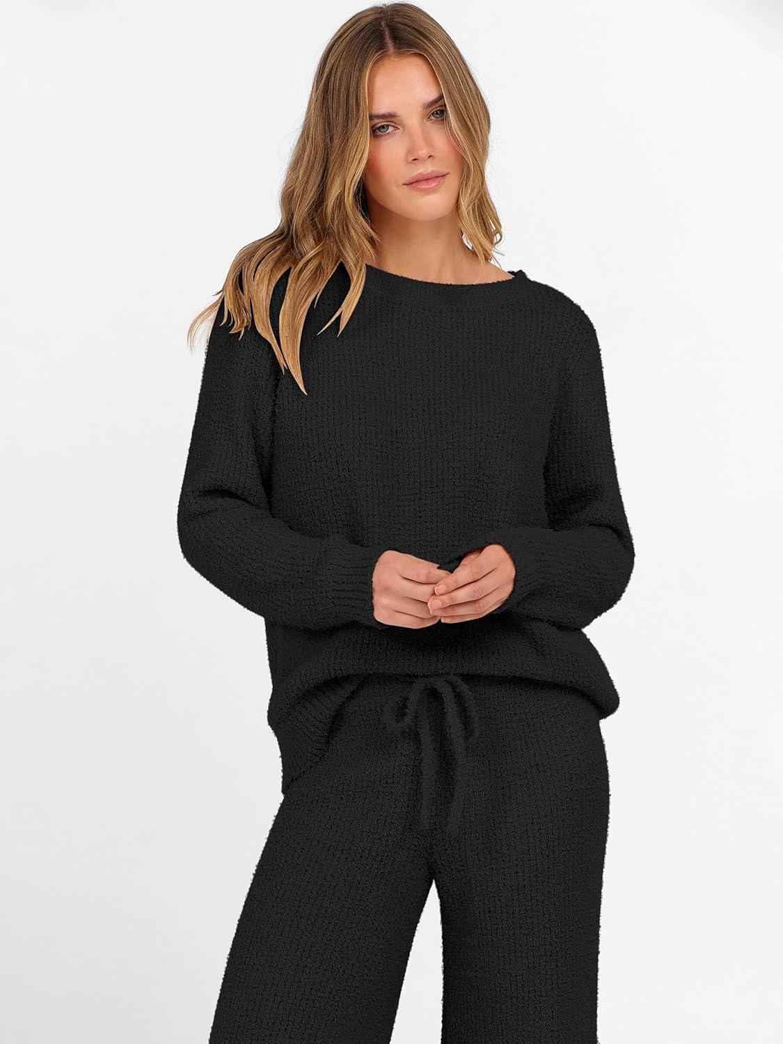 ANRABESS Womens Fuzzy Fleece Lounge Pajama Set 2 Piece Outfits Long Sleeve Top Sweater Pants Loungewear Pj Sets 2025 Fall(Black)