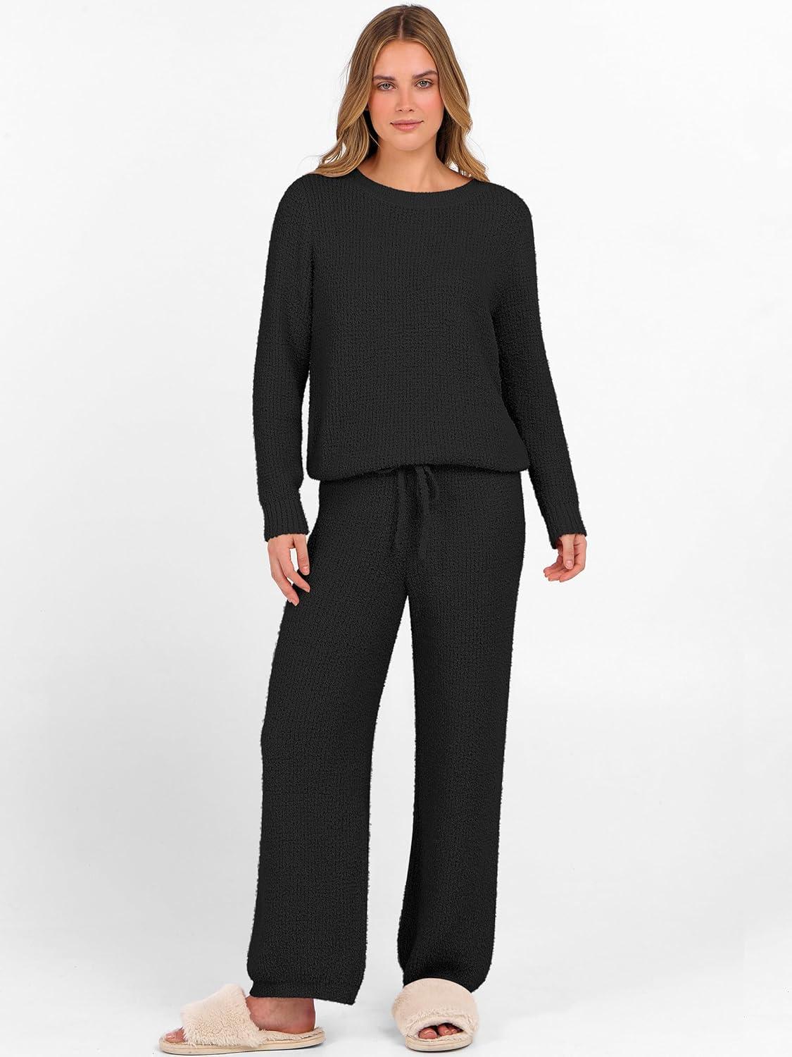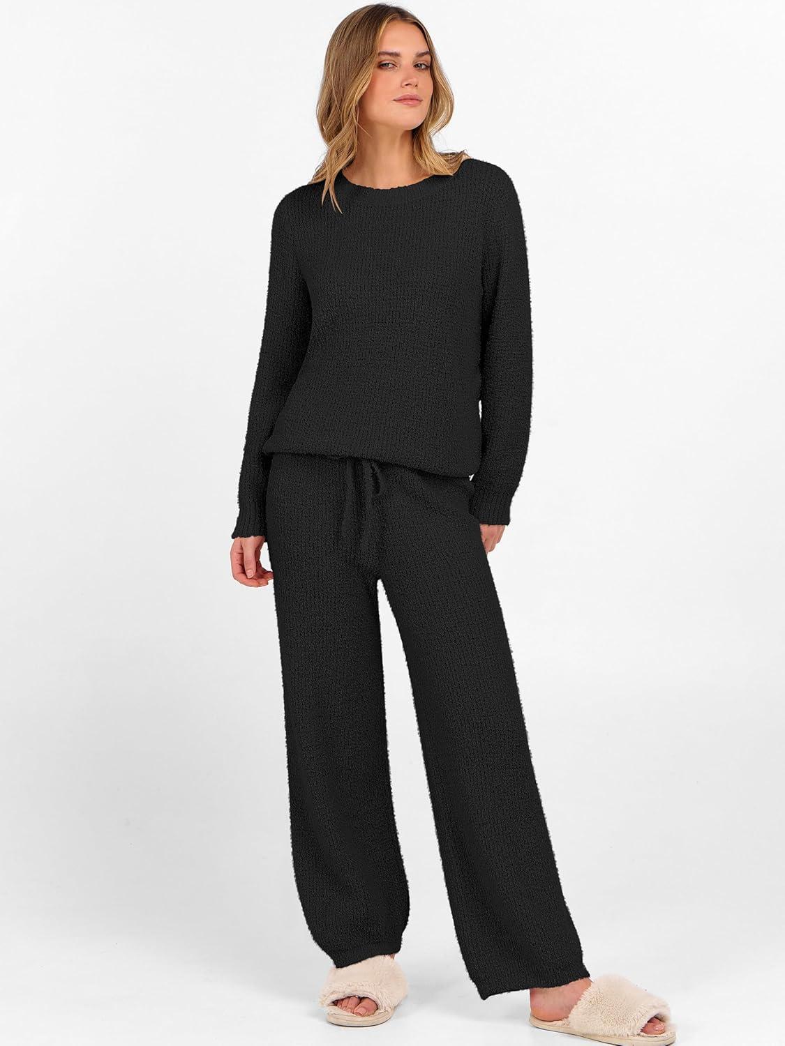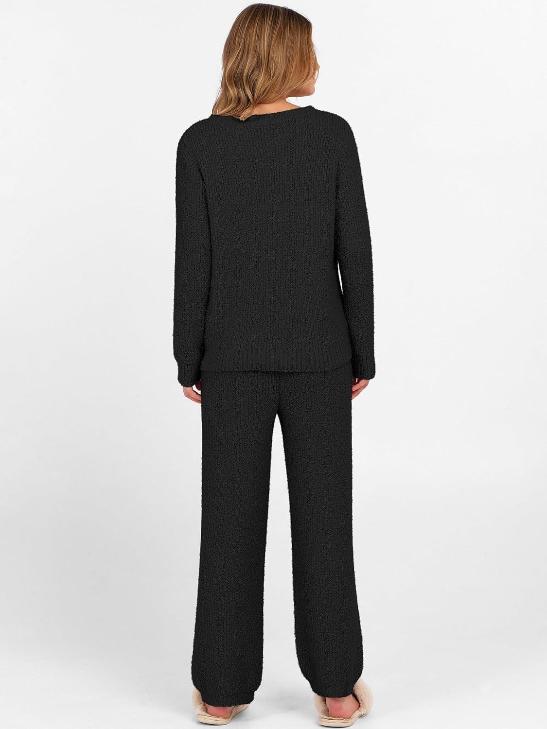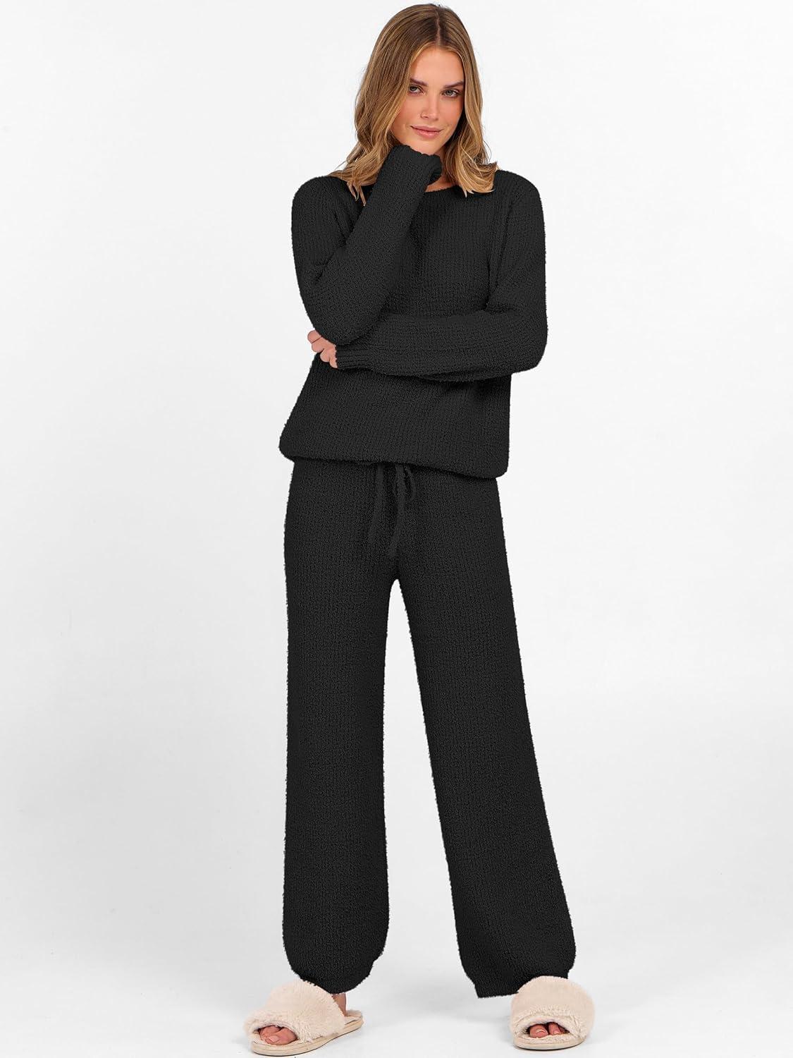ANRABESS Womens Fuzzy Fleece Lounge Pajama Set 2 Piece Outfits Long Sleeve Top Sweater Pants Loungewear Pj Sets 2025 Fall(Black)