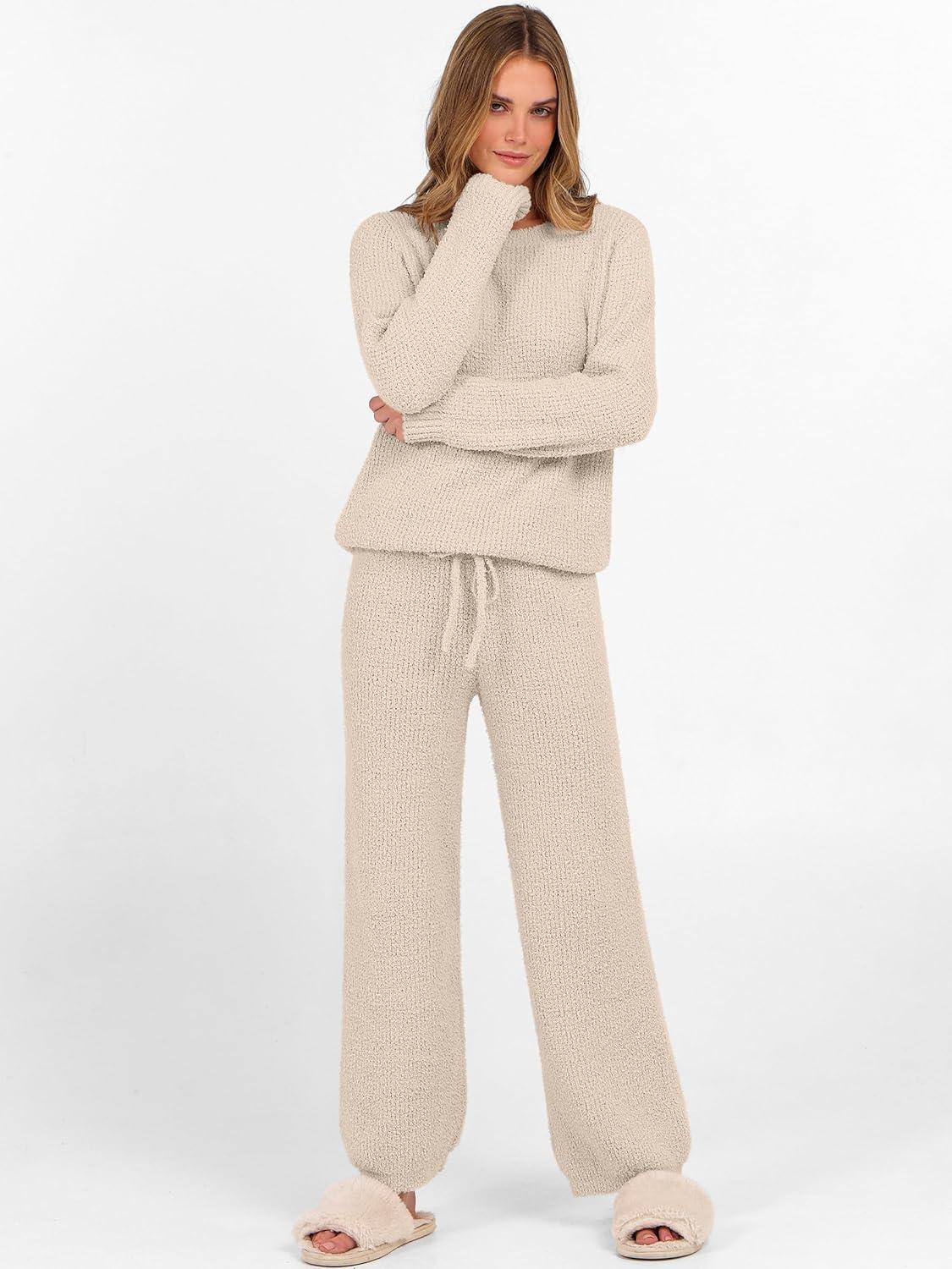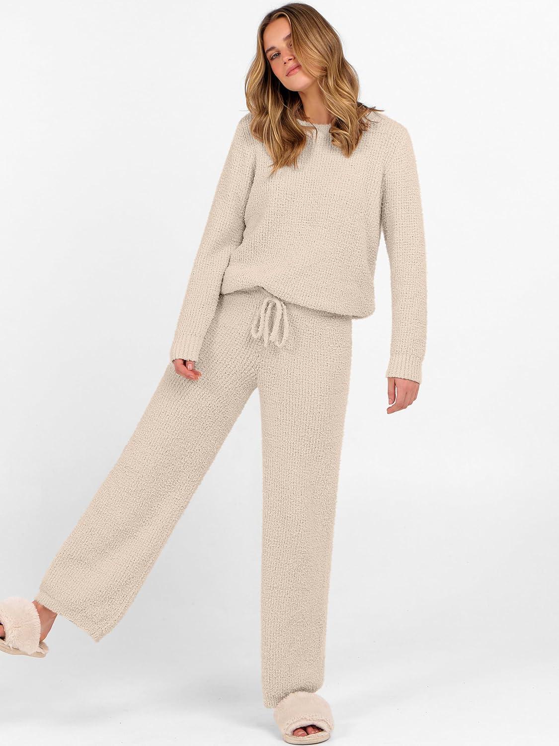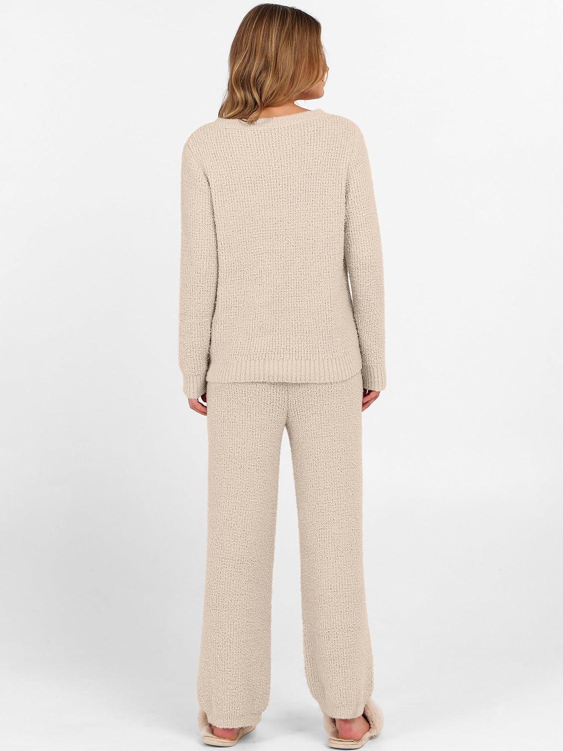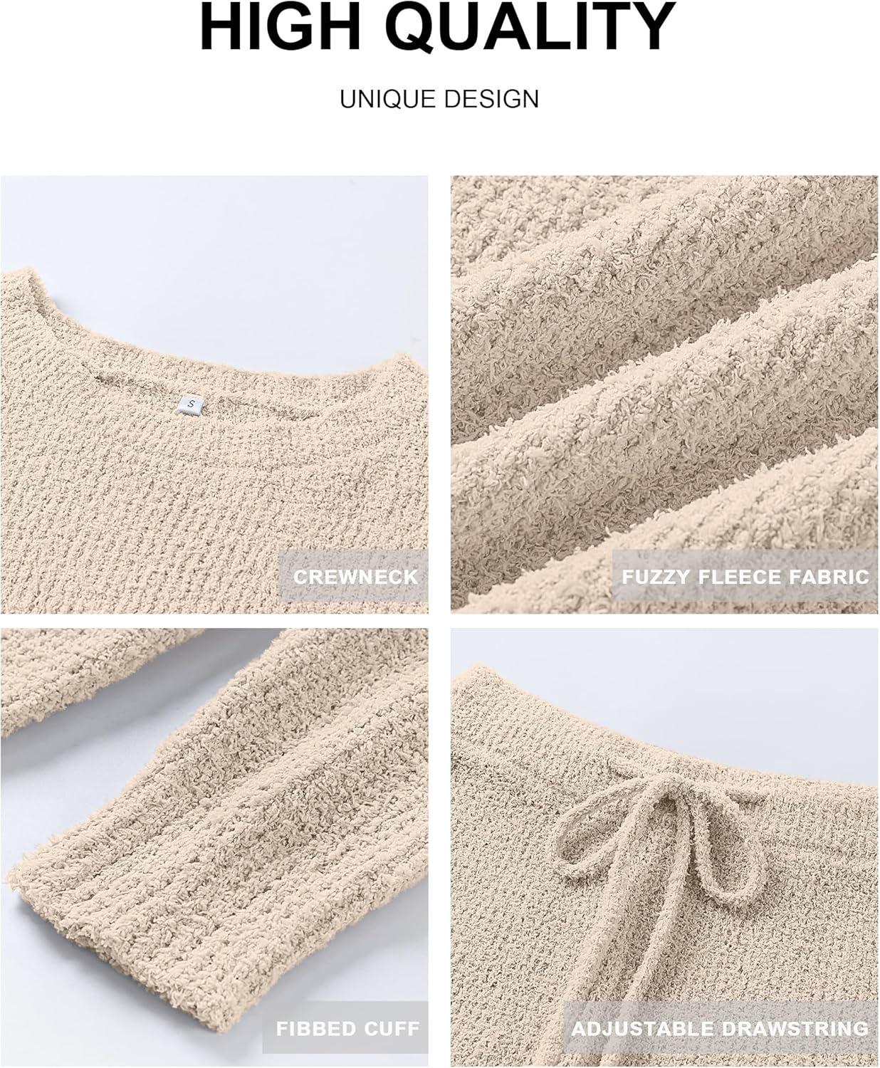 ANRABESS Womens Fuzzy Fleece Lounge Pajama Set 2 Piece Outfits Long Sleeve Top Sweater Pants Loungewear Pj Sets 2025 Fall(Light Khaki)