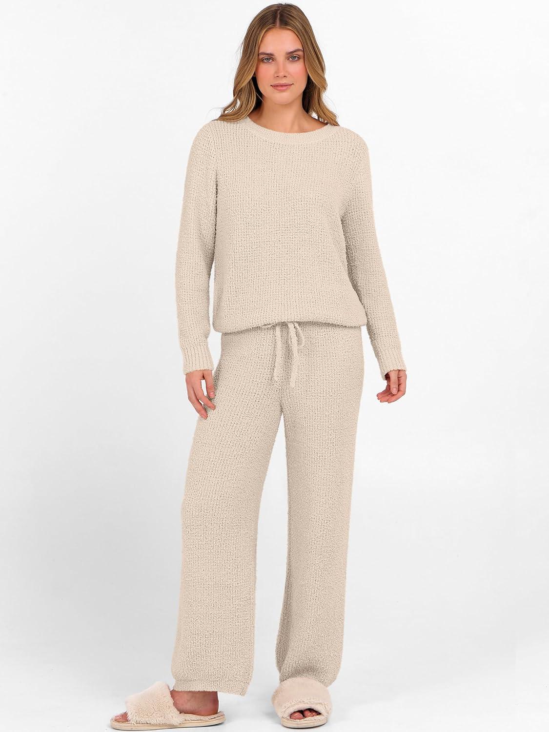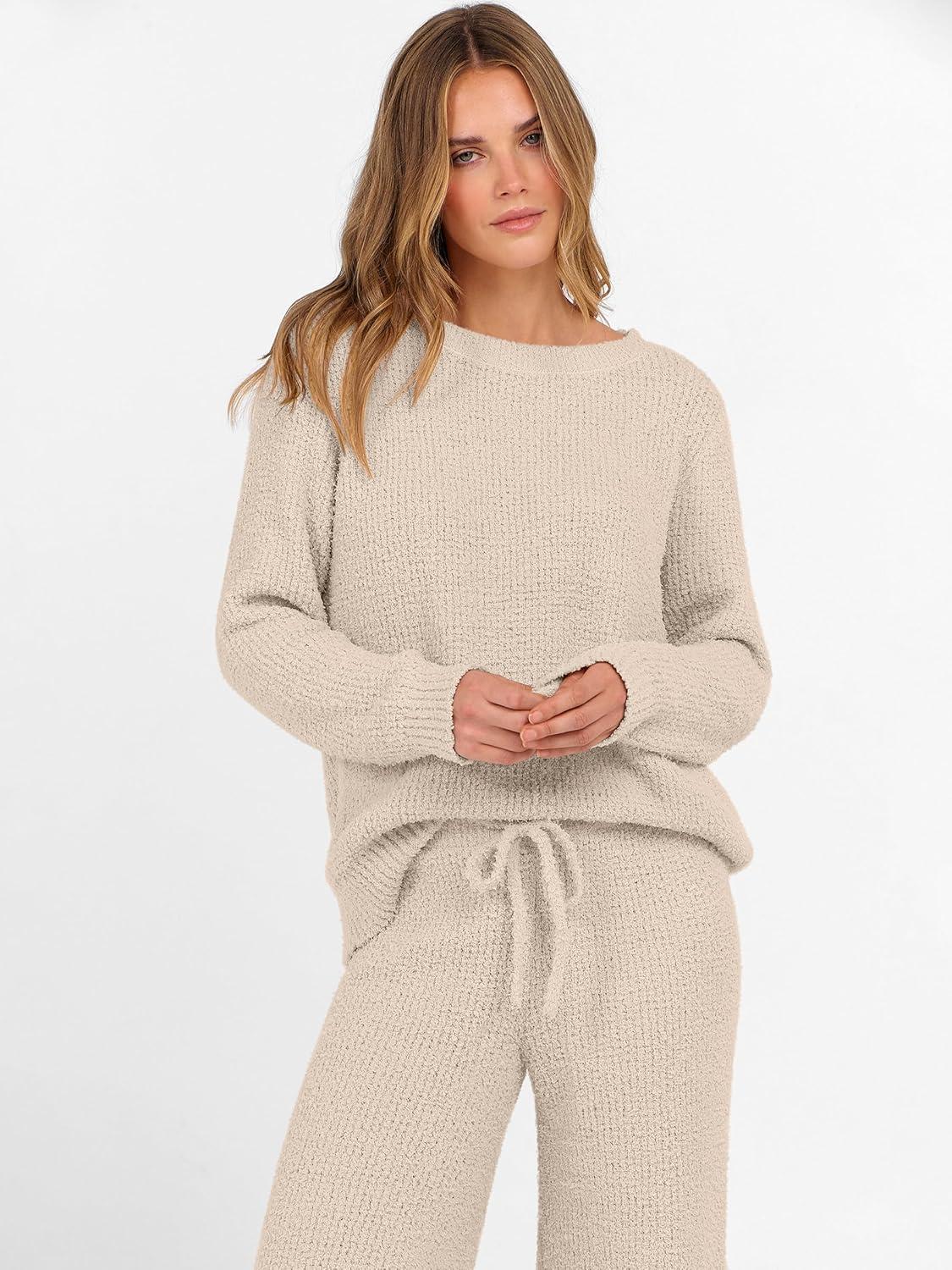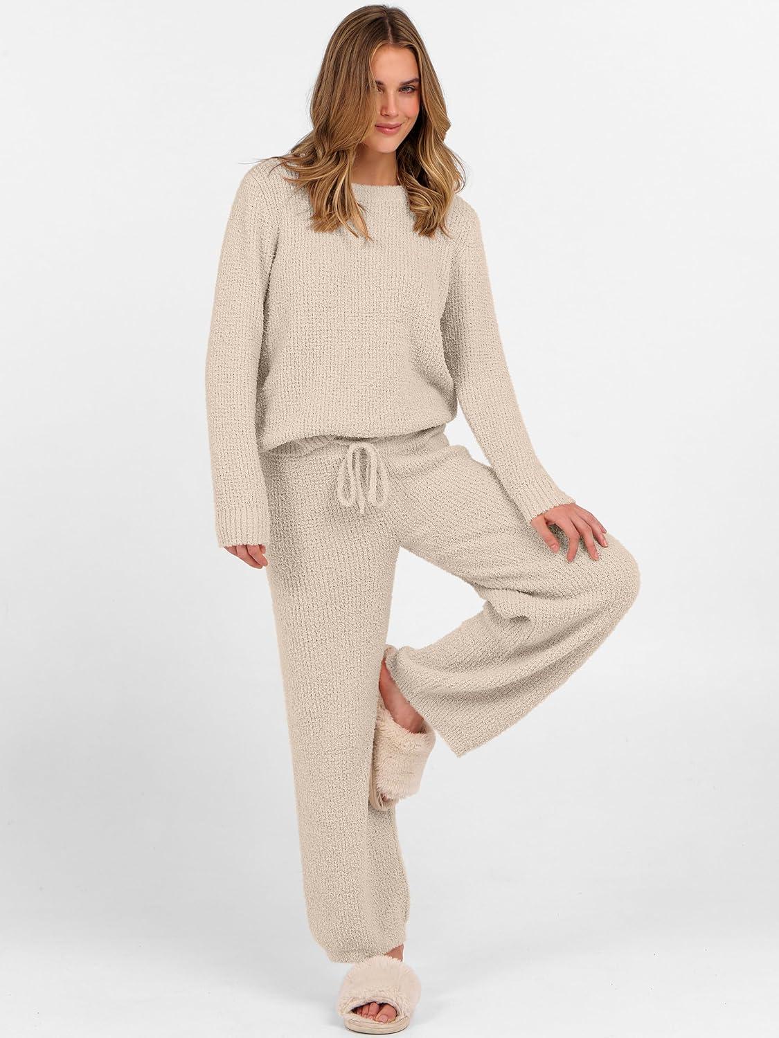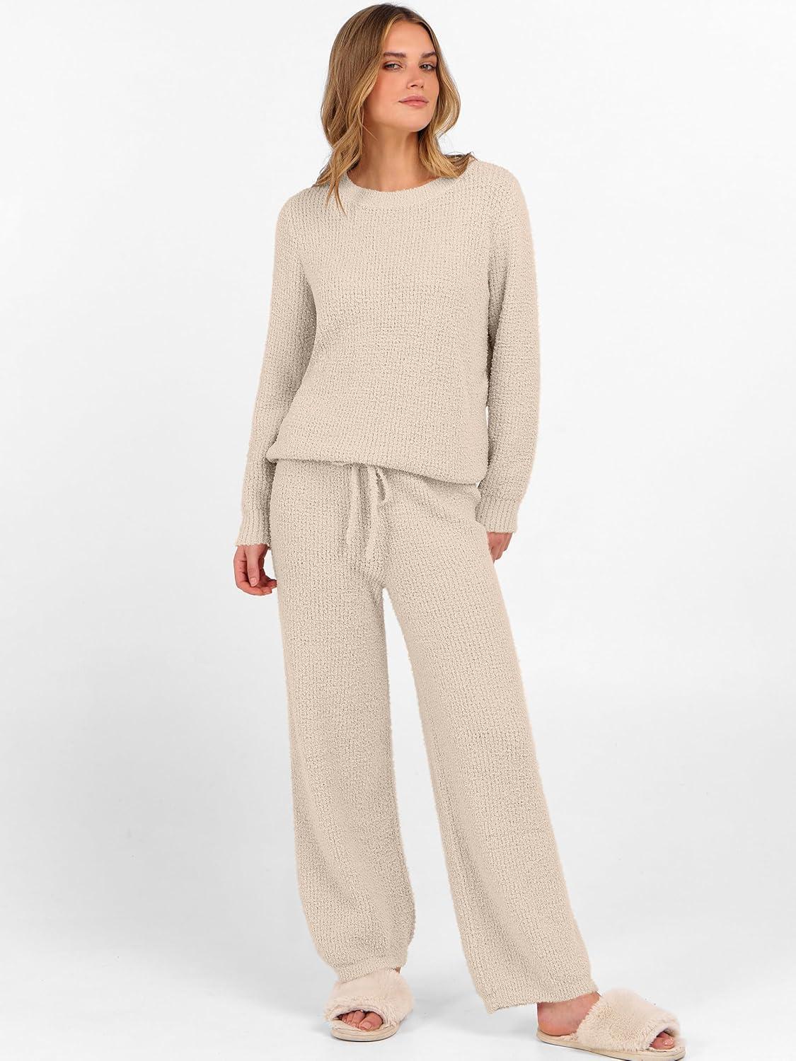 ANRABESS Womens Fuzzy Fleece Lounge Pajama Set 2 Piece Outfits Long Sleeve Top Sweater Pants Loungewear Pj Sets 2025 Fall(Light Khaki)