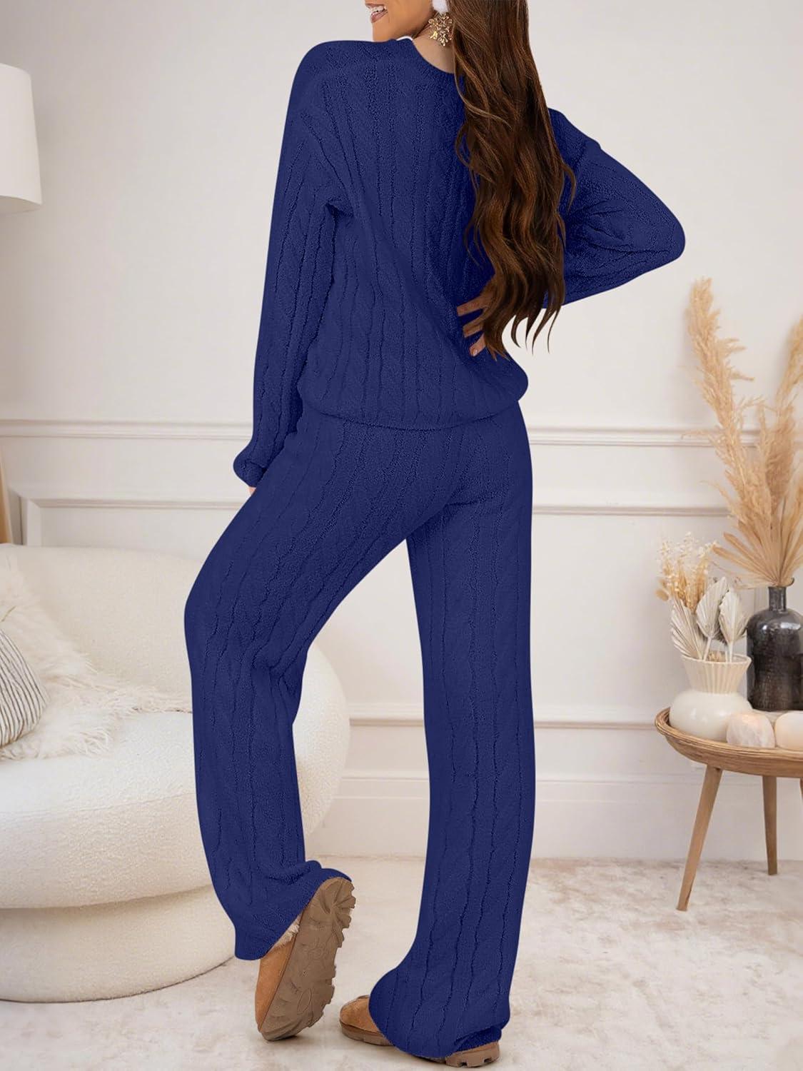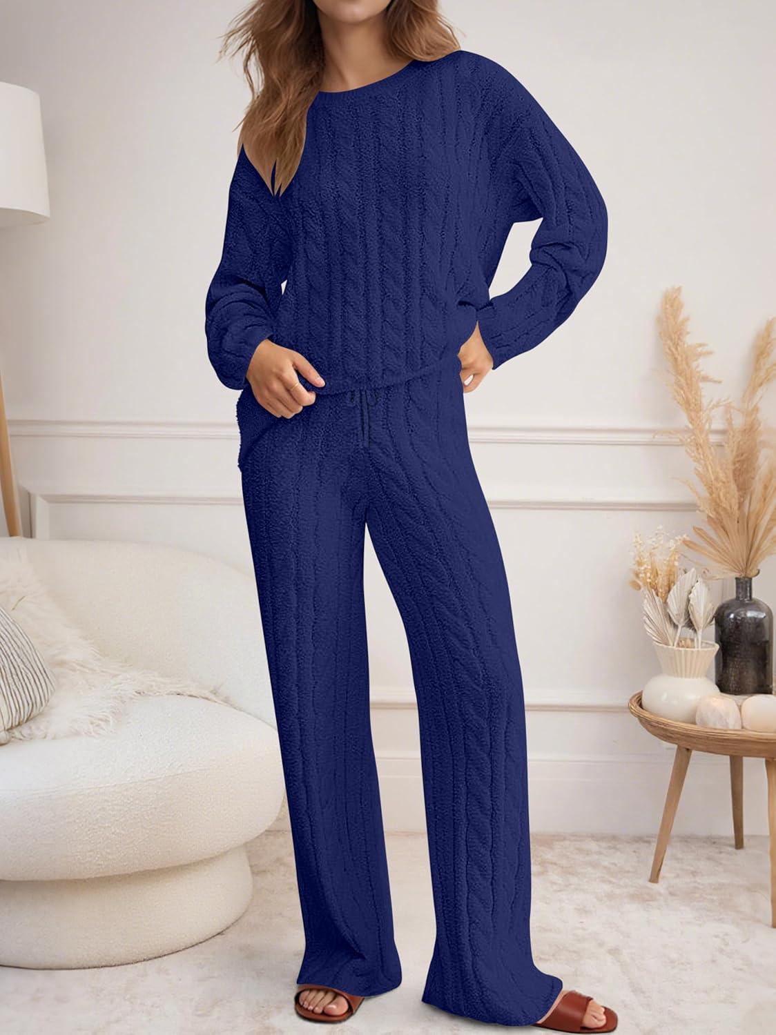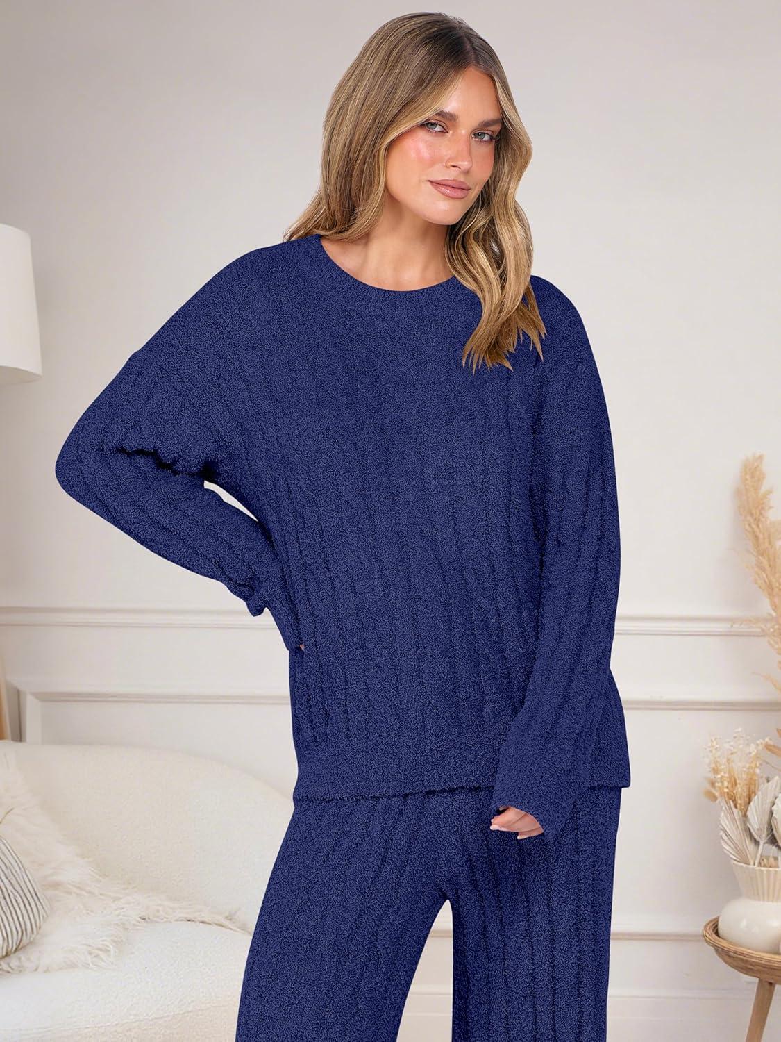 ANRABESS Women’s Fuzzy Fleece Pajama Set 2 Piece Outfits Lounge Knit Oversized Sweater Pj Sets 2025 Fall Winter Loungewear(Navy Blue)