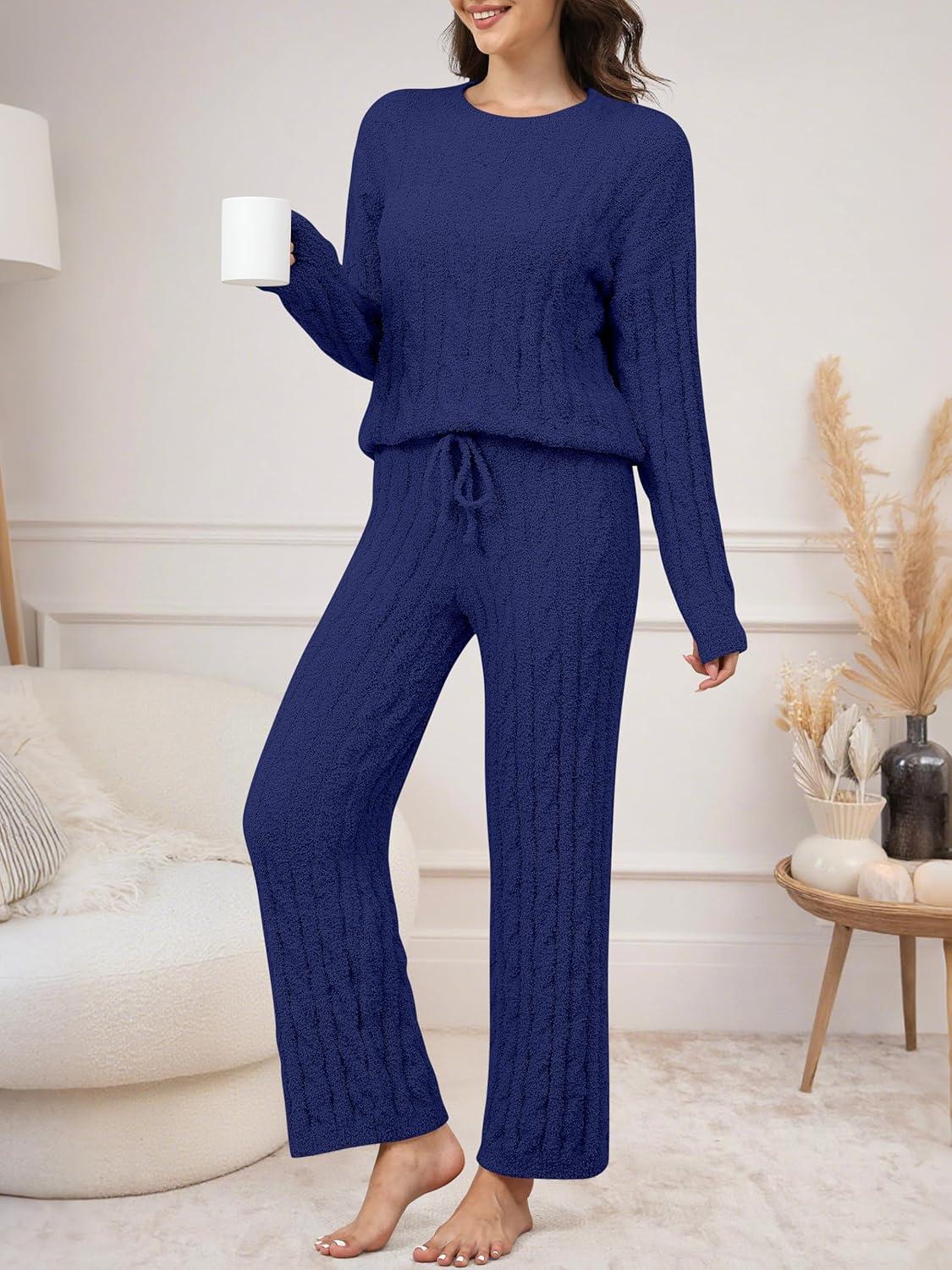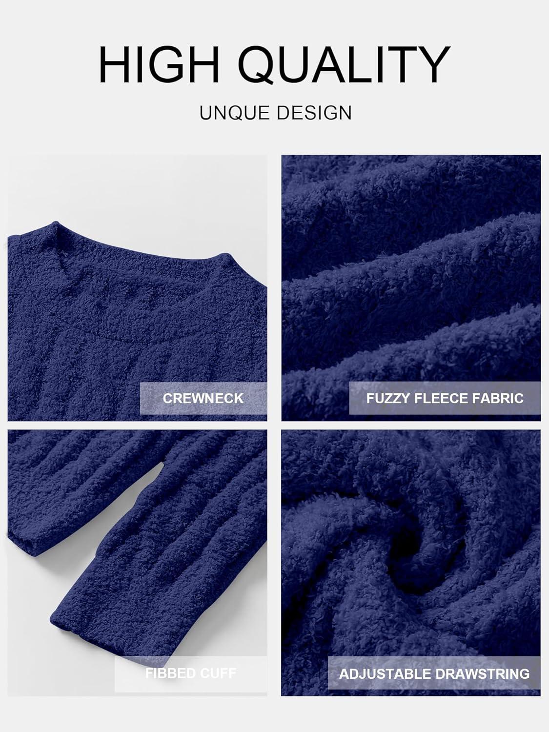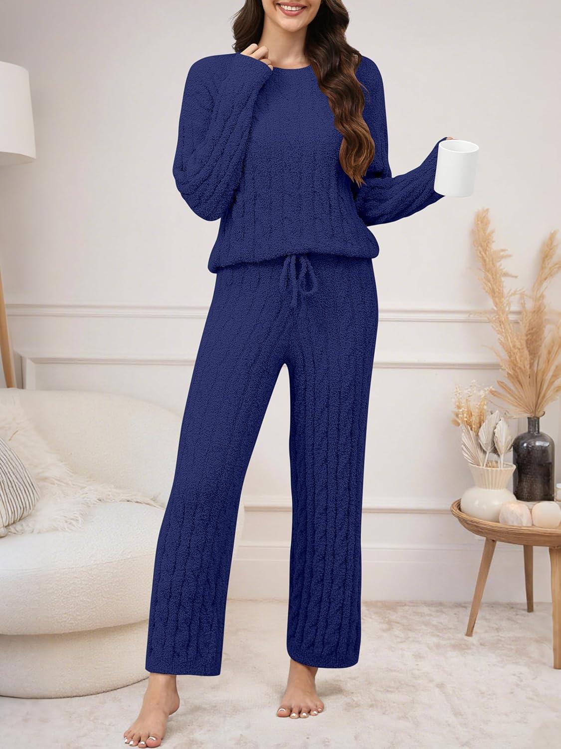 ANRABESS Women’s Fuzzy Fleece Pajama Set 2 Piece Outfits Lounge Knit Oversized Sweater Pj Sets 2025 Fall Winter Loungewear(Navy Blue)
