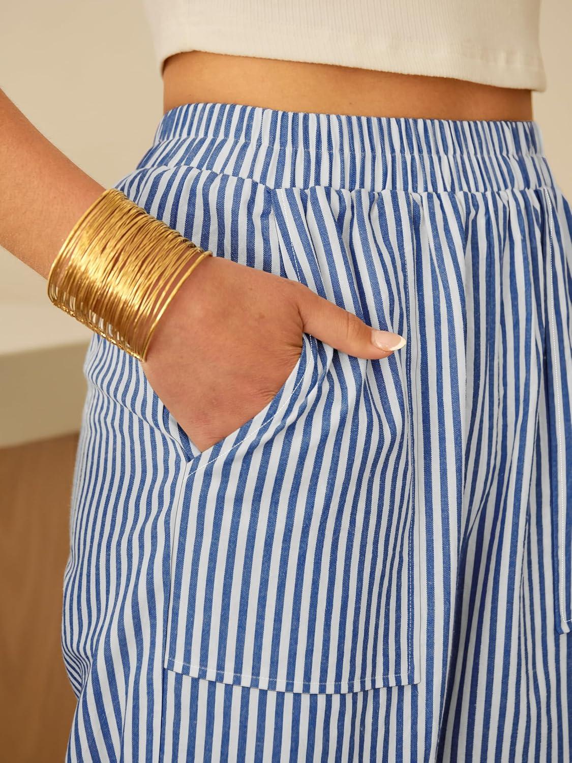 ANRABESS Womens Gingham Striped Palazzo Pants Wide Leg Pajama Lounge Crop Pants Plaid PJ Bottoms Cute Trousers with Pockets(Blue White Stripe)