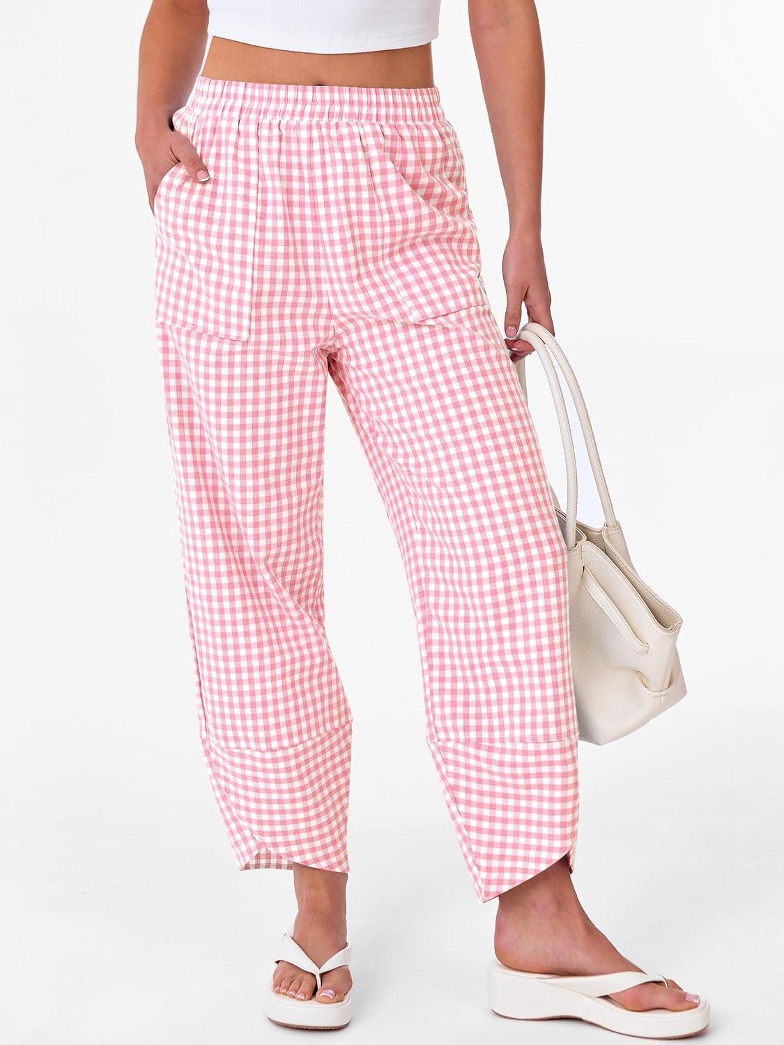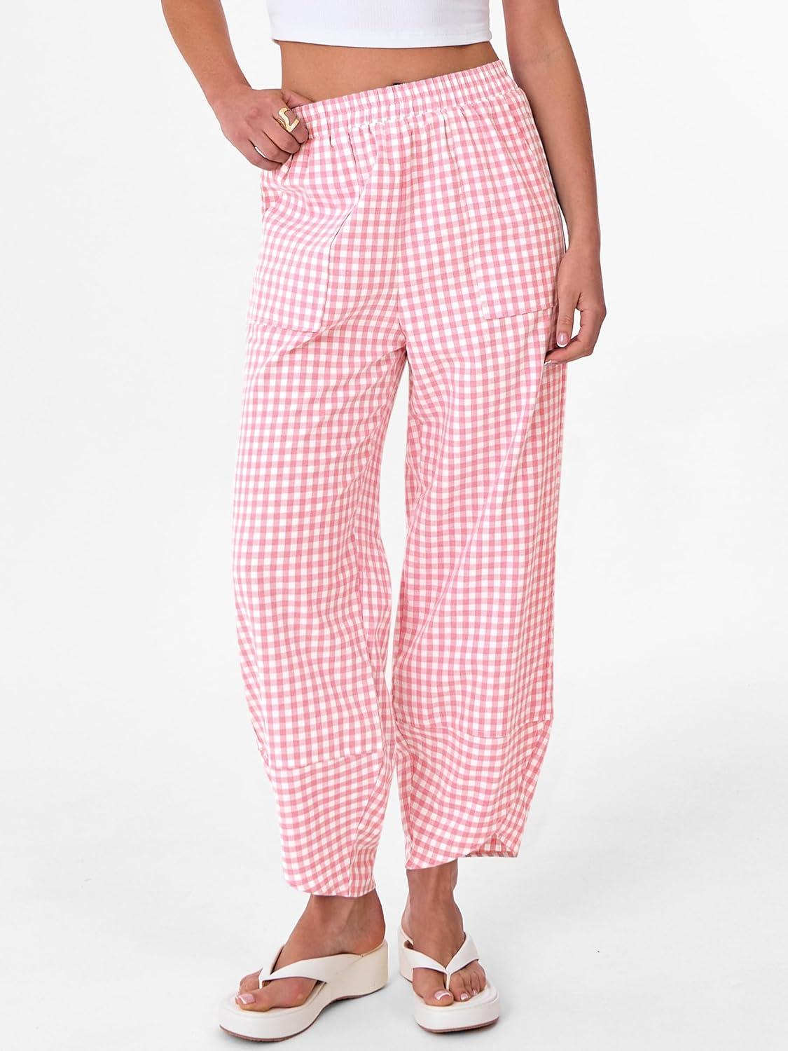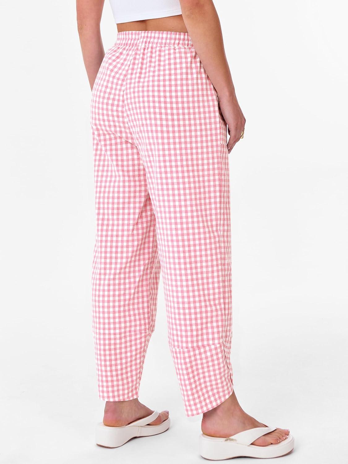 ANRABESS Womens Gingham Striped Palazzo Pants Wide Leg Pajama Lounge Crop Pants Plaid PJ Bottoms Cute Trousers with Pockets(Pink White Plaid)