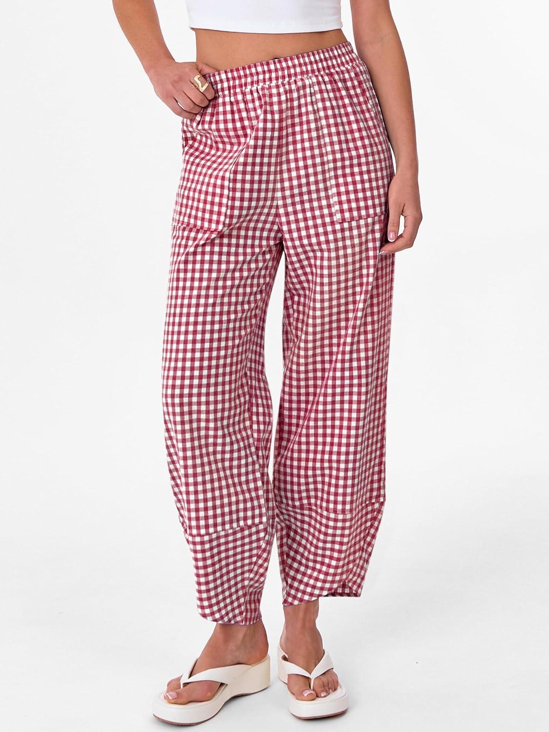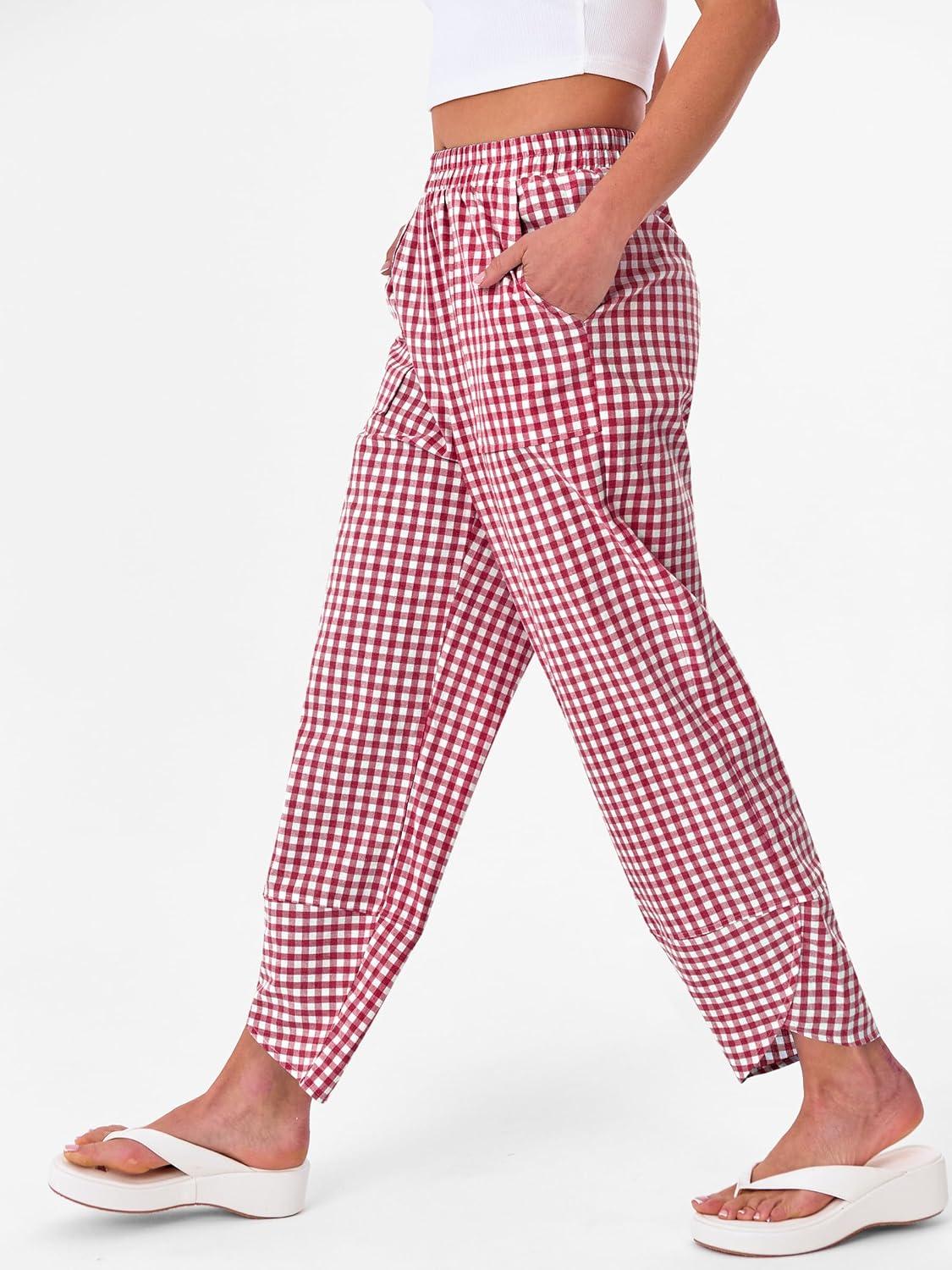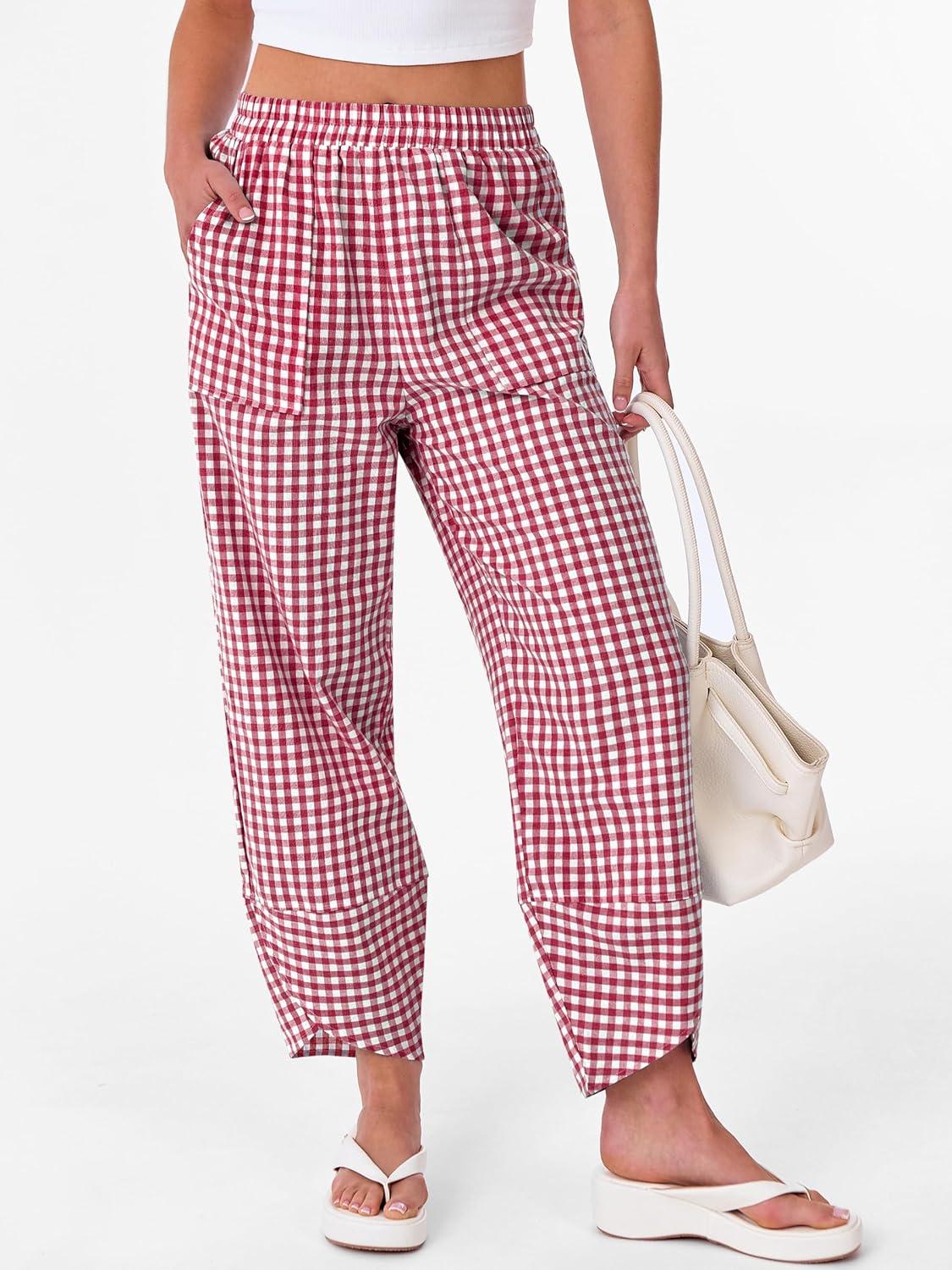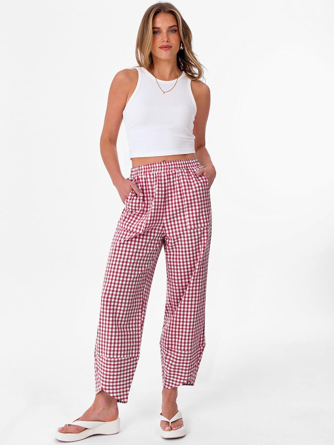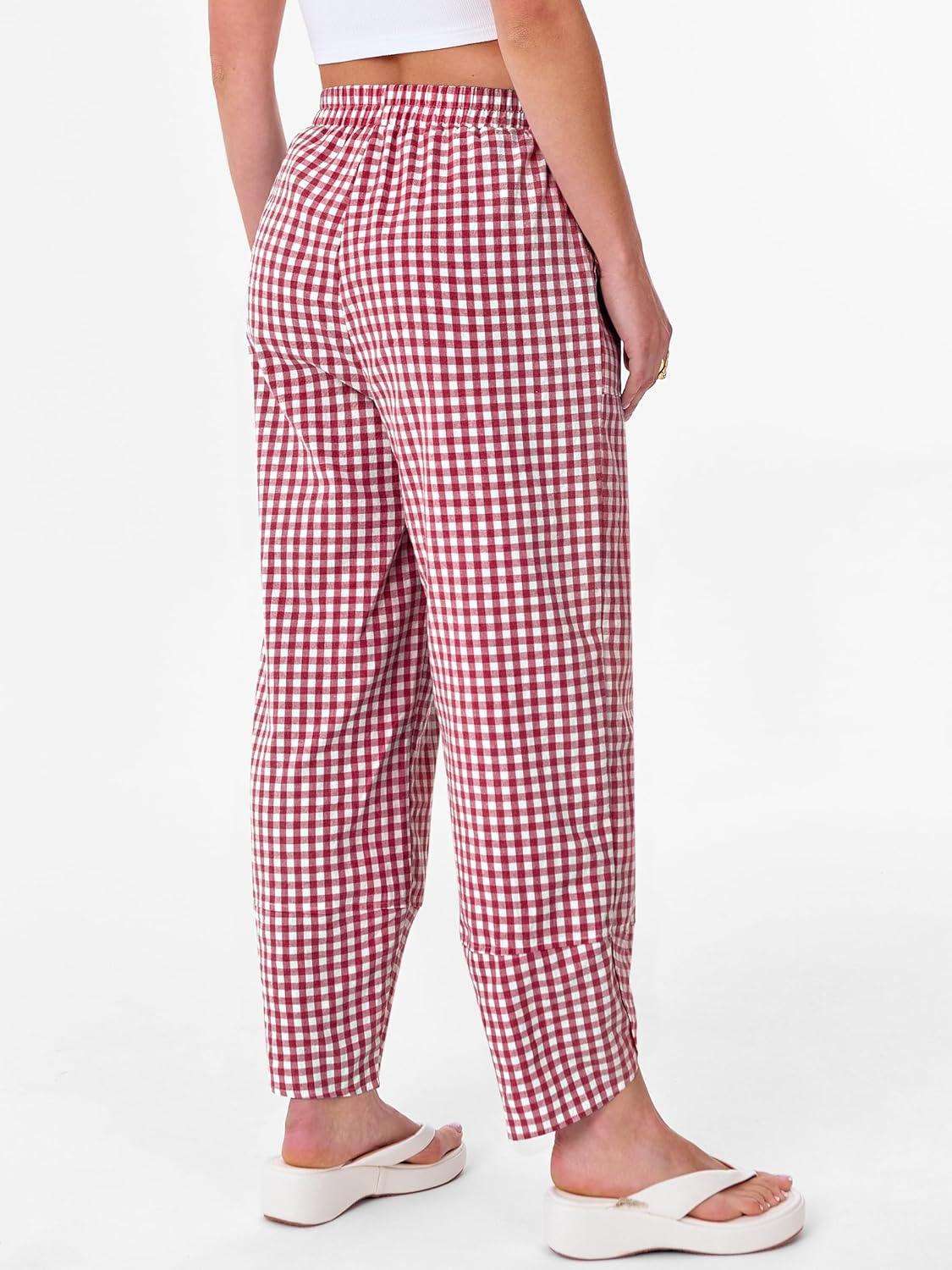 ANRABESS Womens Gingham Striped Palazzo Pants Wide Leg Pajama Lounge Crop Pants Plaid PJ Bottoms Cute Trousers with Pockets(Red White Plaid)