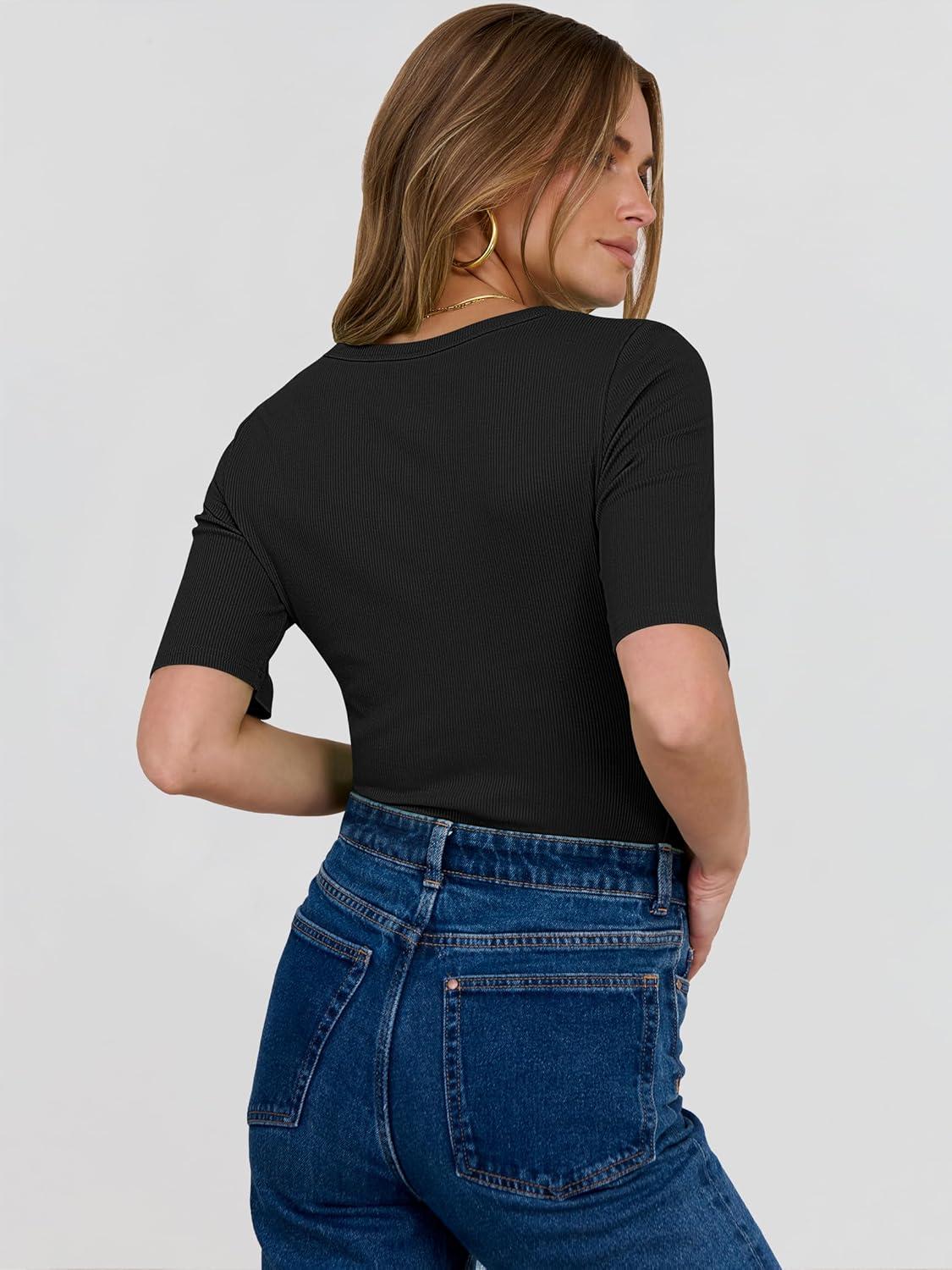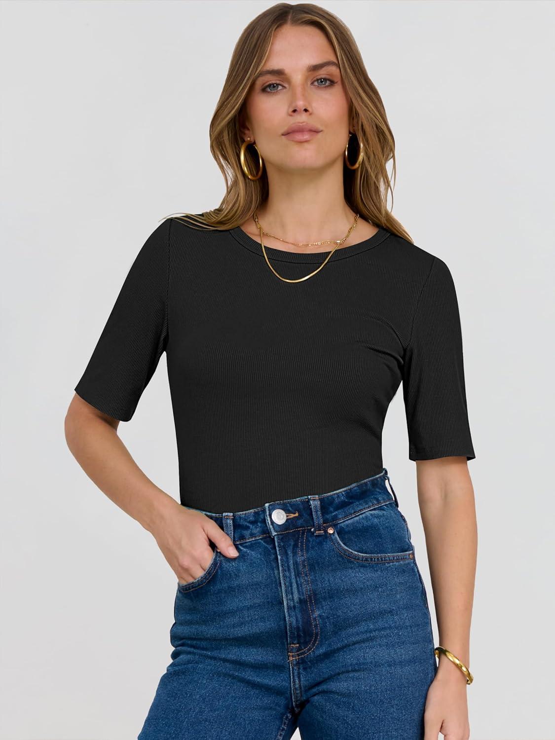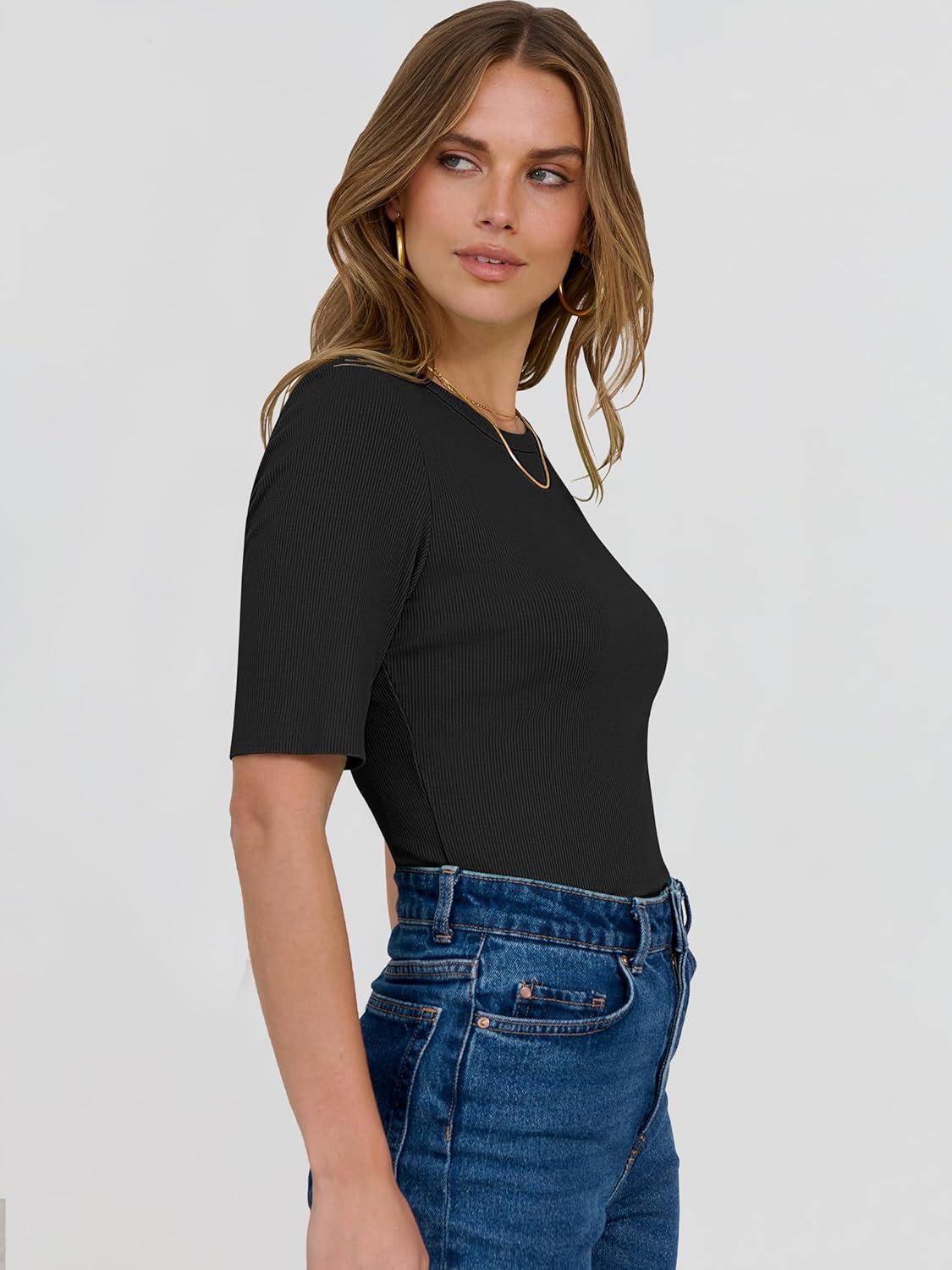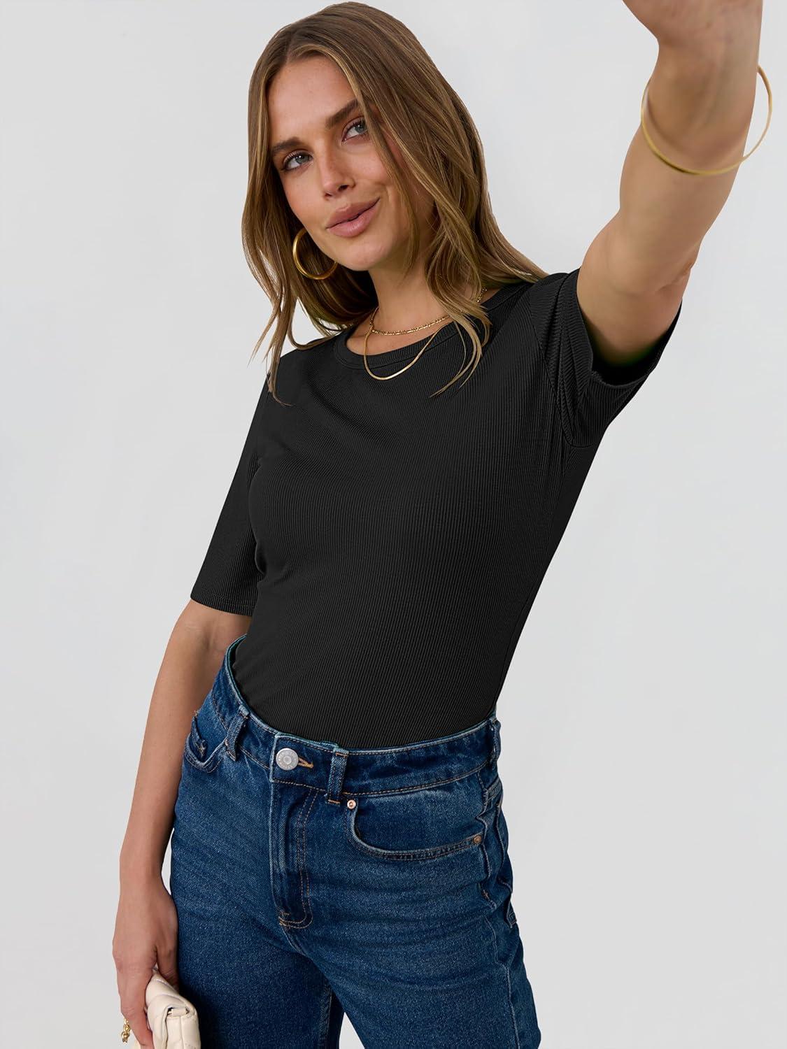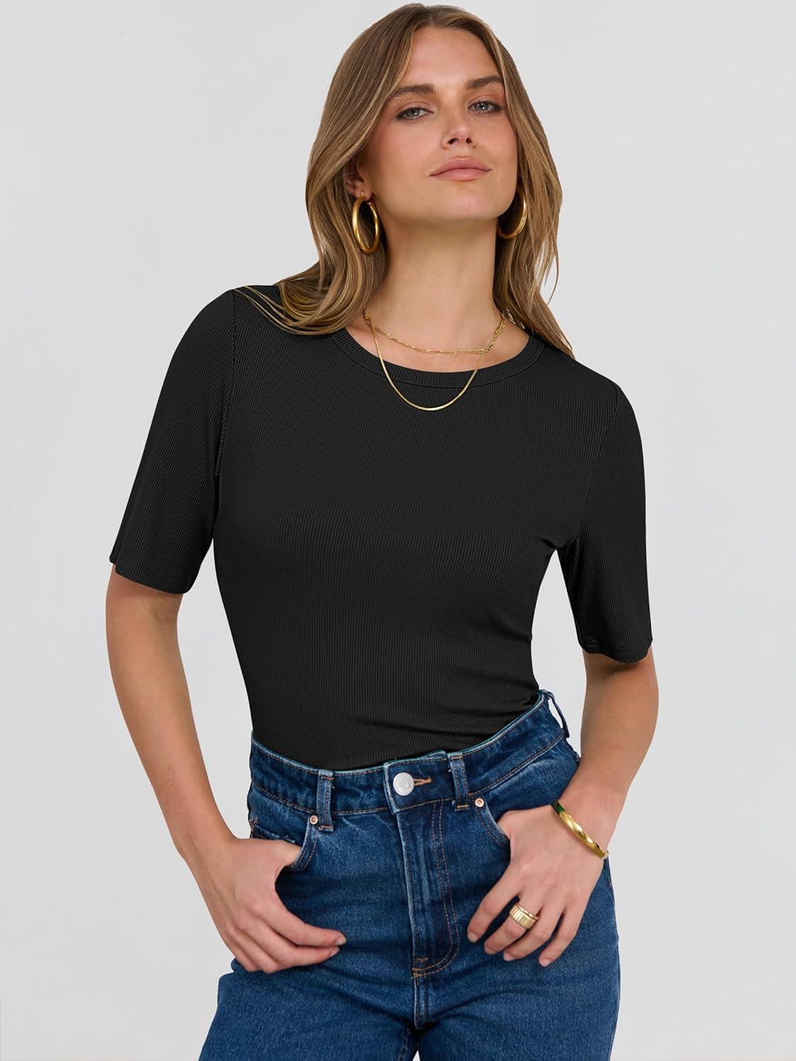 ANRABESS Womens Half Sleeve Crewneck Tops Ribbed Knit Slim Fit Shirts Basic Tee 2025 Spring Summer Dressy Casual T-Shirts(Black)