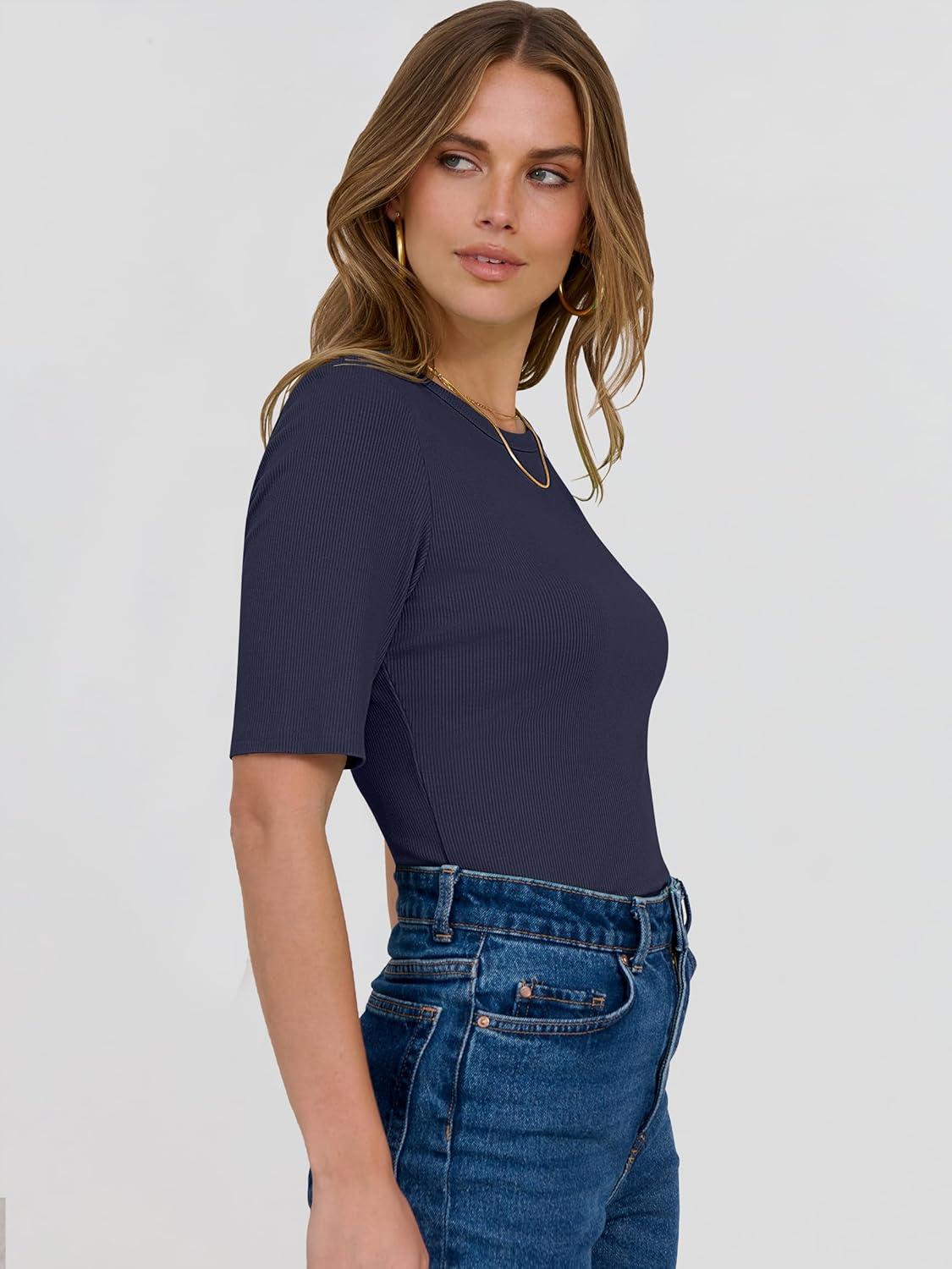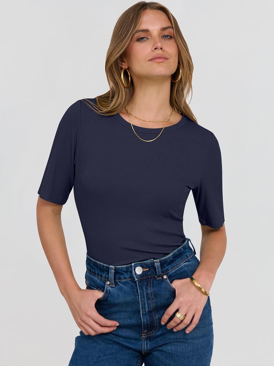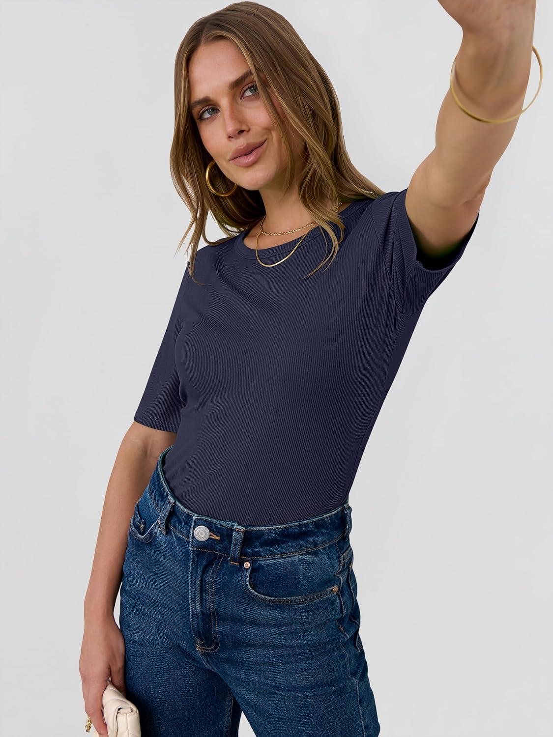 ANRABESS Womens Half Sleeve Crewneck Tops Ribbed Knit Slim Fit Shirts Basic Tee 2025 Spring Summer Dressy Casual T-Shirts(Navy Blue)
