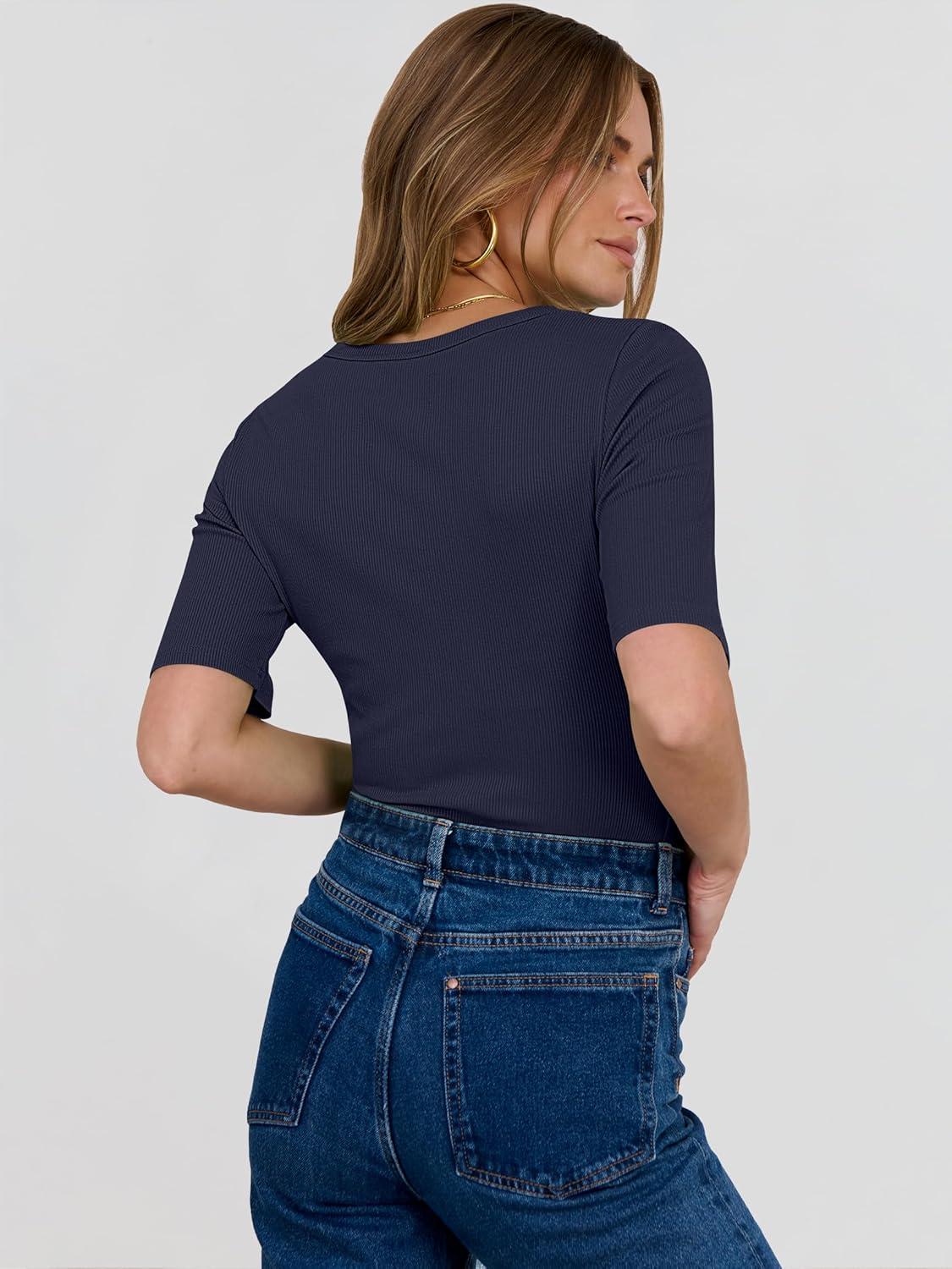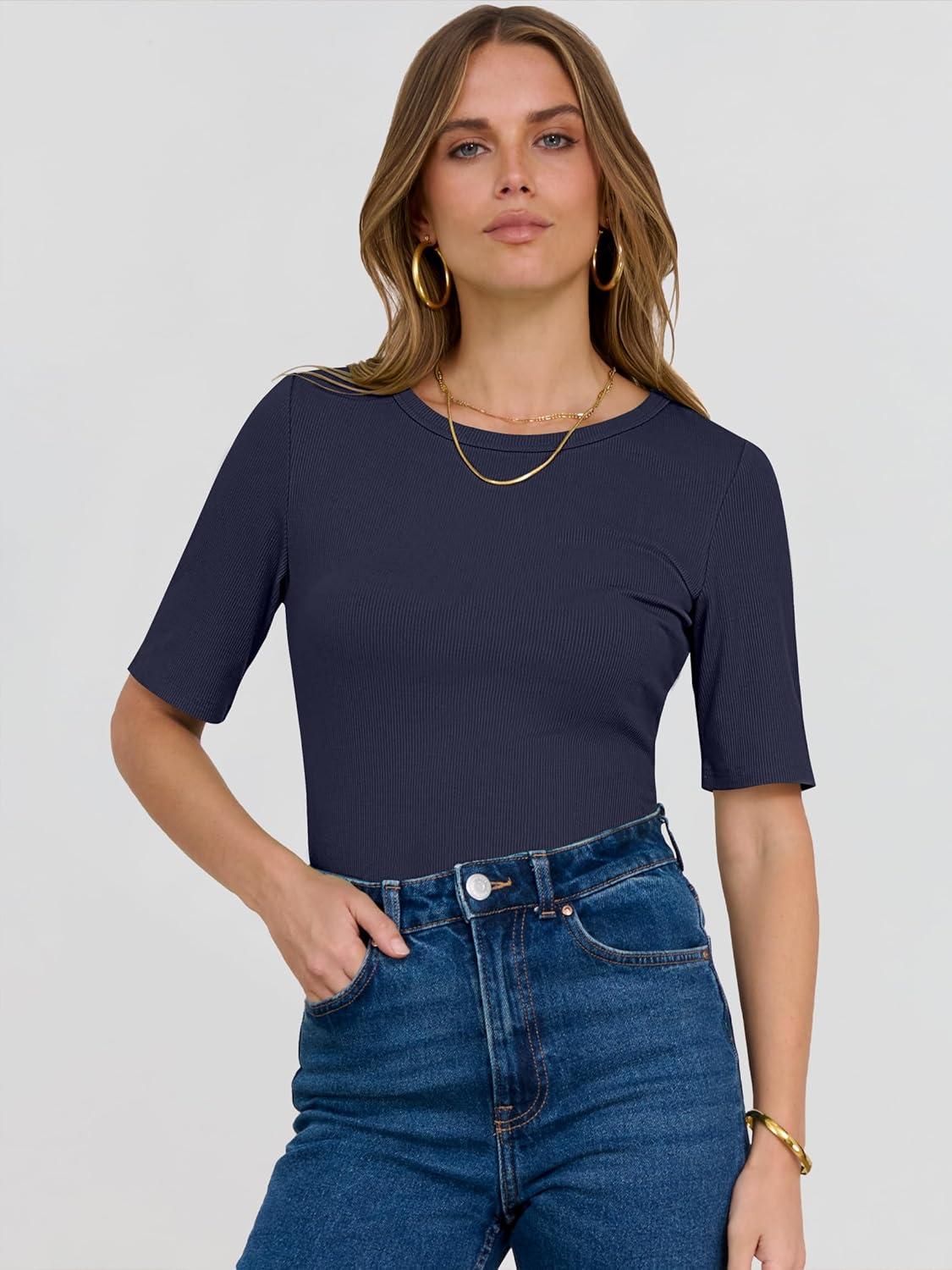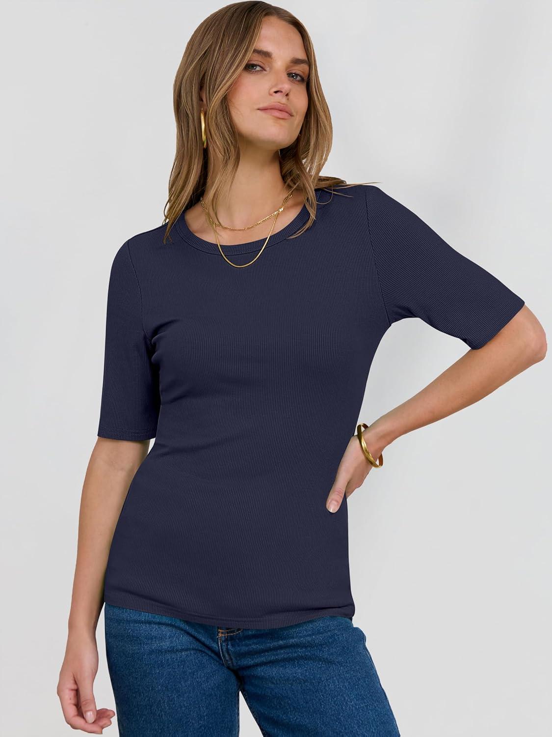 ANRABESS Womens Half Sleeve Crewneck Tops Ribbed Knit Slim Fit Shirts Basic Tee 2025 Spring Summer Dressy Casual T-Shirts(Navy Blue)