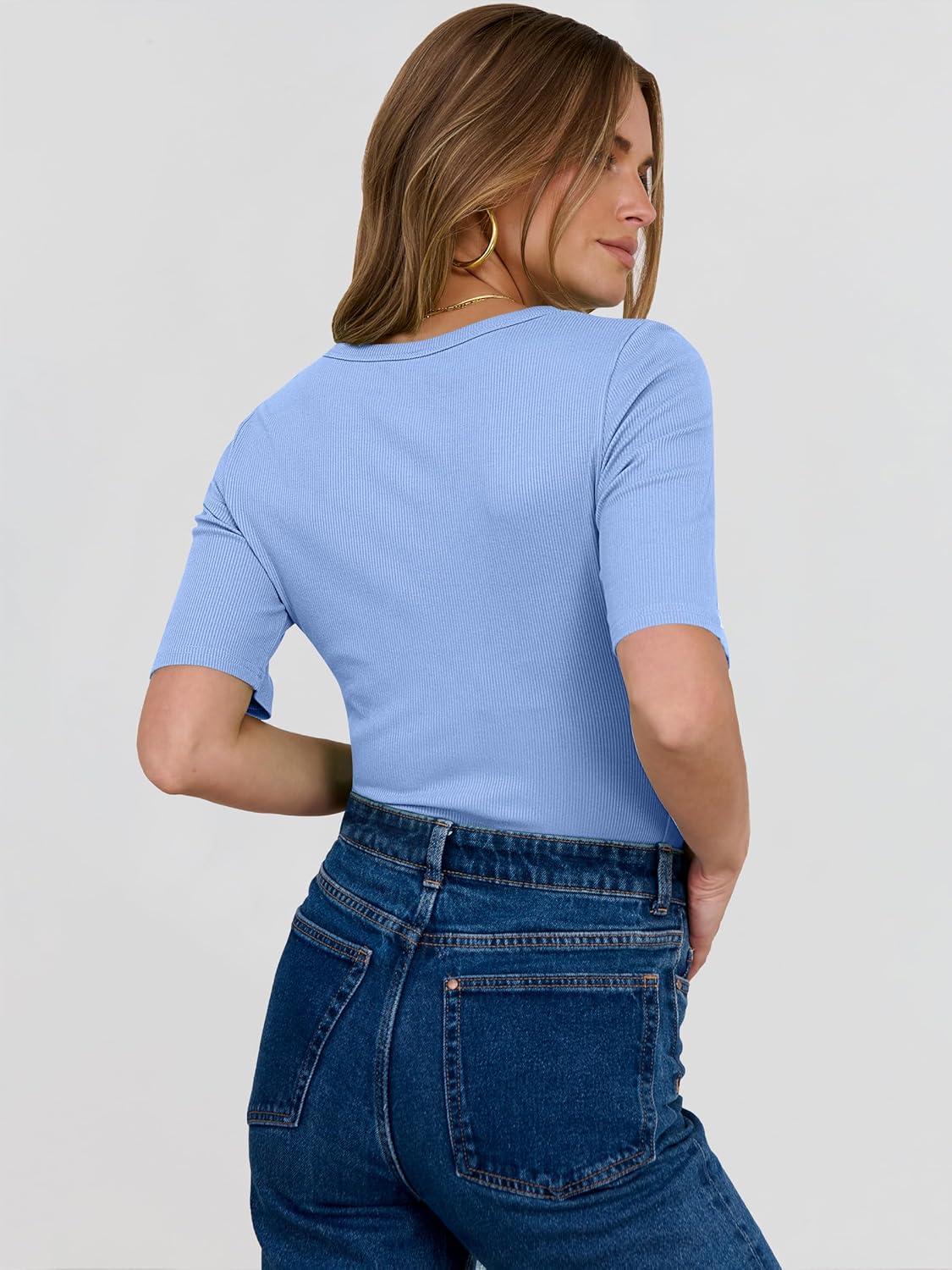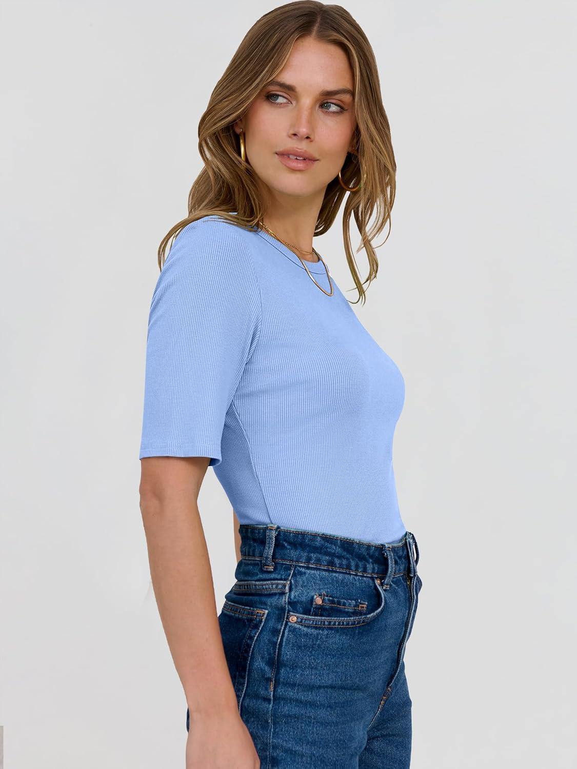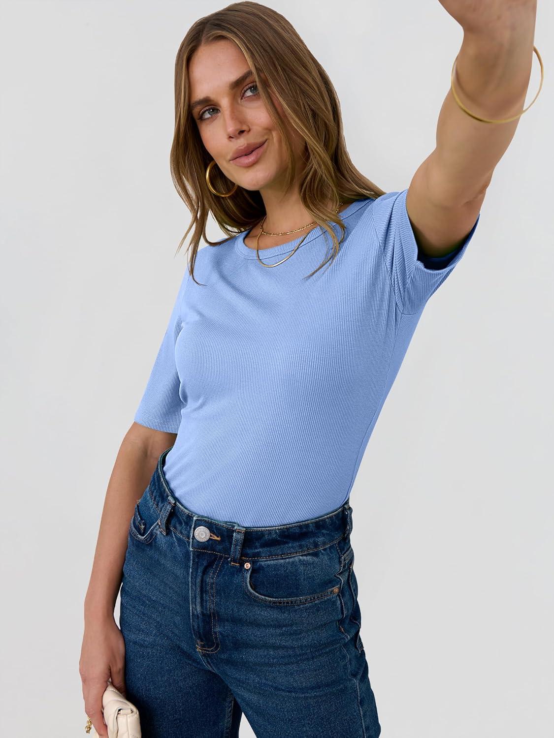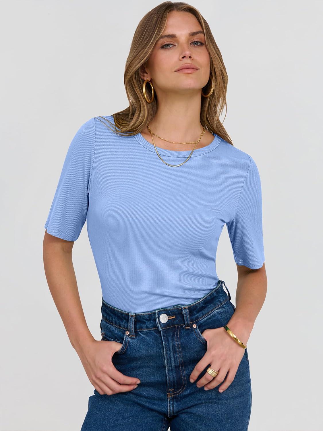 ANRABESS Womens Half Sleeve Crewneck Tops Ribbed Knit Slim Fit Shirts Basic Tee 2025 Spring Summer Dressy Casual T-Shirts(Sky Blue)