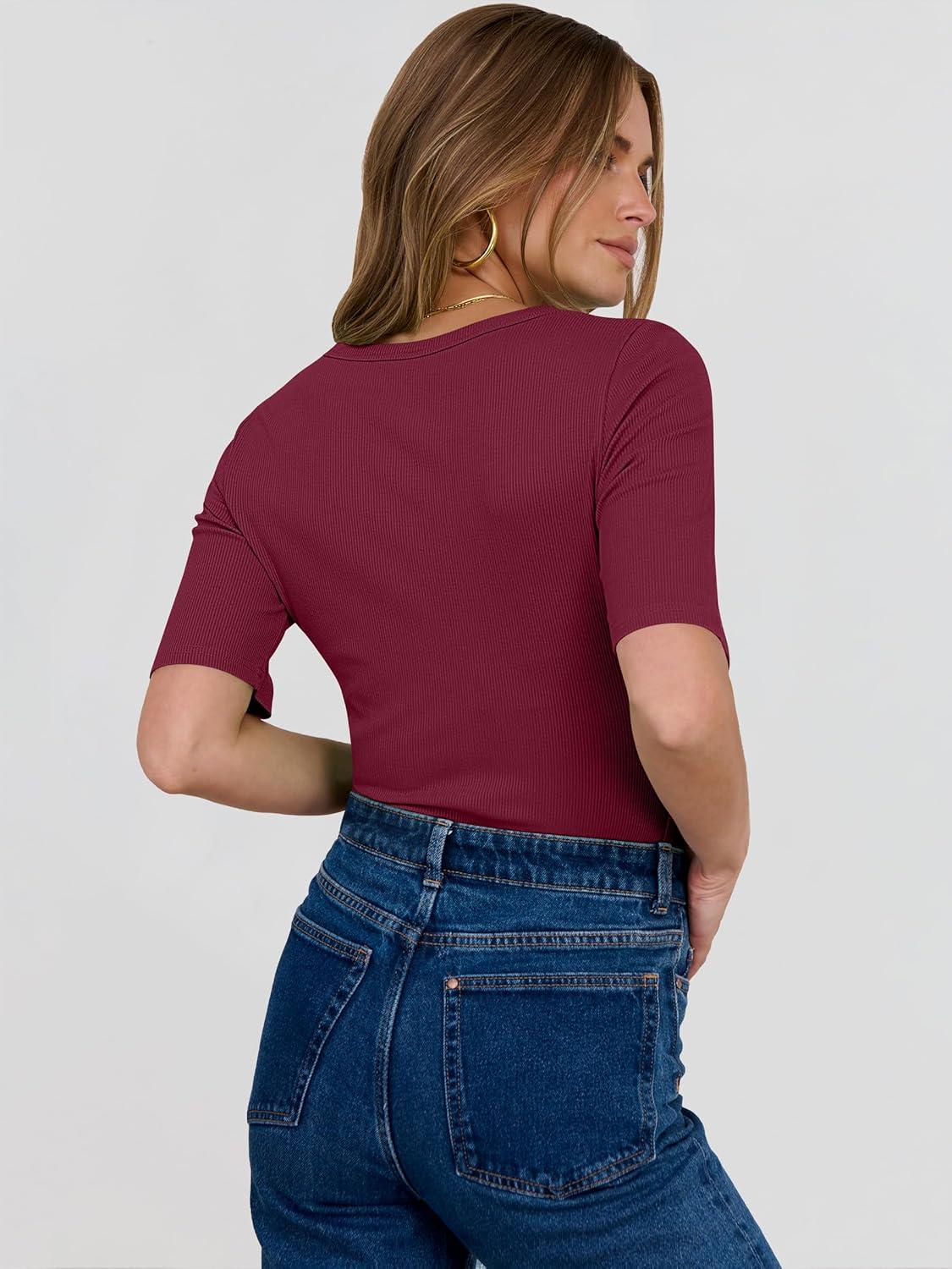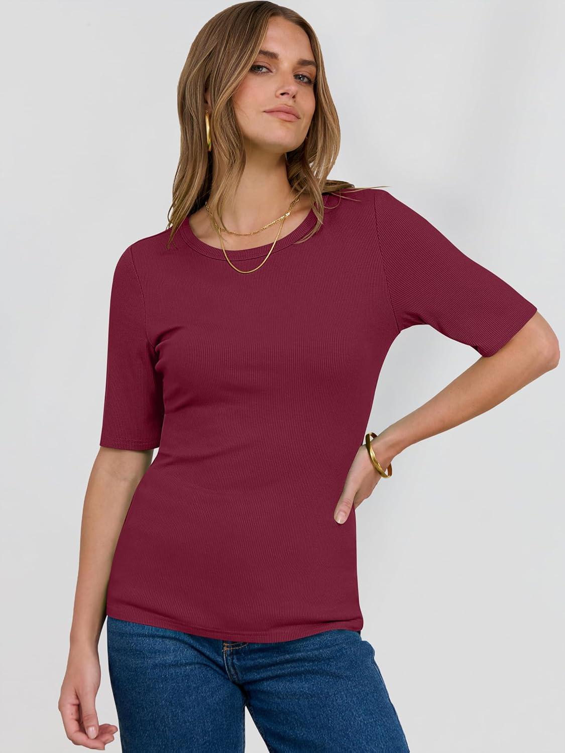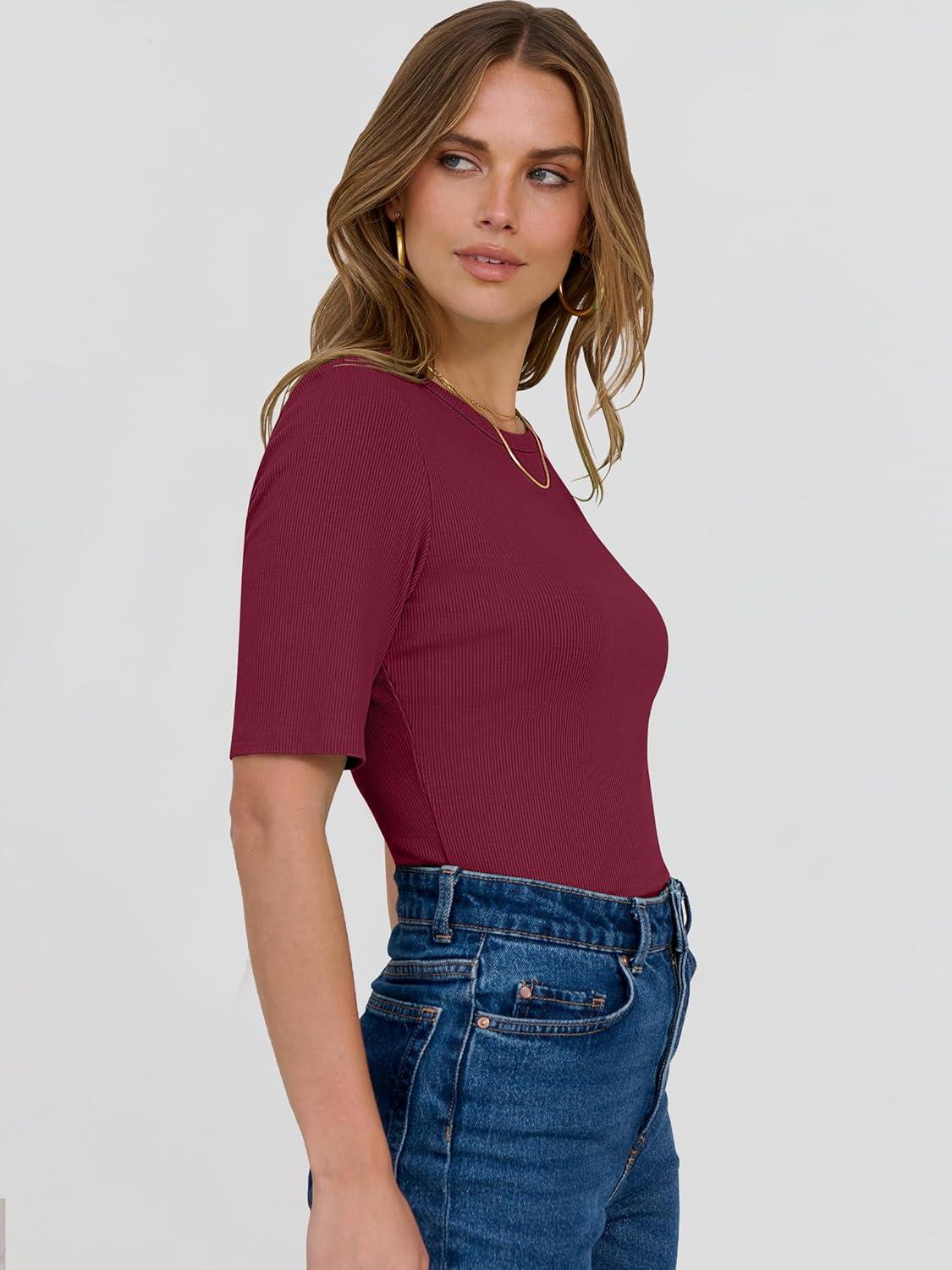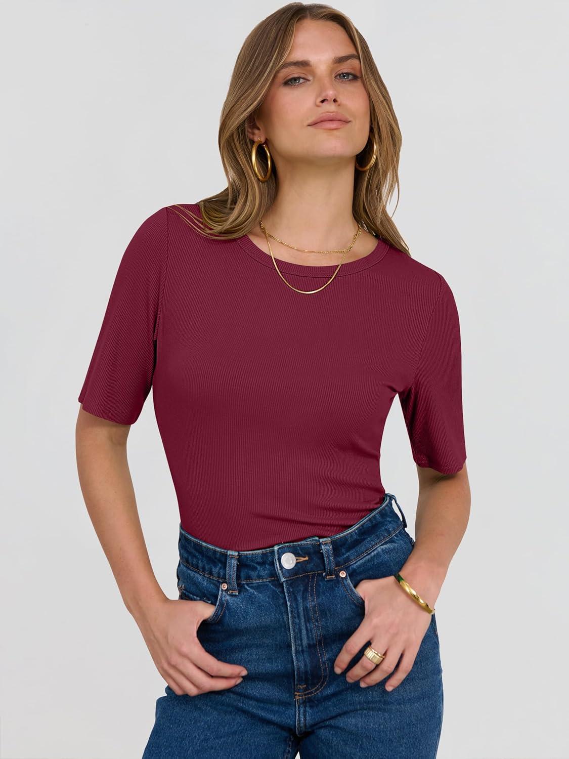 ANRABESS Womens Half Sleeve Crewneck Tops Ribbed Knit Slim Fit Shirts Basic Tee 2025 Spring Summer Dressy Casual T-Shirts(Wine Red)