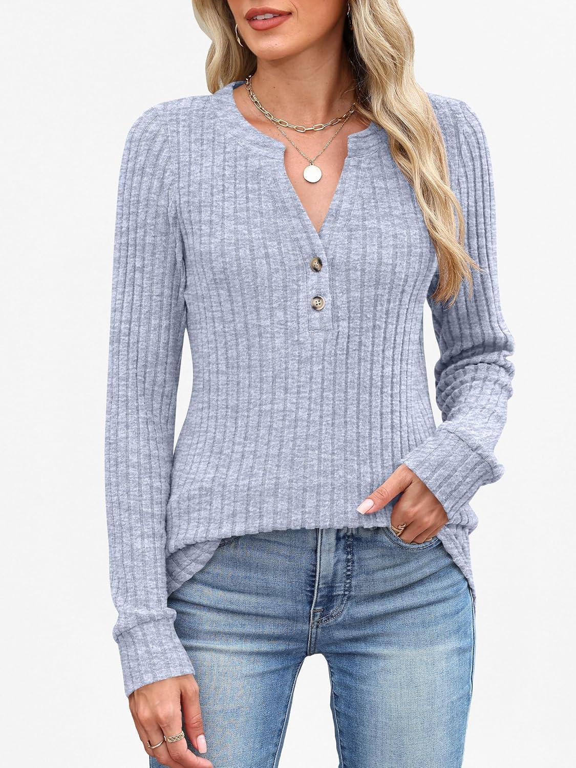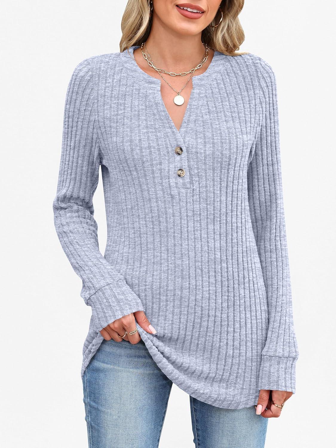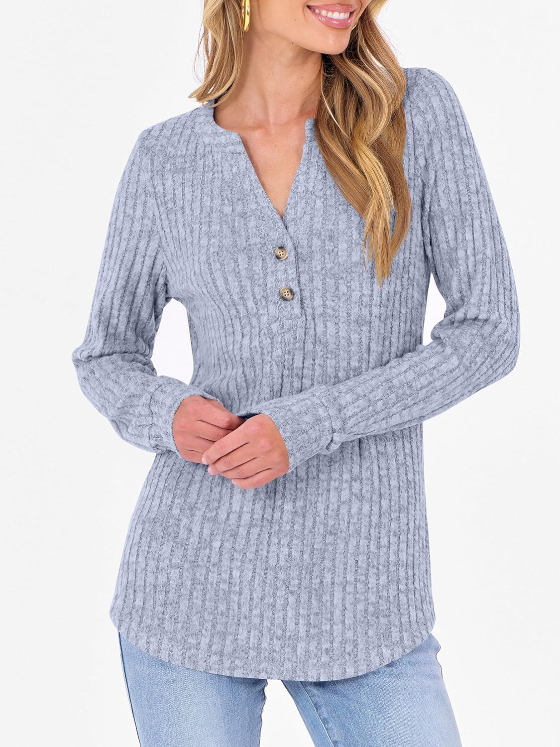 ANRABESS Womens Henley Shirts Long Sleeve Tunic Tops 2025 Fall Fashion Outfits Ribbed Knit Sweaters Ladies Casual Clothes(Blue)