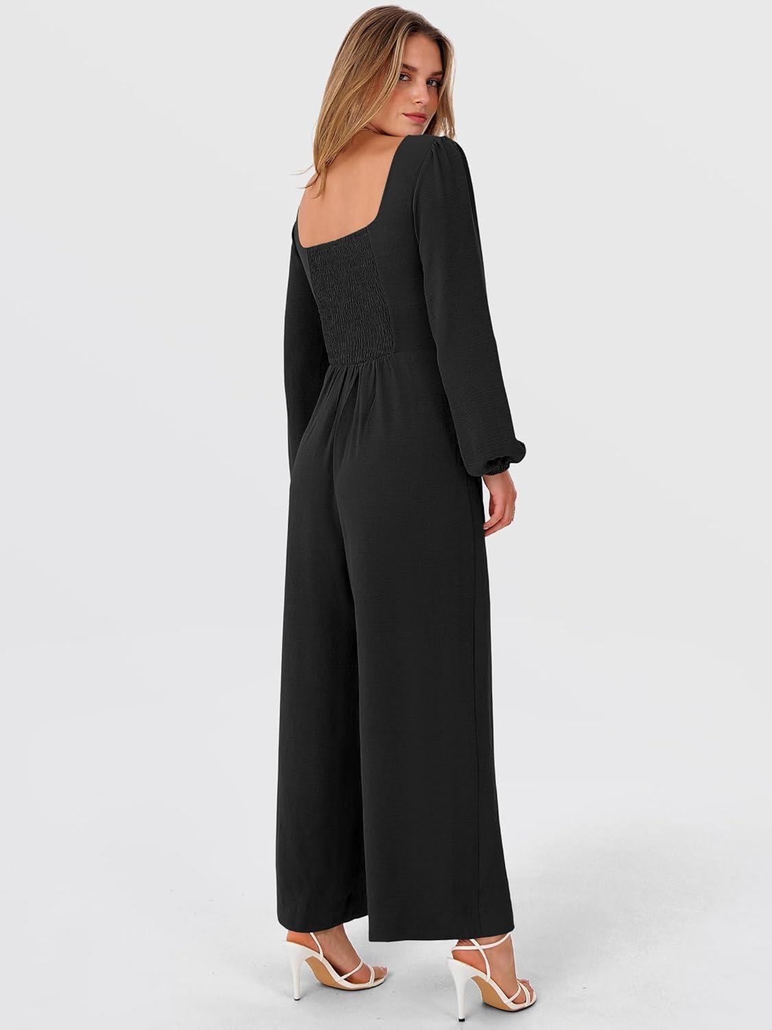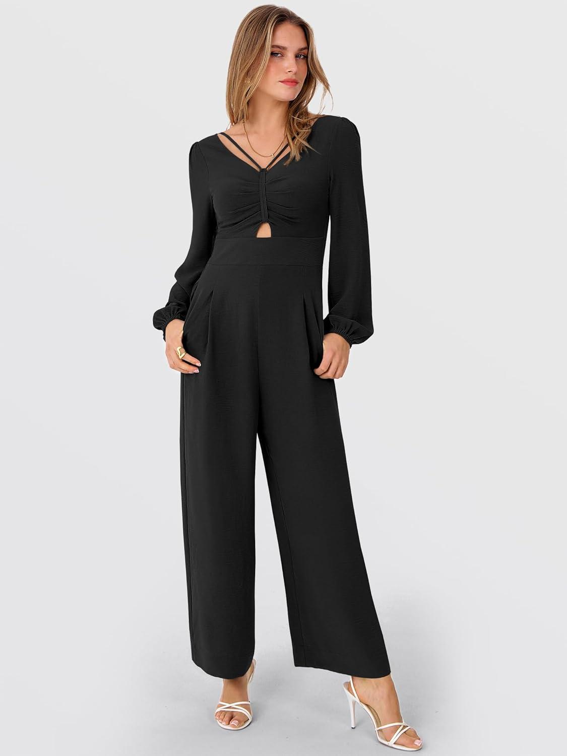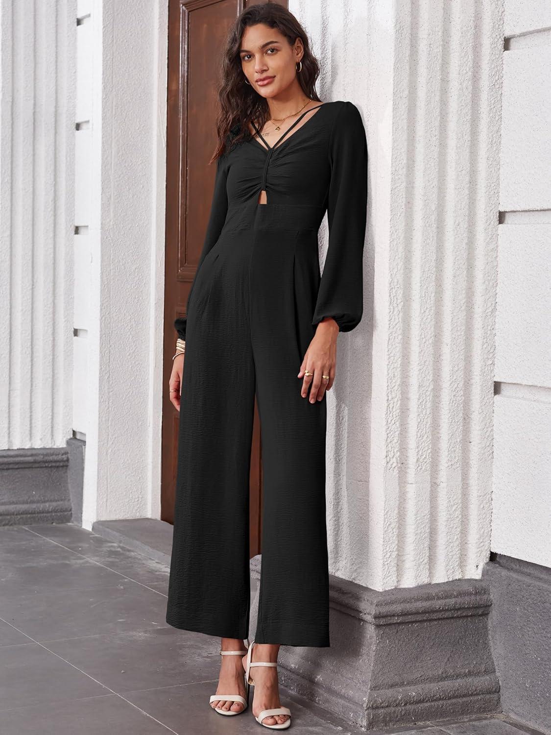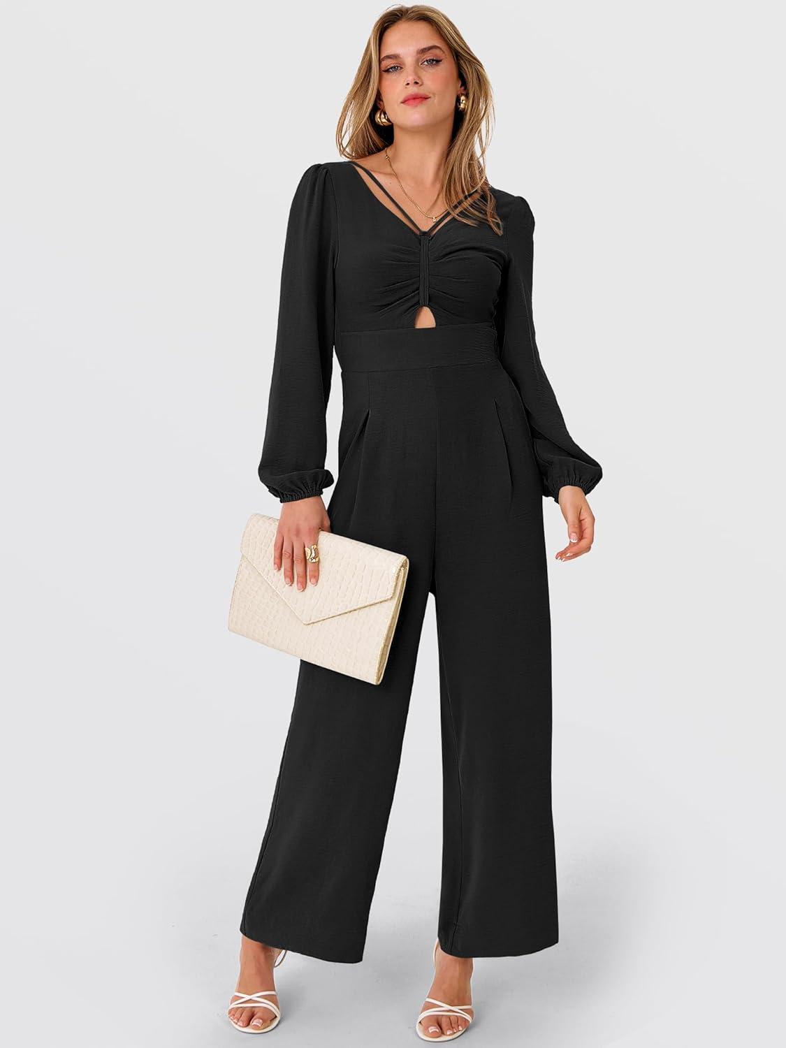 ANRABESS Womens Jumpsuits Dressy Long Sleeve Wide Leg V Neck Pants Rompers 2025 Fall Formal One Piece Wedding Guest Outfits(Black)