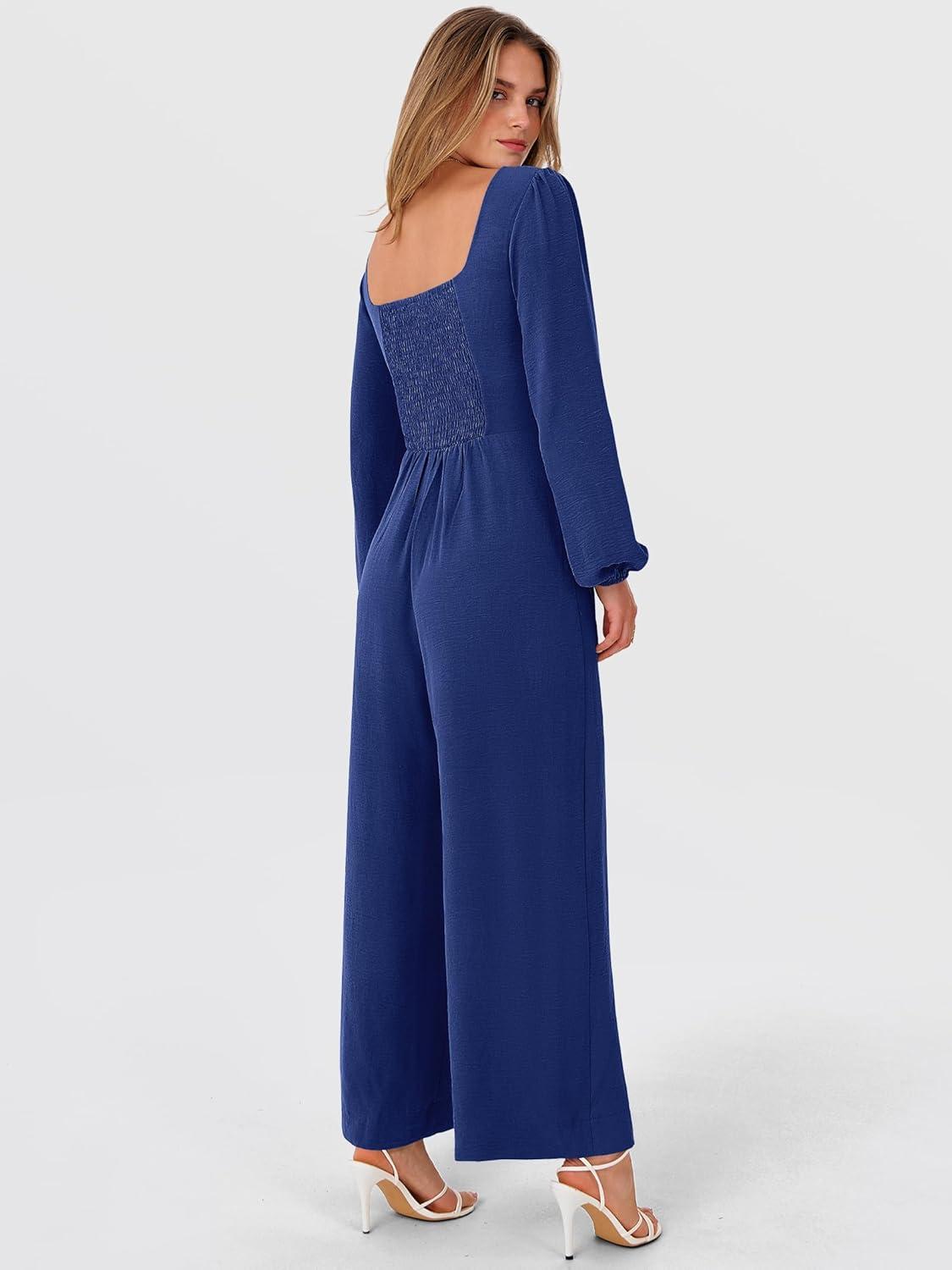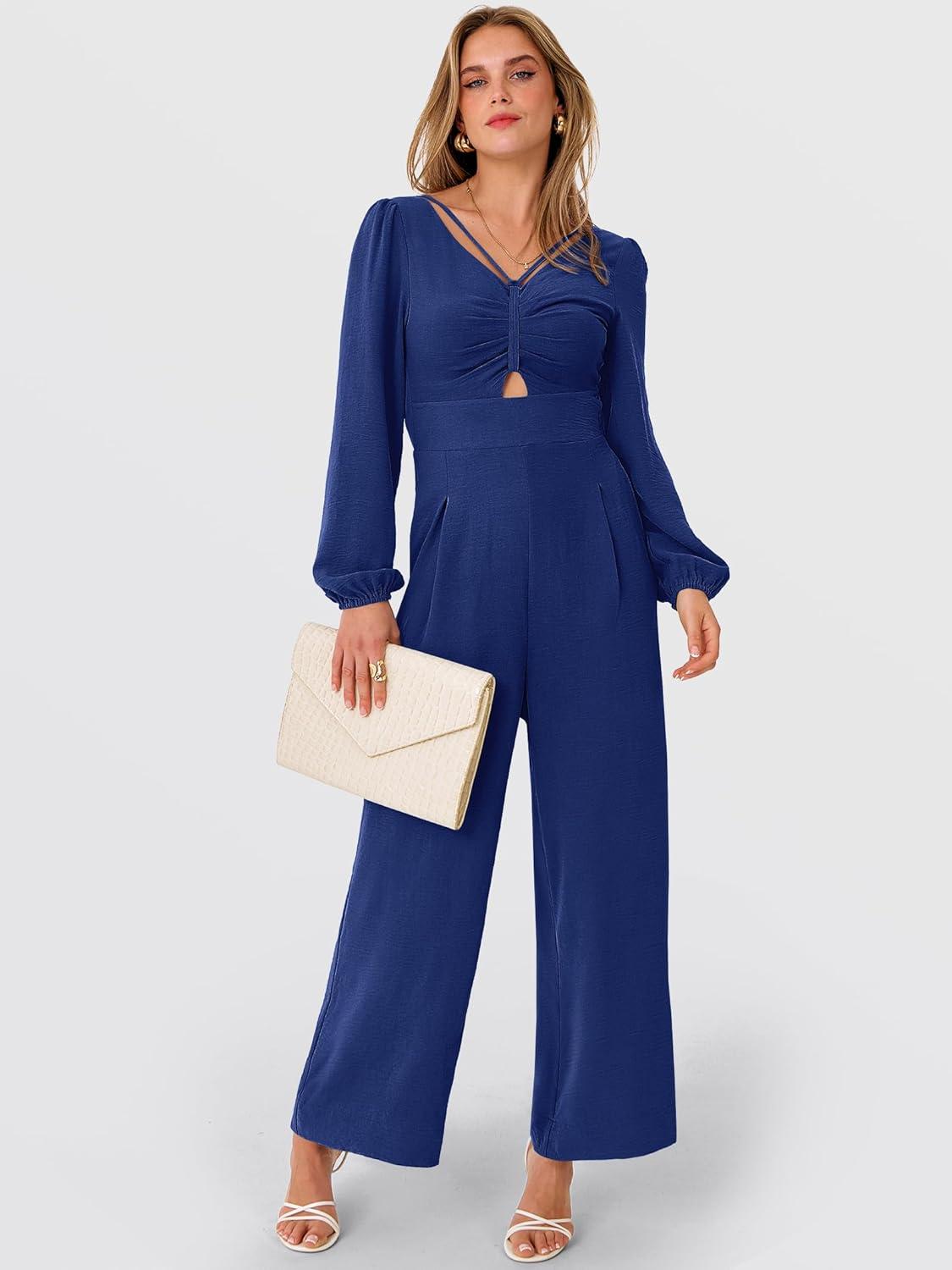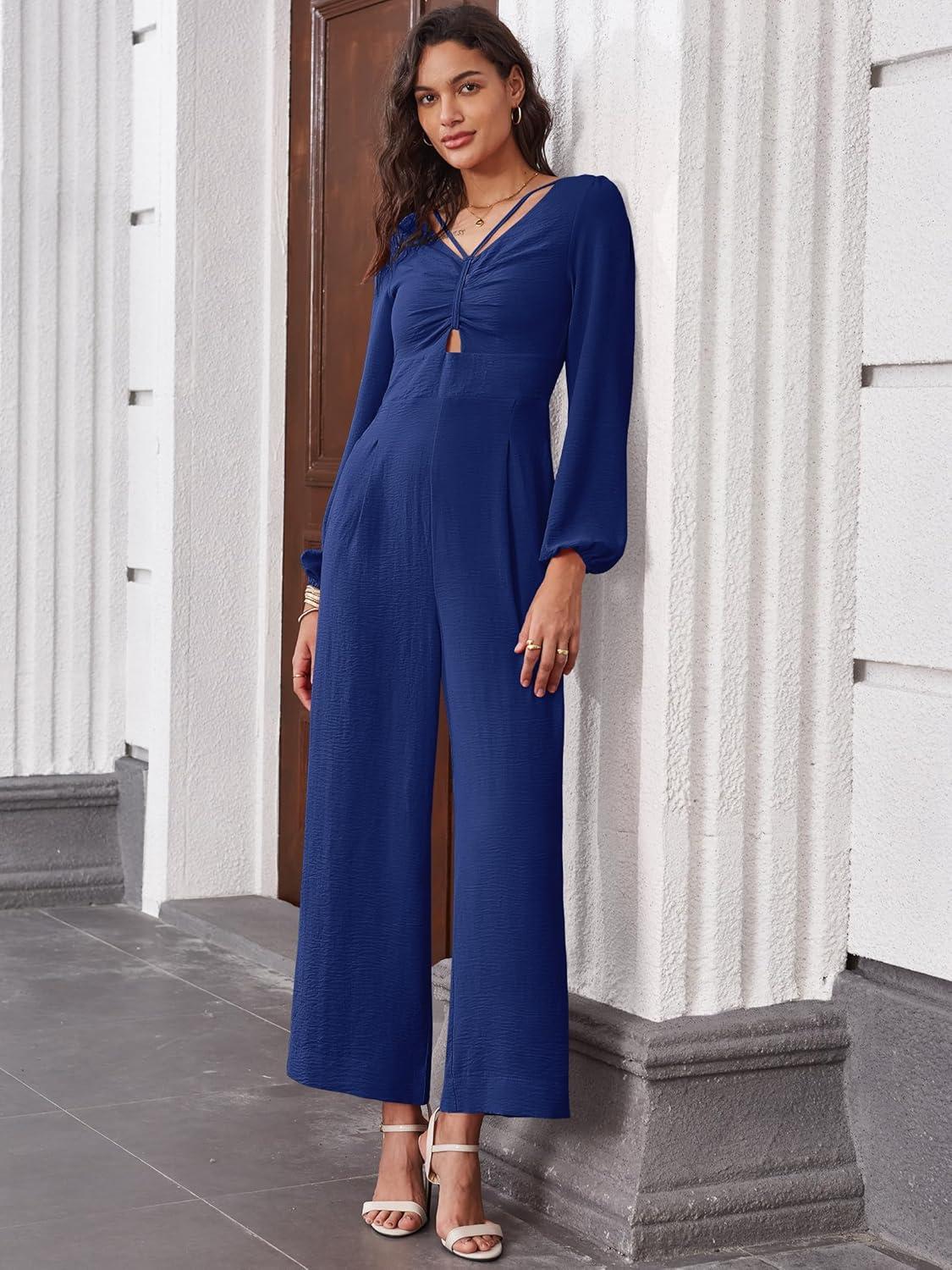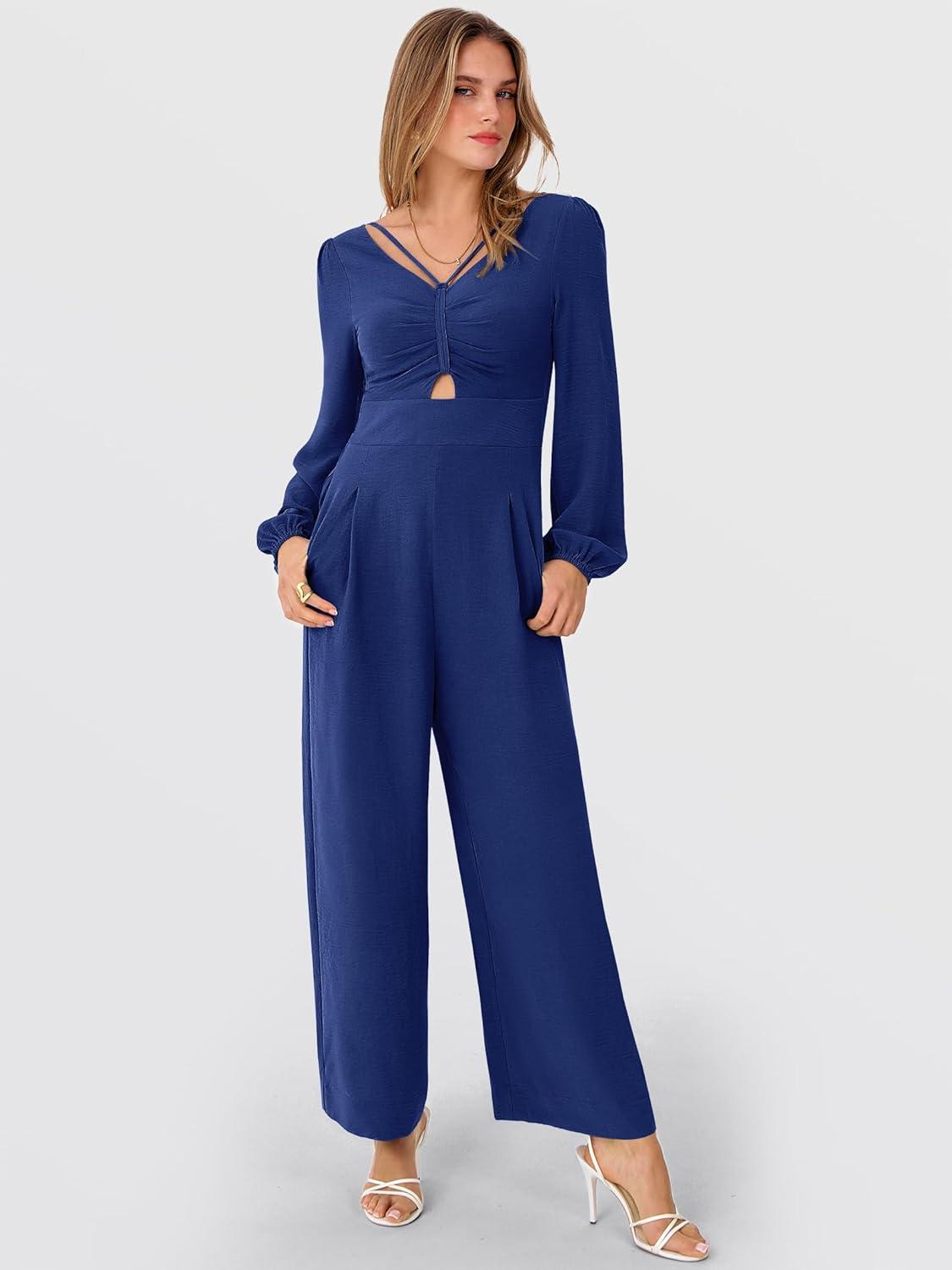 ANRABESS Womens Jumpsuits Dressy Long Sleeve Wide Leg V Neck Pants Rompers 2025 Fall Formal One Piece Wedding Guest Outfits(Navy Blue)