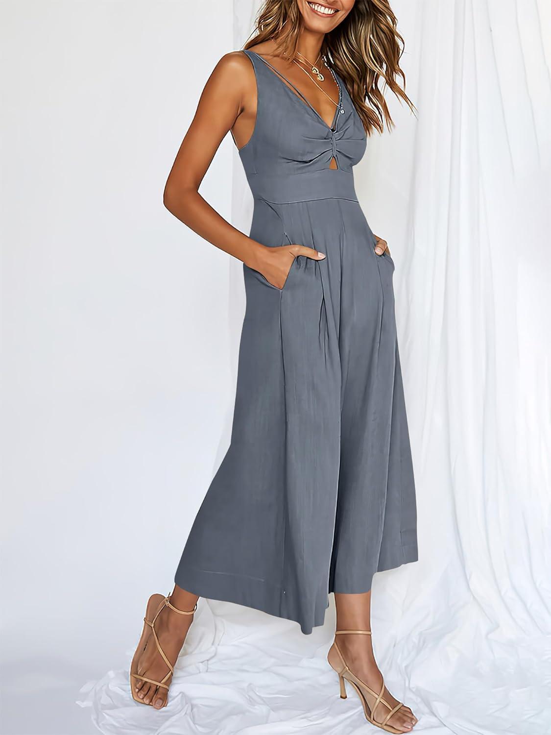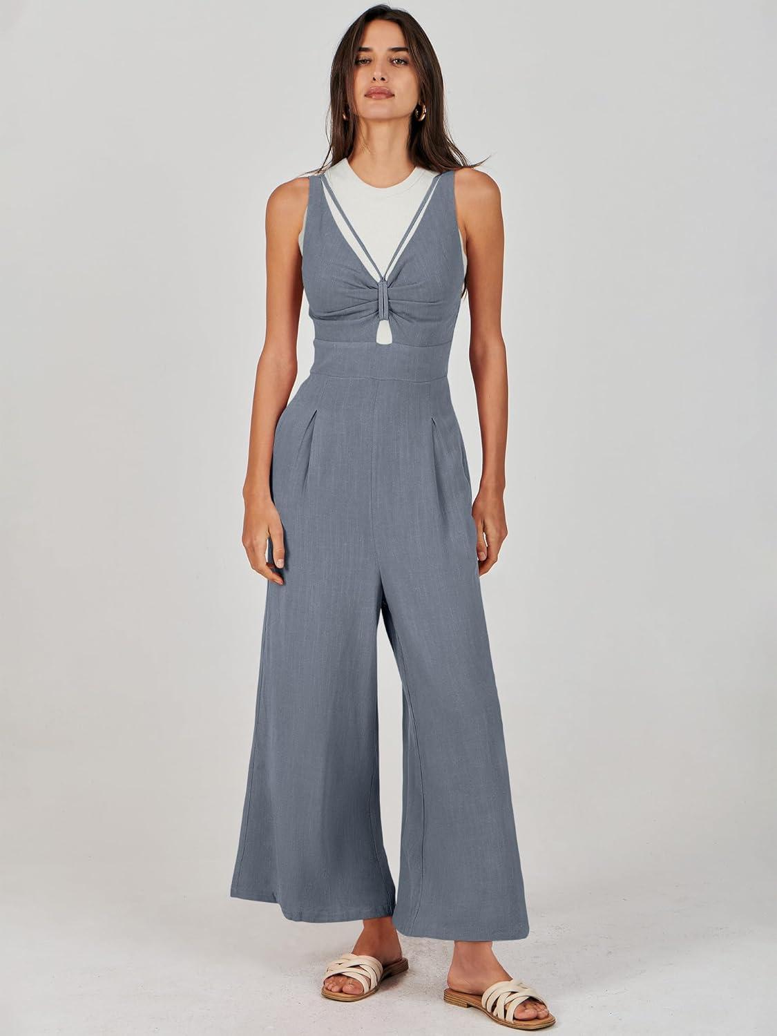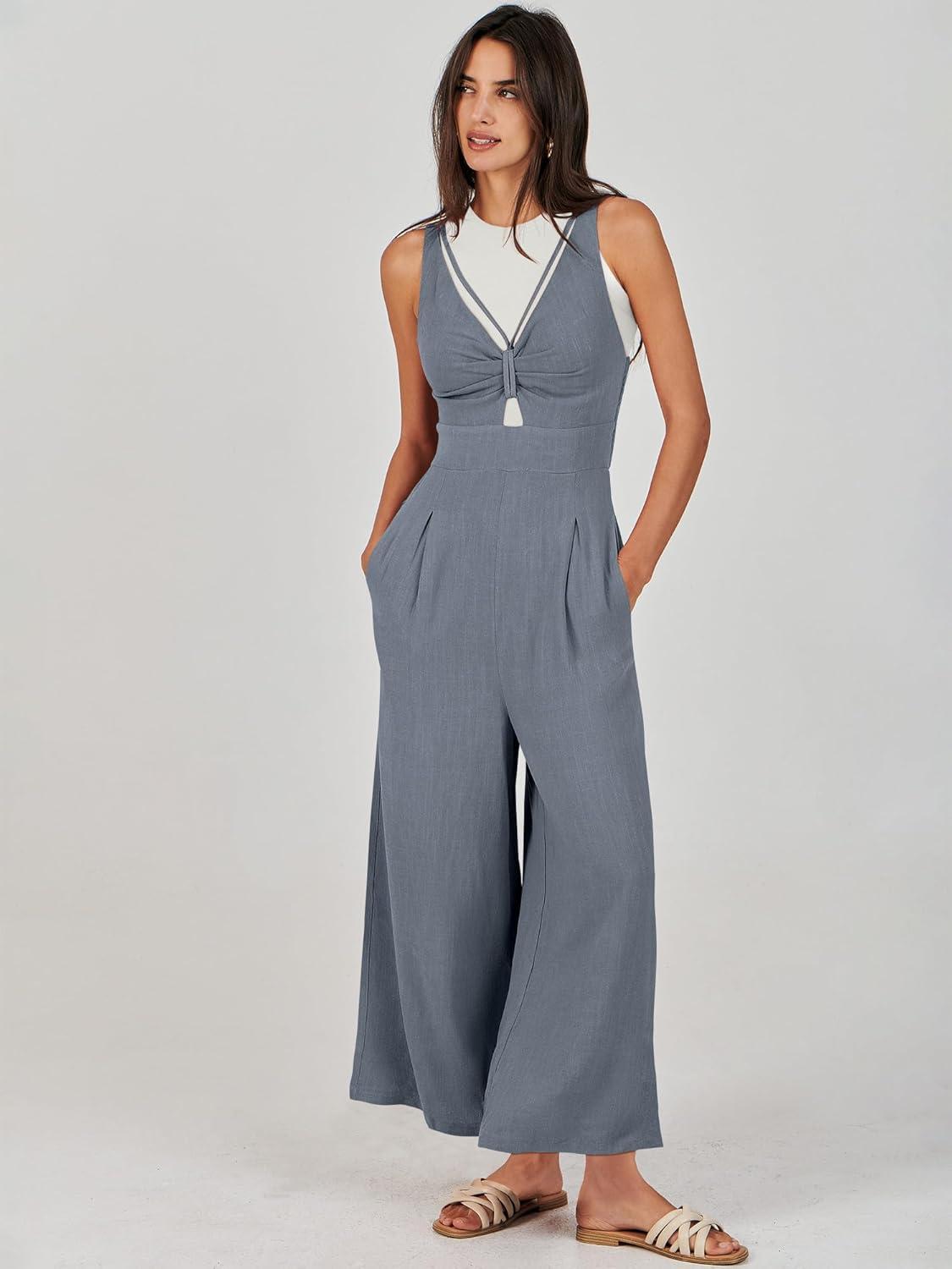ANRABESS Women’s Jumpsuits Summer Wide Leg Sleeveless V Neck Casual Dressy Linen Pants Rompers 2025 Vacation Beach Outfits(Dark Grey)