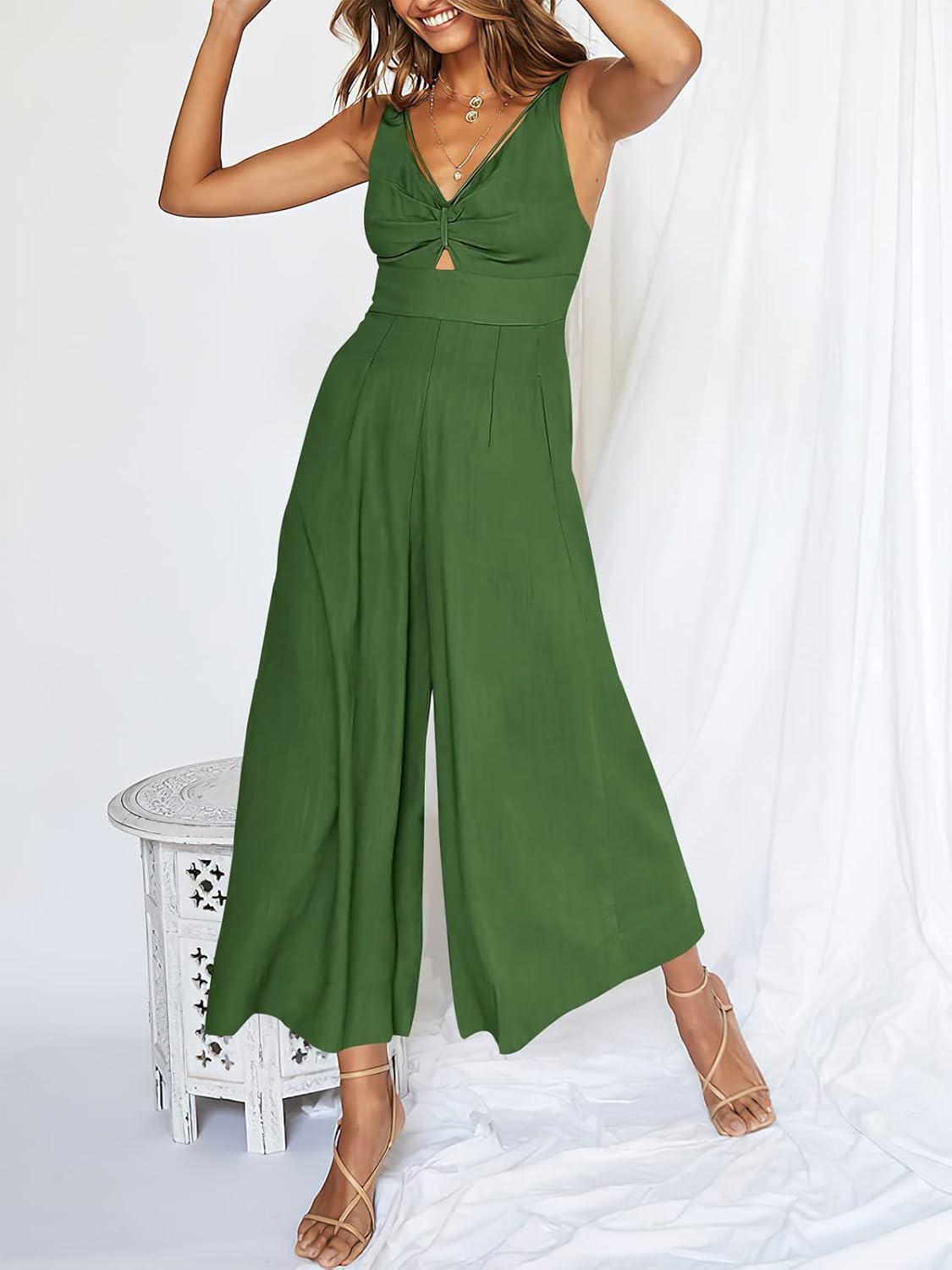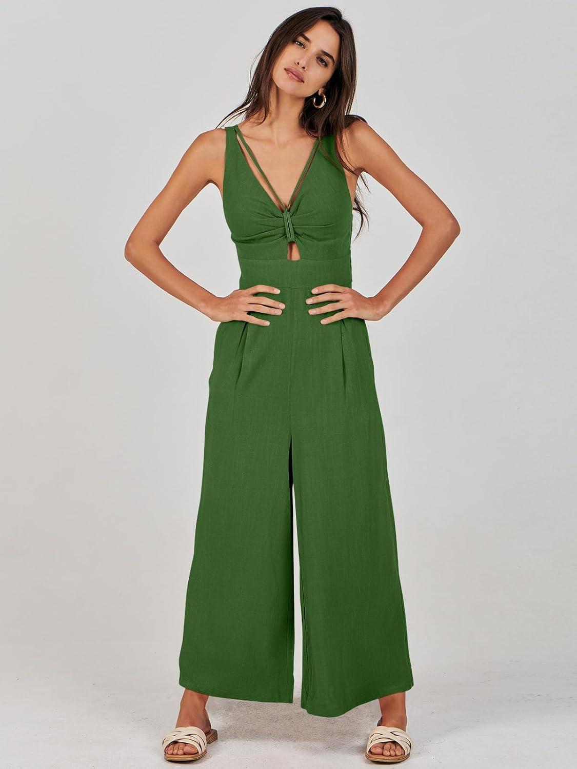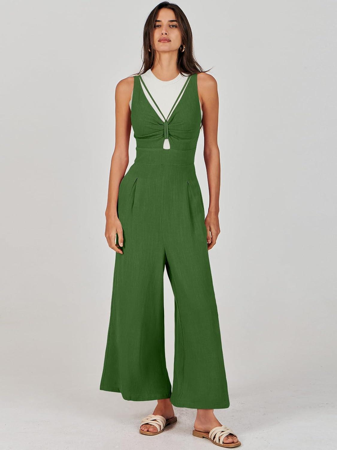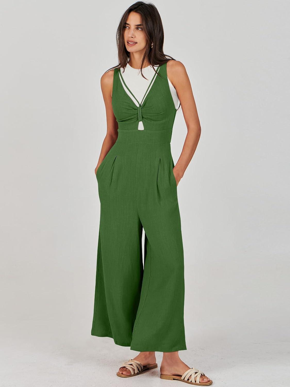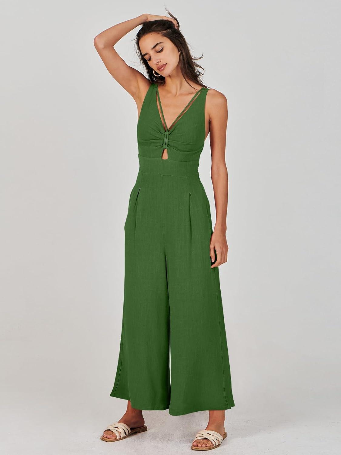 ANRABESS Women’s Jumpsuits Summer Wide Leg Sleeveless V Neck Casual Dressy Linen Pants Rompers 2025 Vacation Beach Outfits(Green)