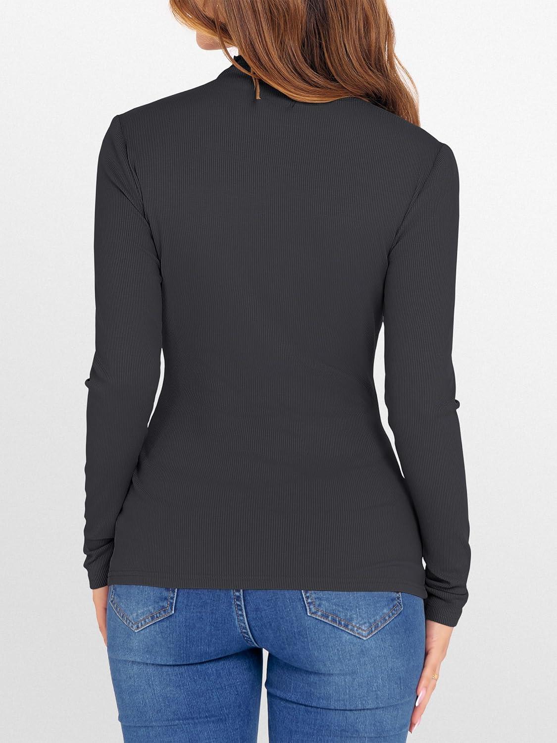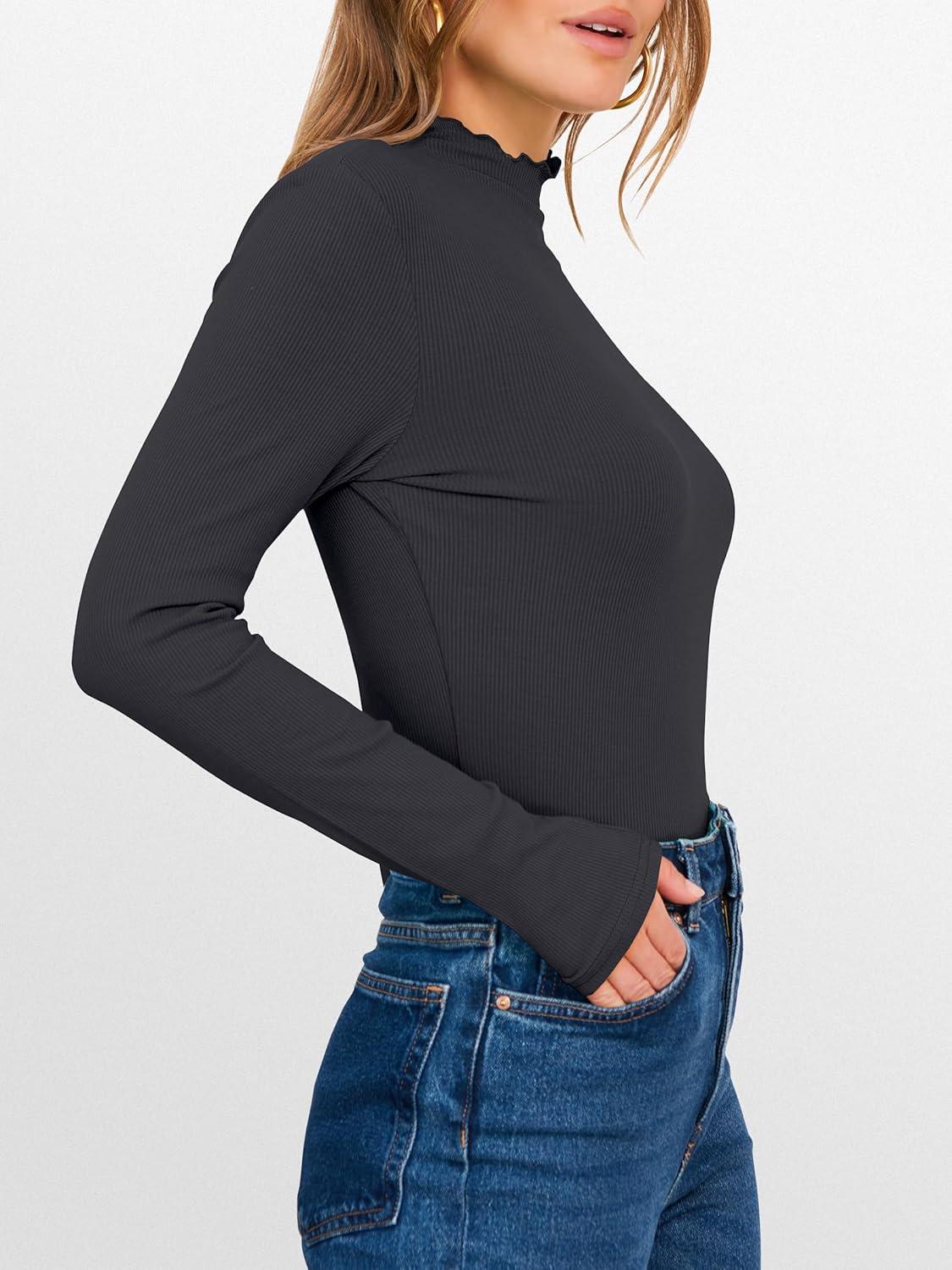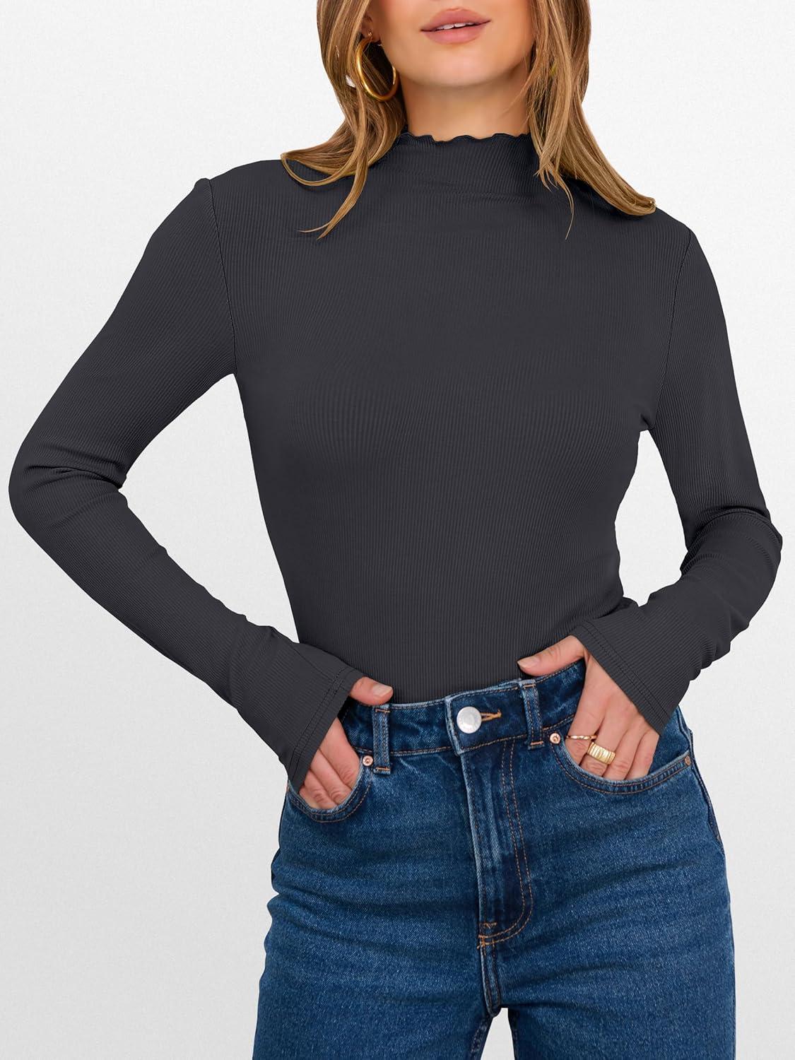 ANRABESS Women’s Lettuce Trim Mock Neck Long Sleeve Tops 2025 Casual Dressy Ribbed Knit Slim Fit Tee Shirt Fall Layer Outfits(Deep Grey)