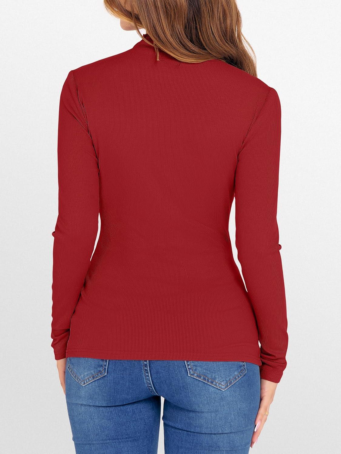 ANRABESS Women’s Lettuce Trim Mock Neck Long Sleeve Tops 2025 Casual Dressy Ribbed Knit Slim Fit Tee Shirt Fall Layer Outfits(Red)