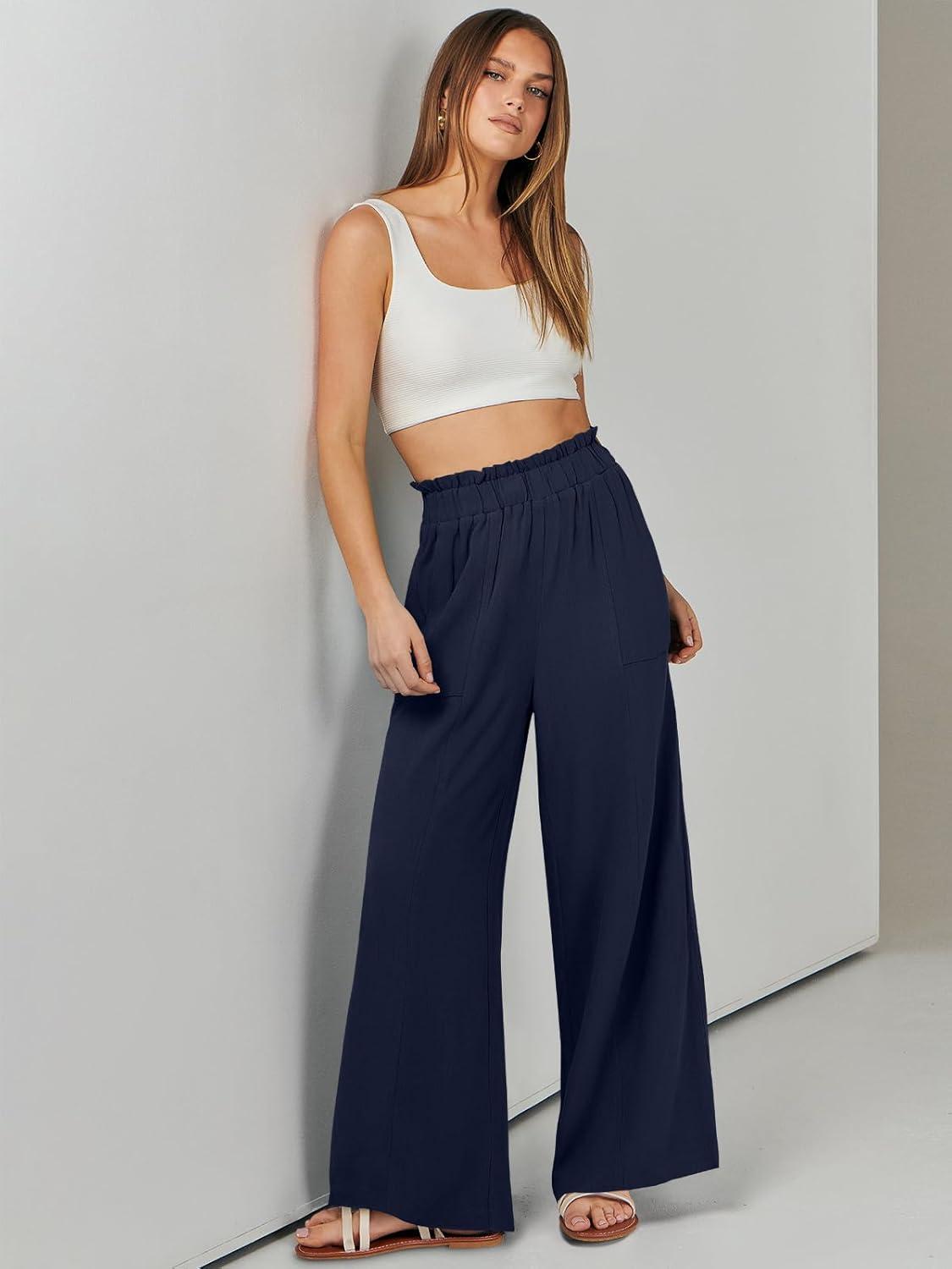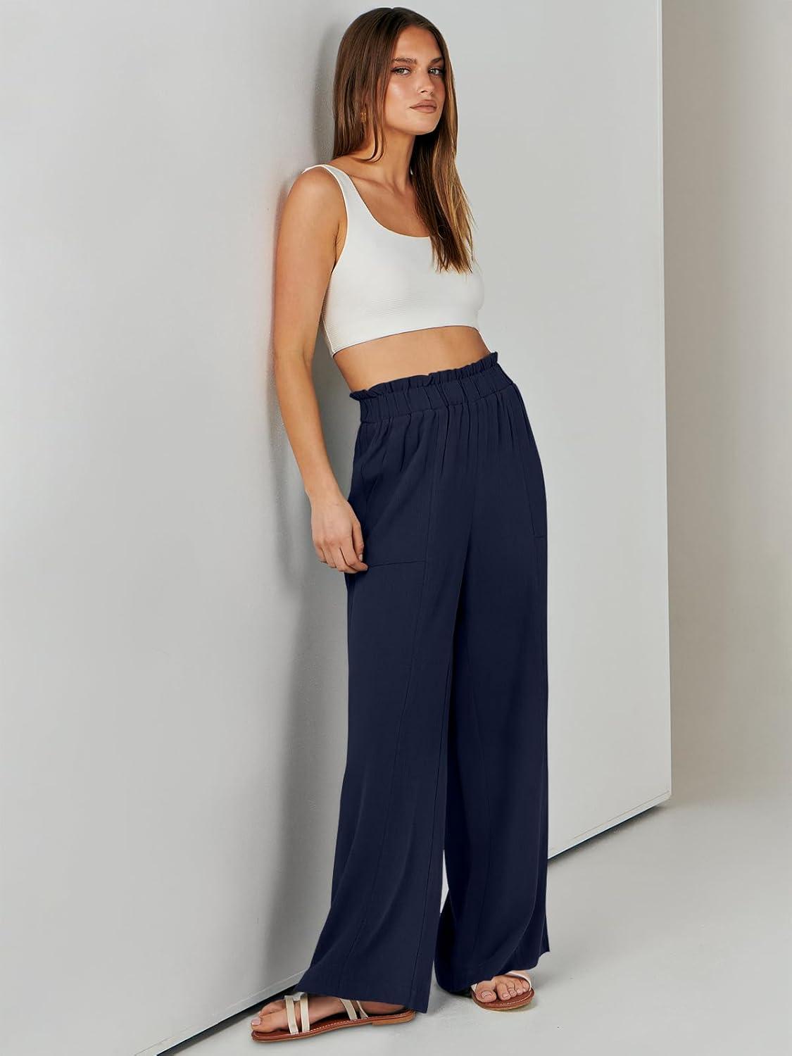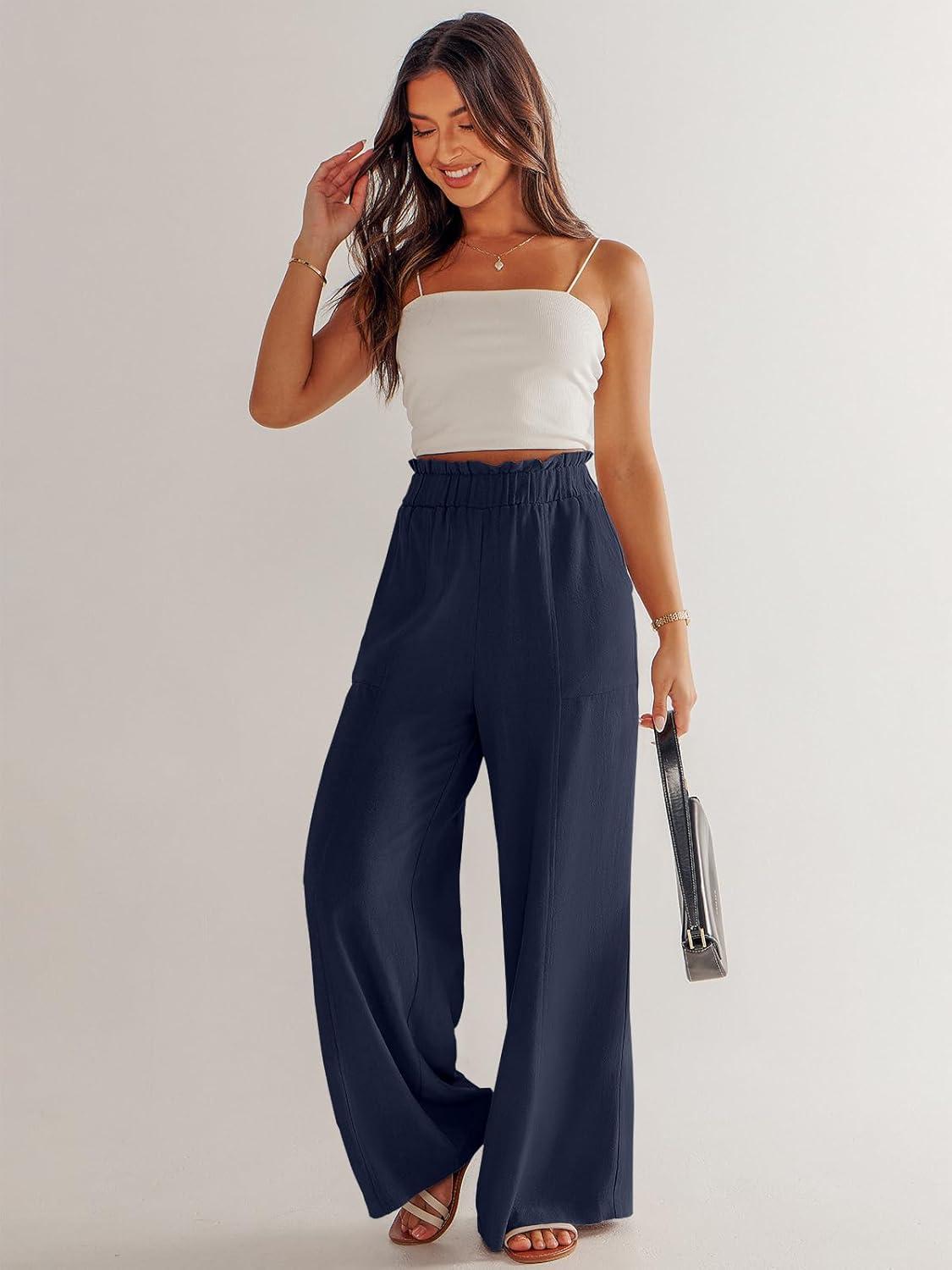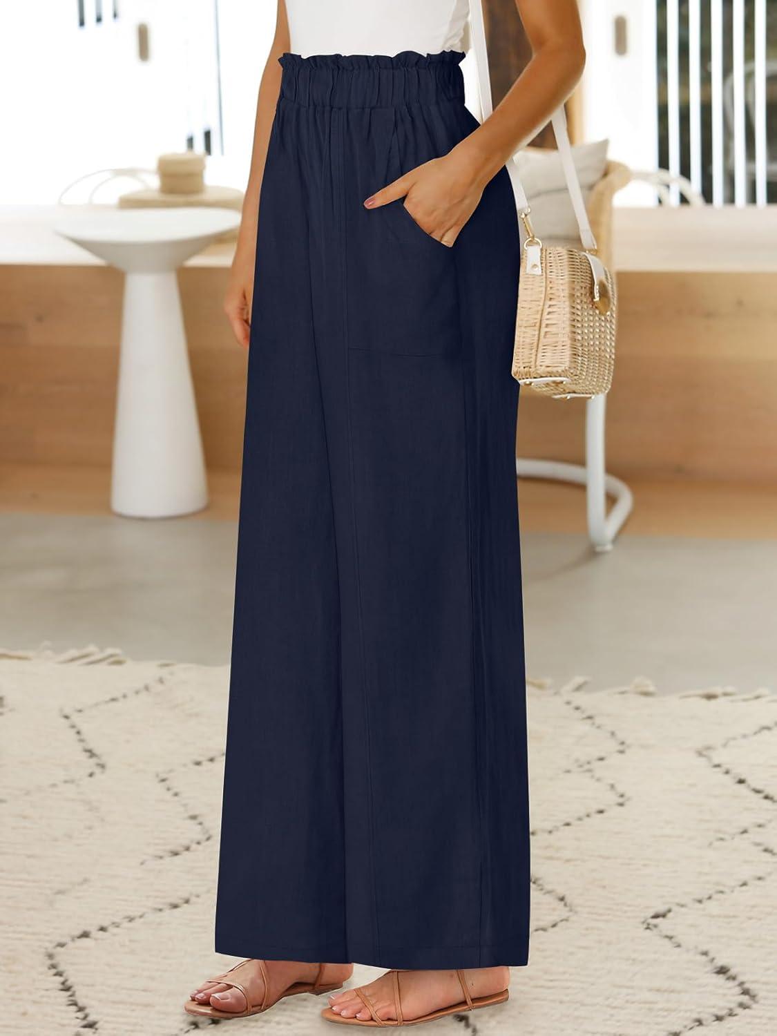 ANRABESS Womens Linen Pants 2025 Summer Casual Loose Wide Leg Palazzo Pants High Waist Flowy Beach Trousers Work Outfits(Navy Blue)