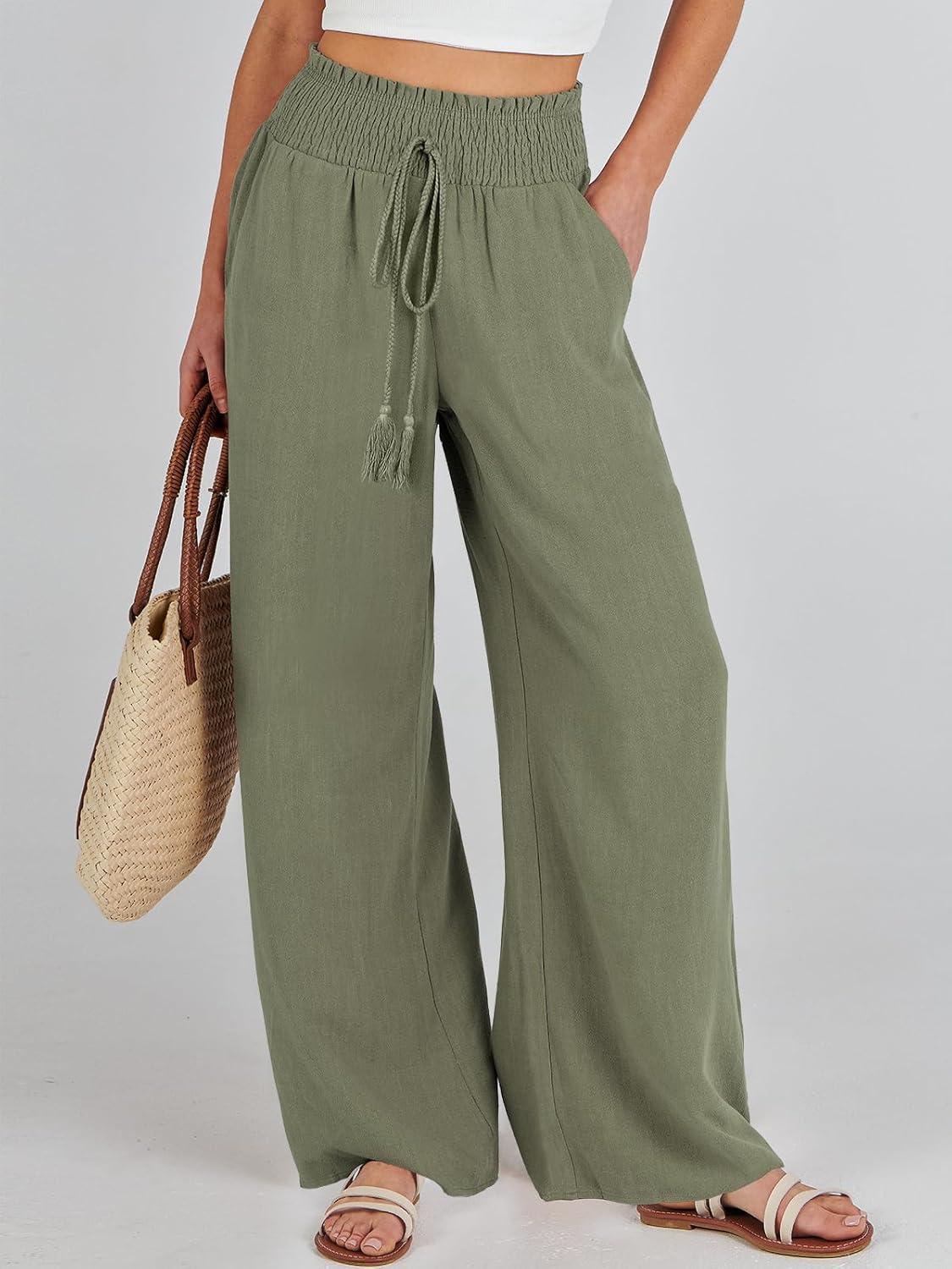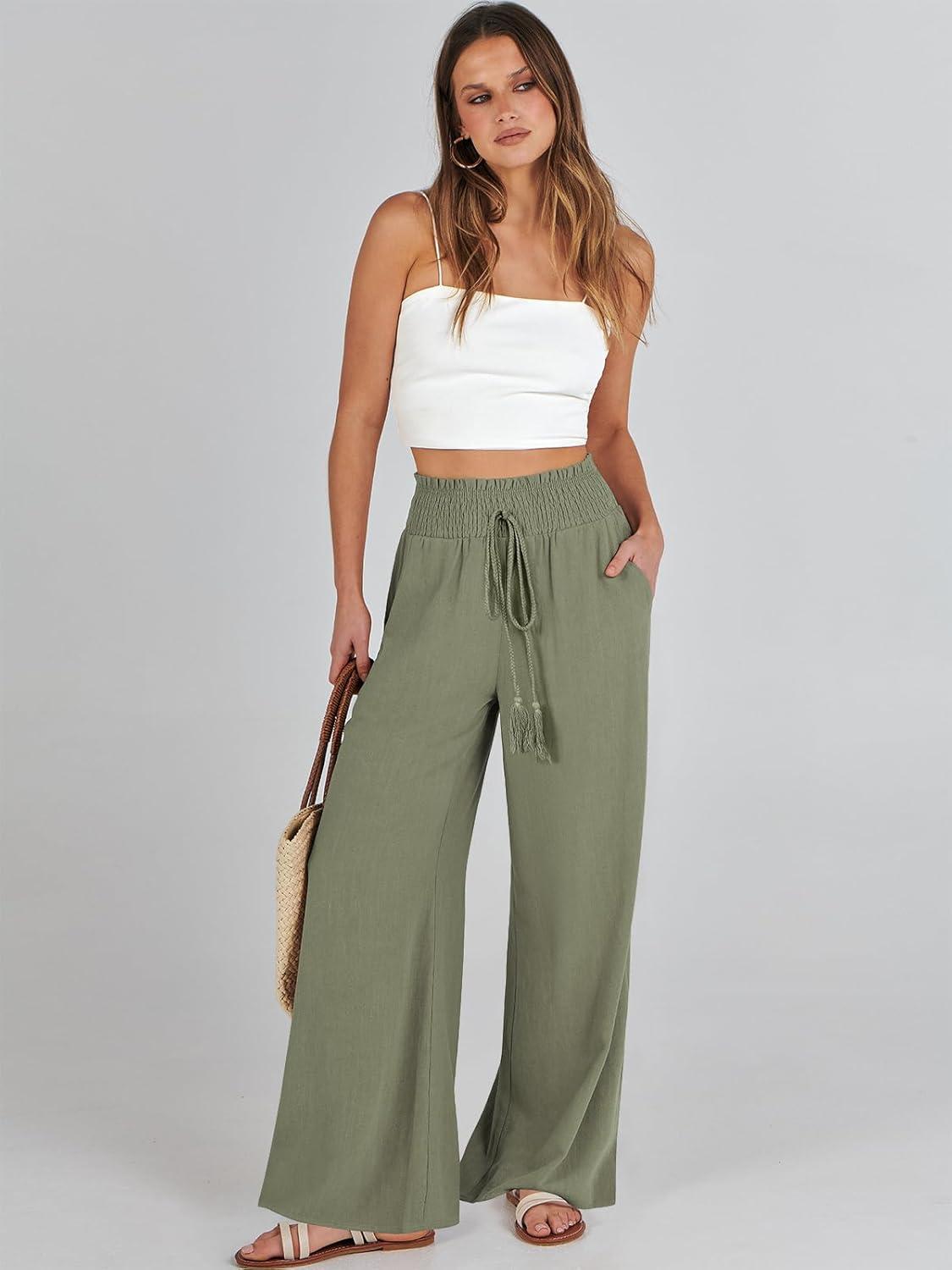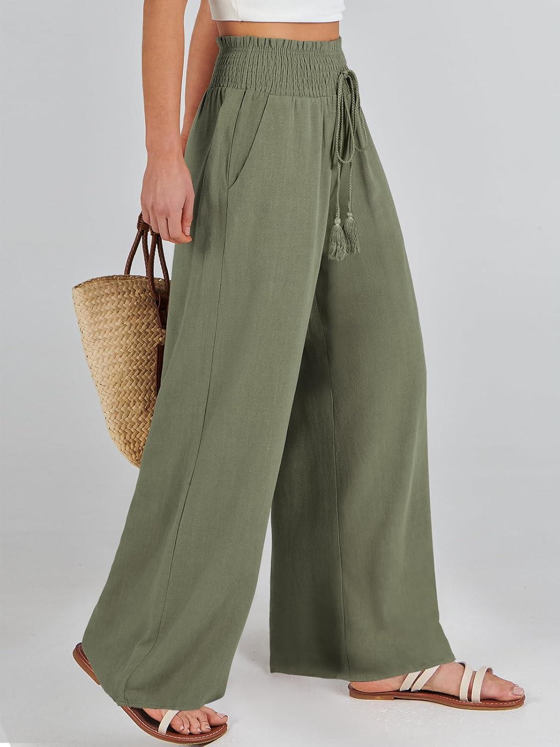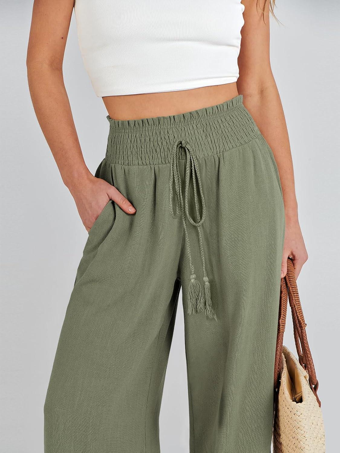 ANRABESS Women’s Linen Pants Summer Casual Palazzo Beach Pant Drawstring High Waist Wide Leg Trousers Vacation Outfits(Olive)