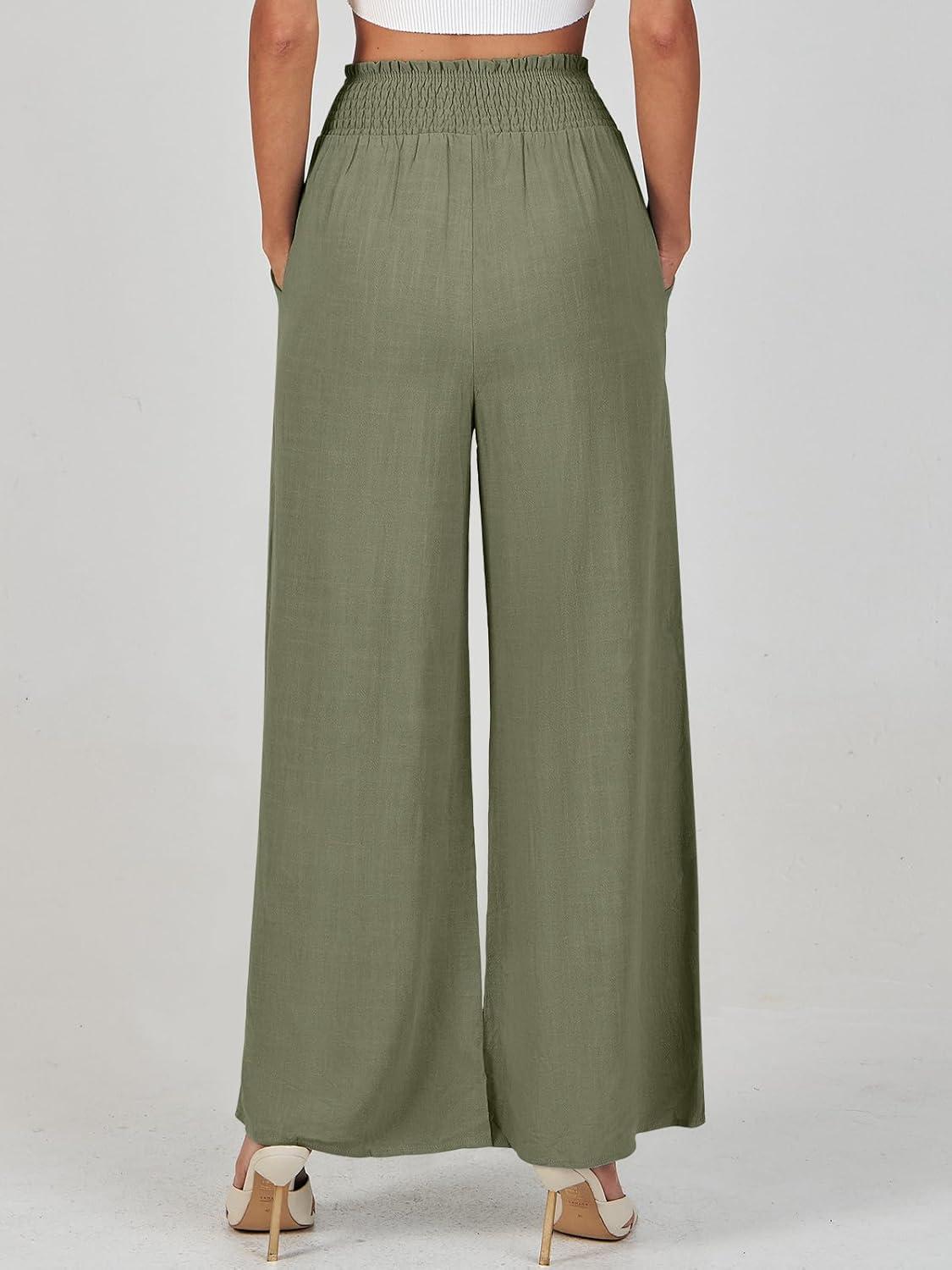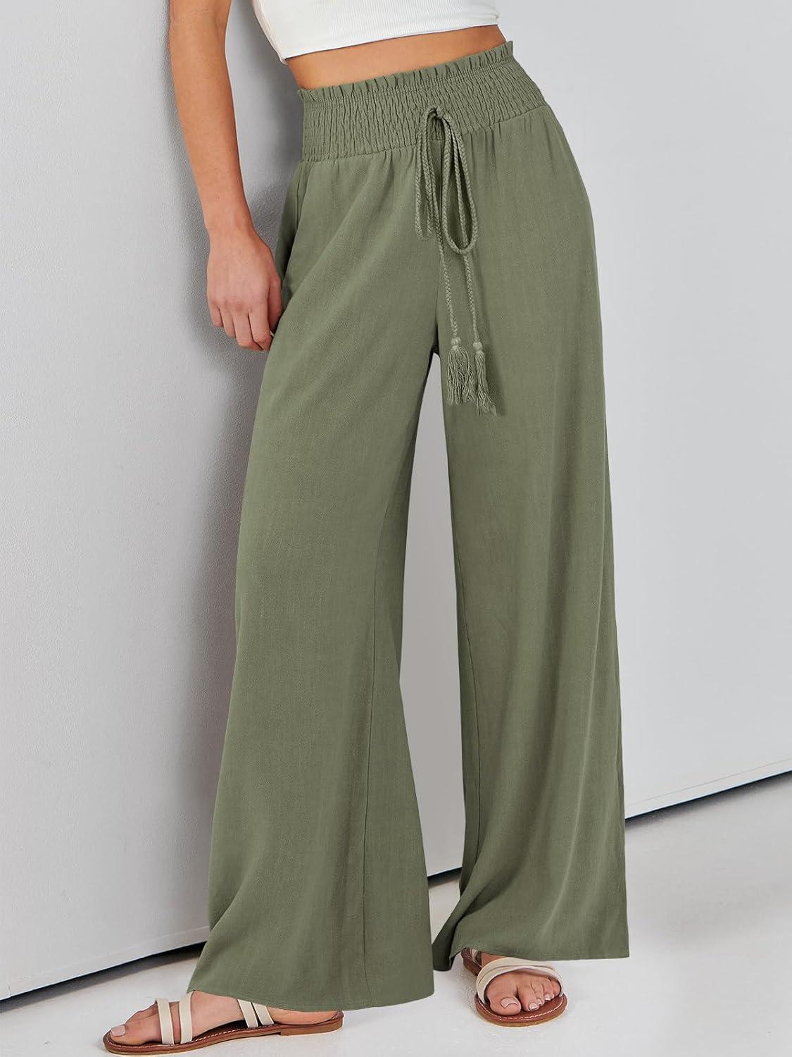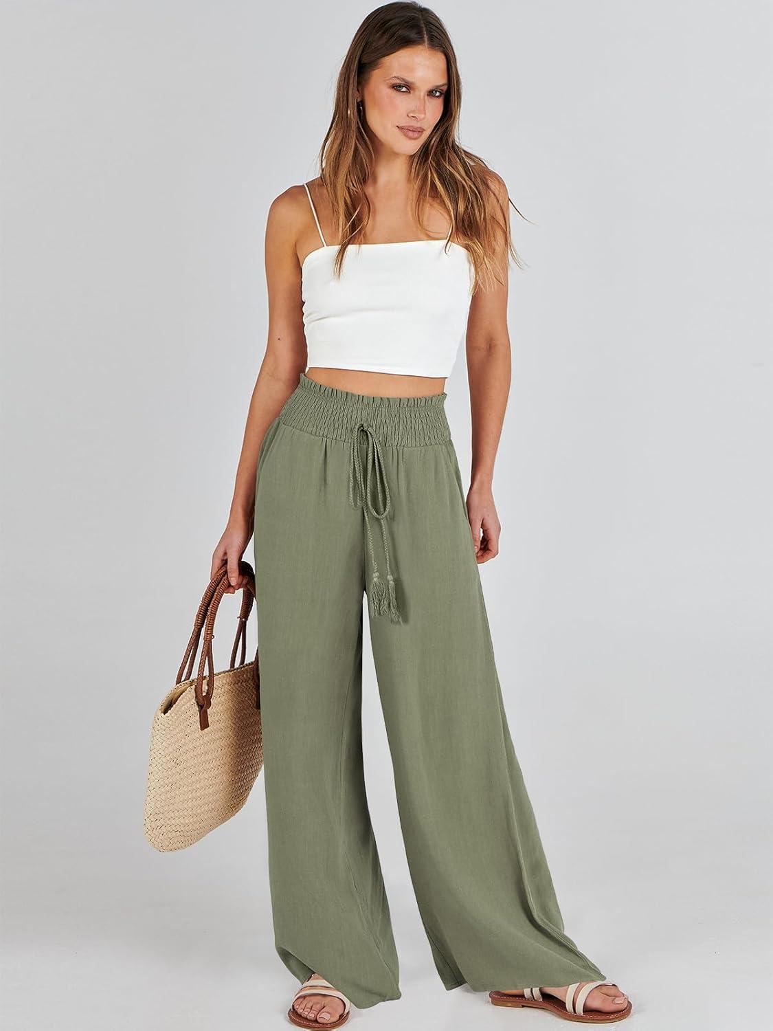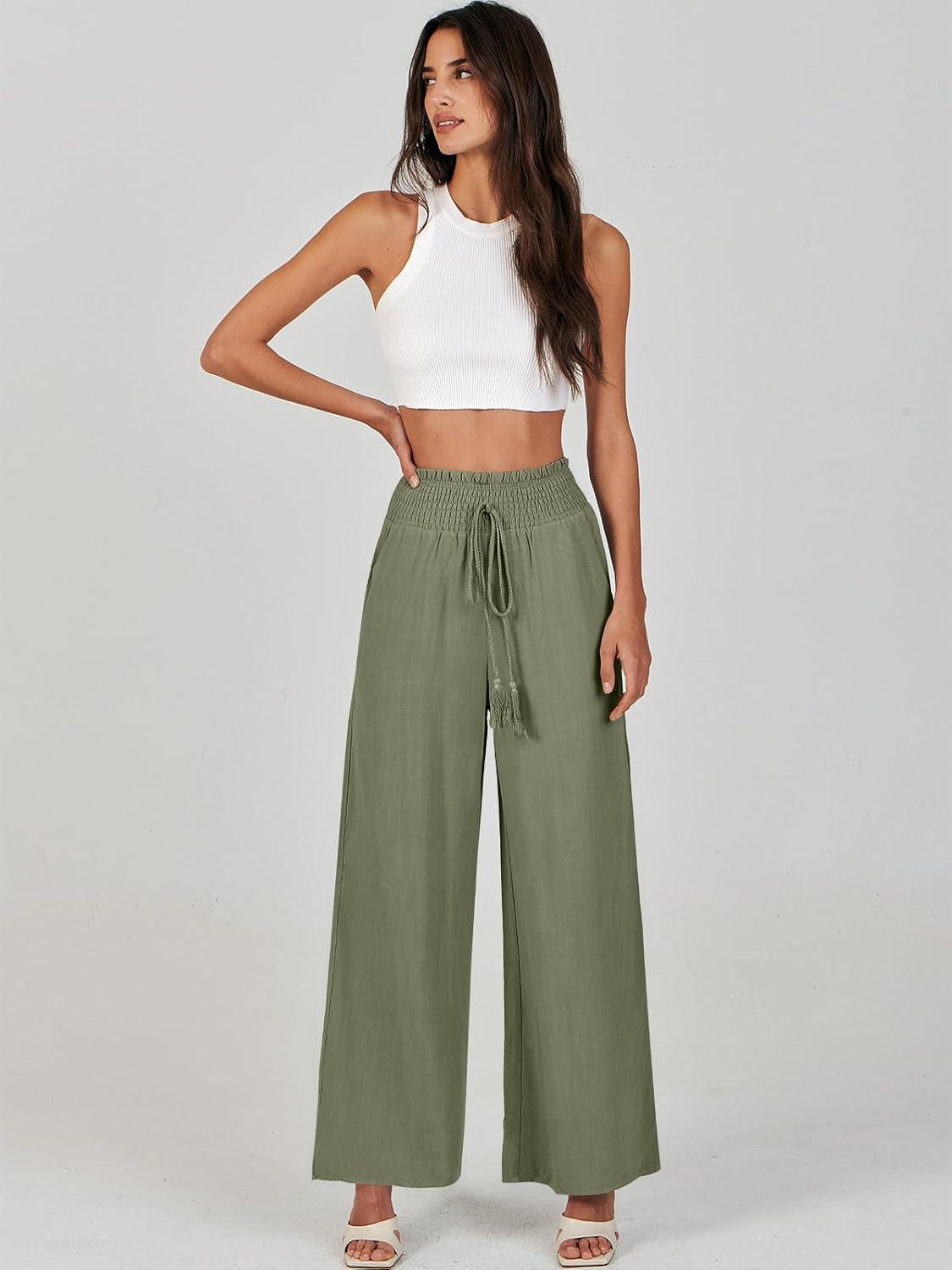 ANRABESS Women’s Linen Pants Summer Casual Palazzo Beach Pant Drawstring High Waist Wide Leg Trousers Vacation Outfits(Olive)