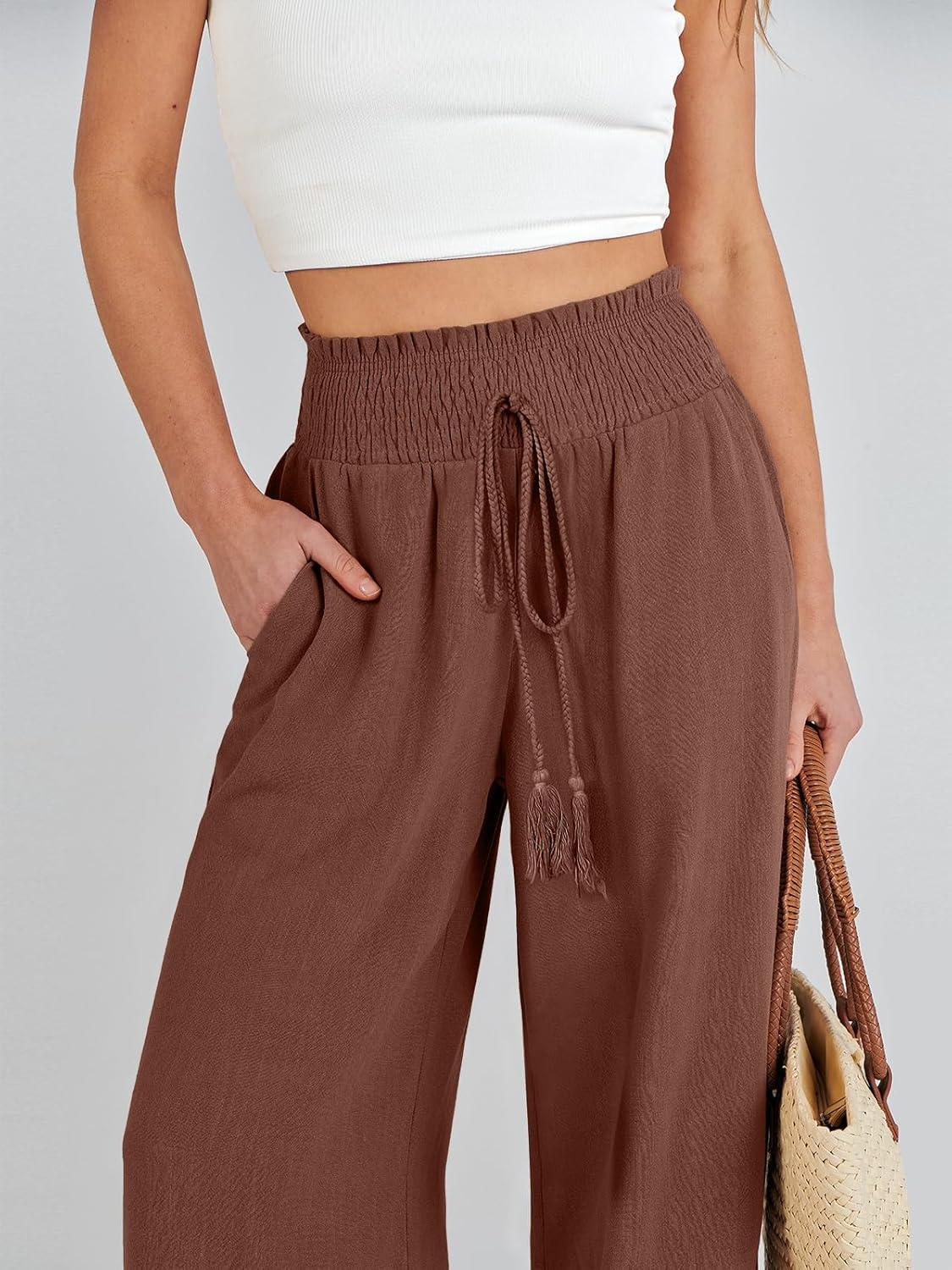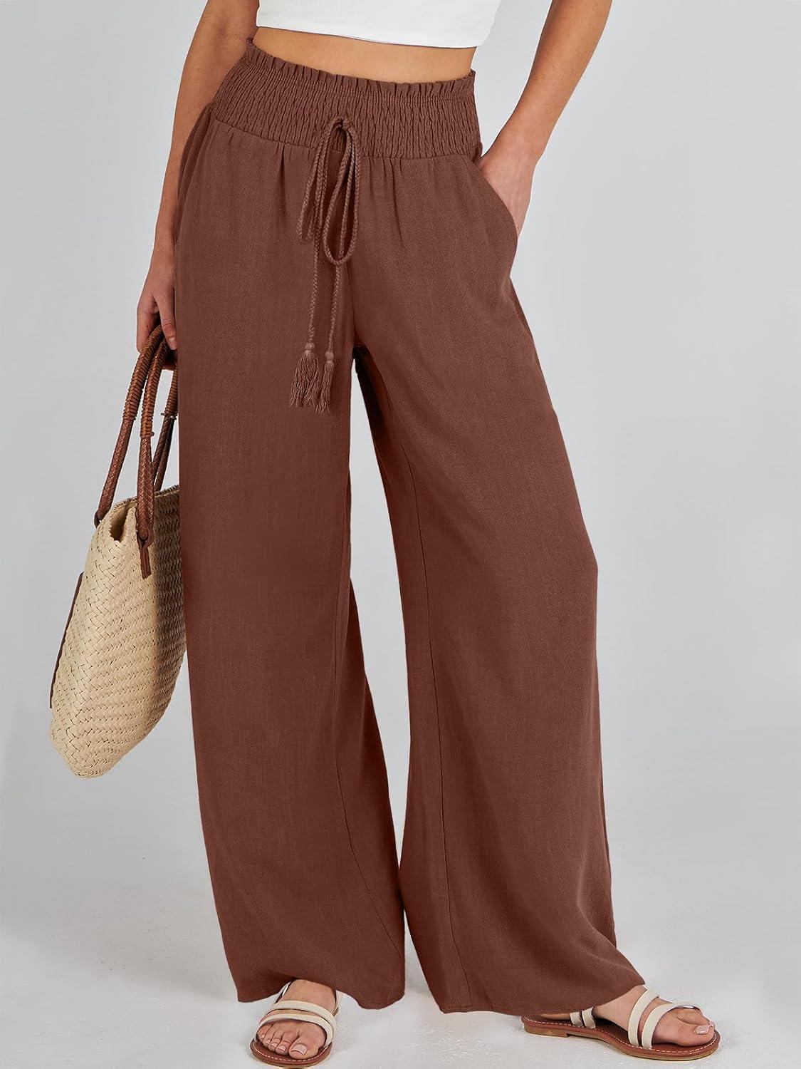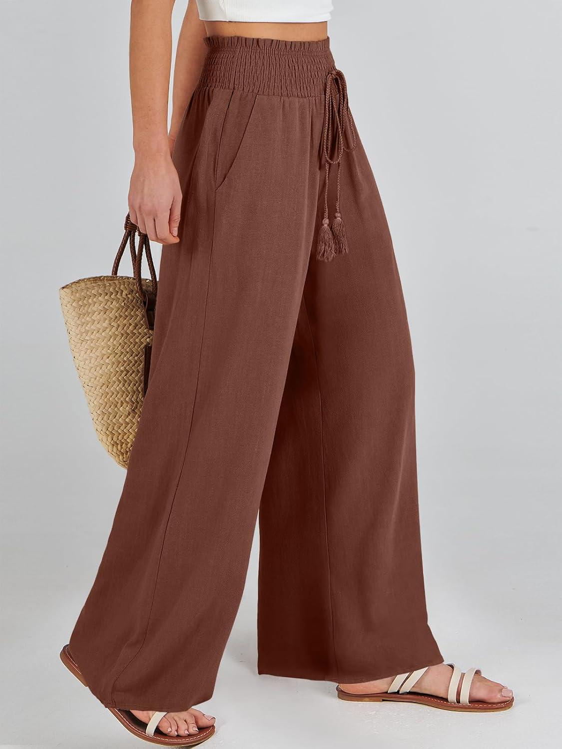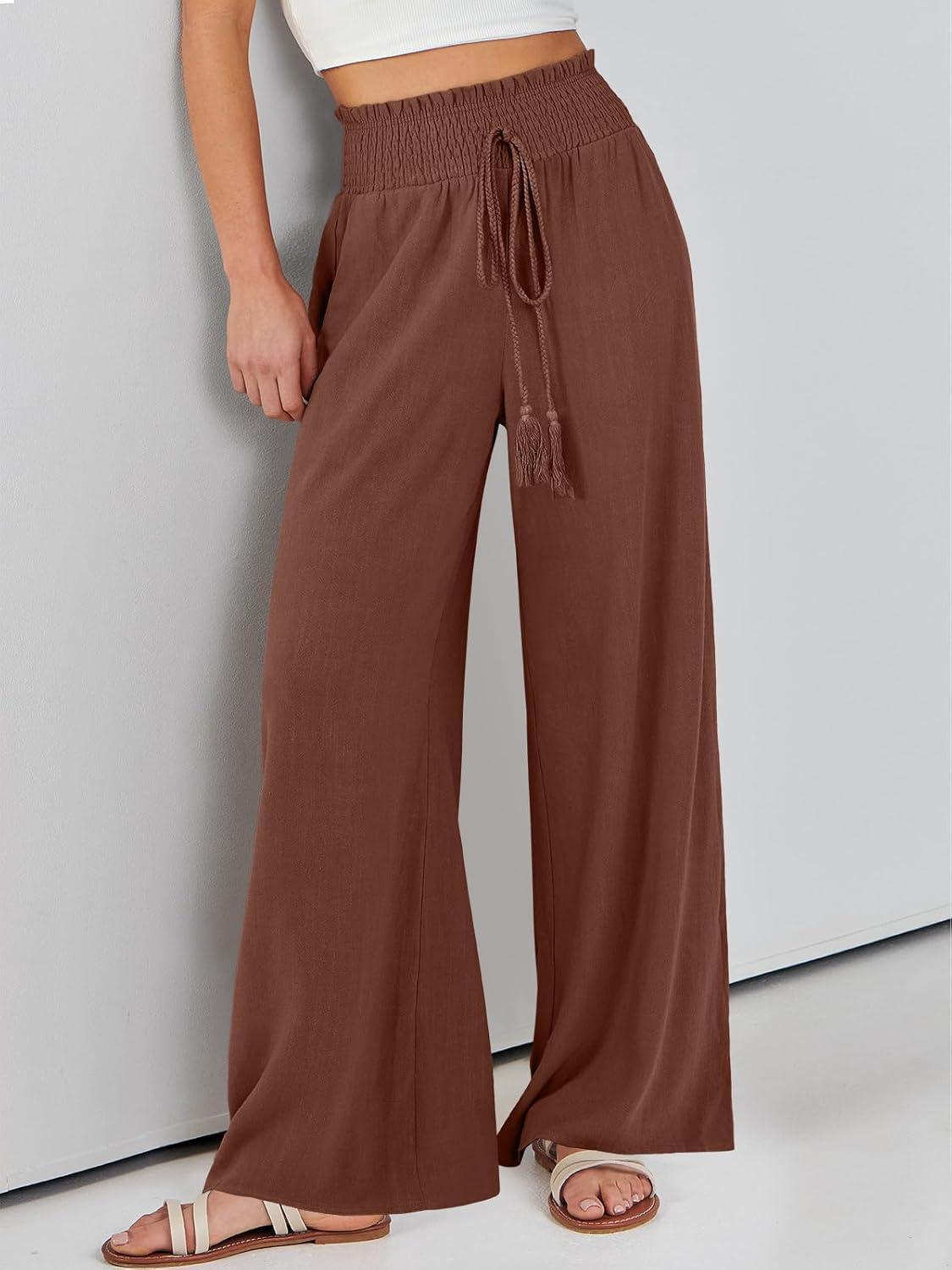 ANRABESS Women’s Linen Pants Summer Casual Palazzo Beach Pant Drawstring High Waist Wide Leg Trousers Vacation Outfits(Red Brown)
