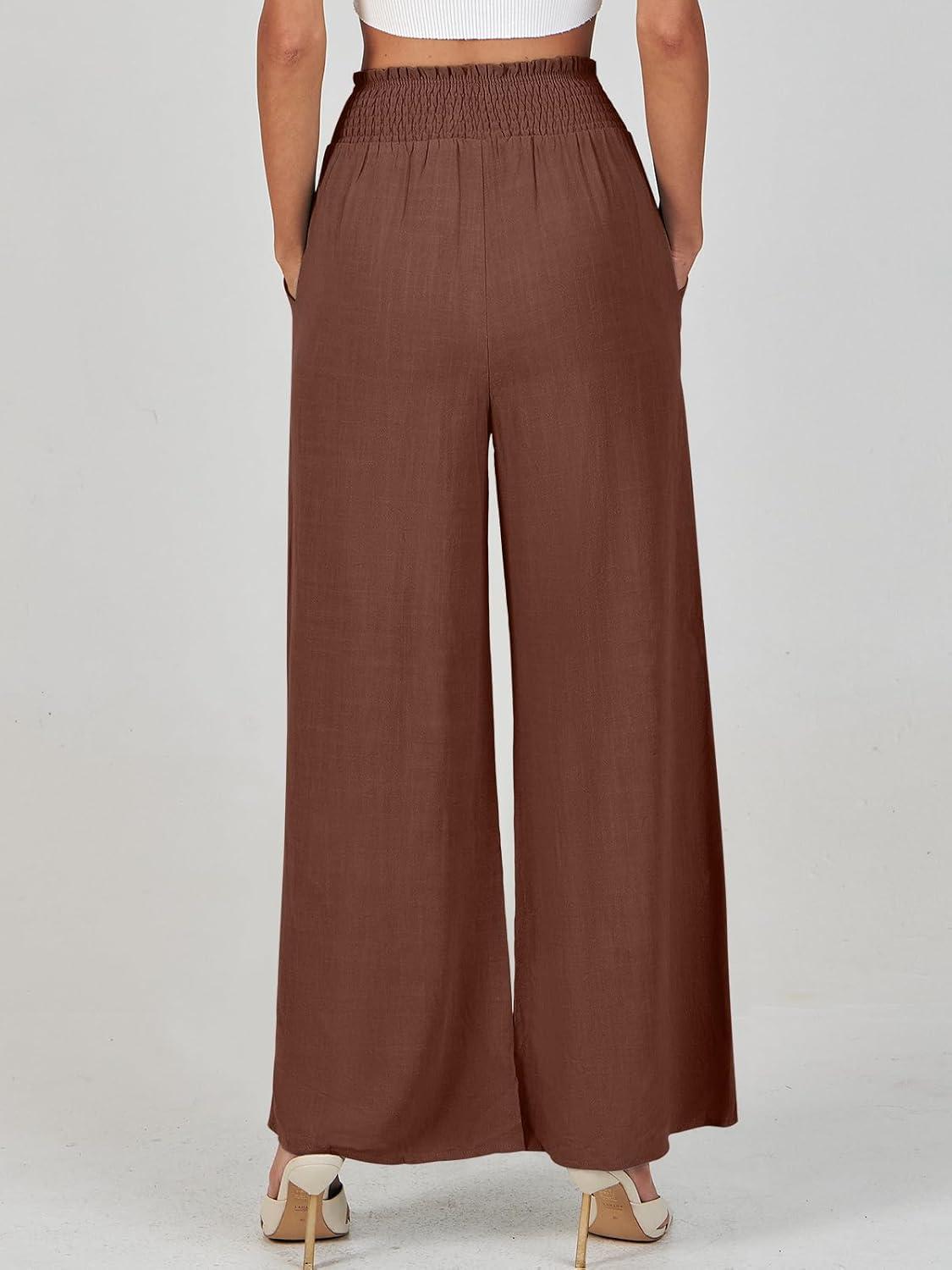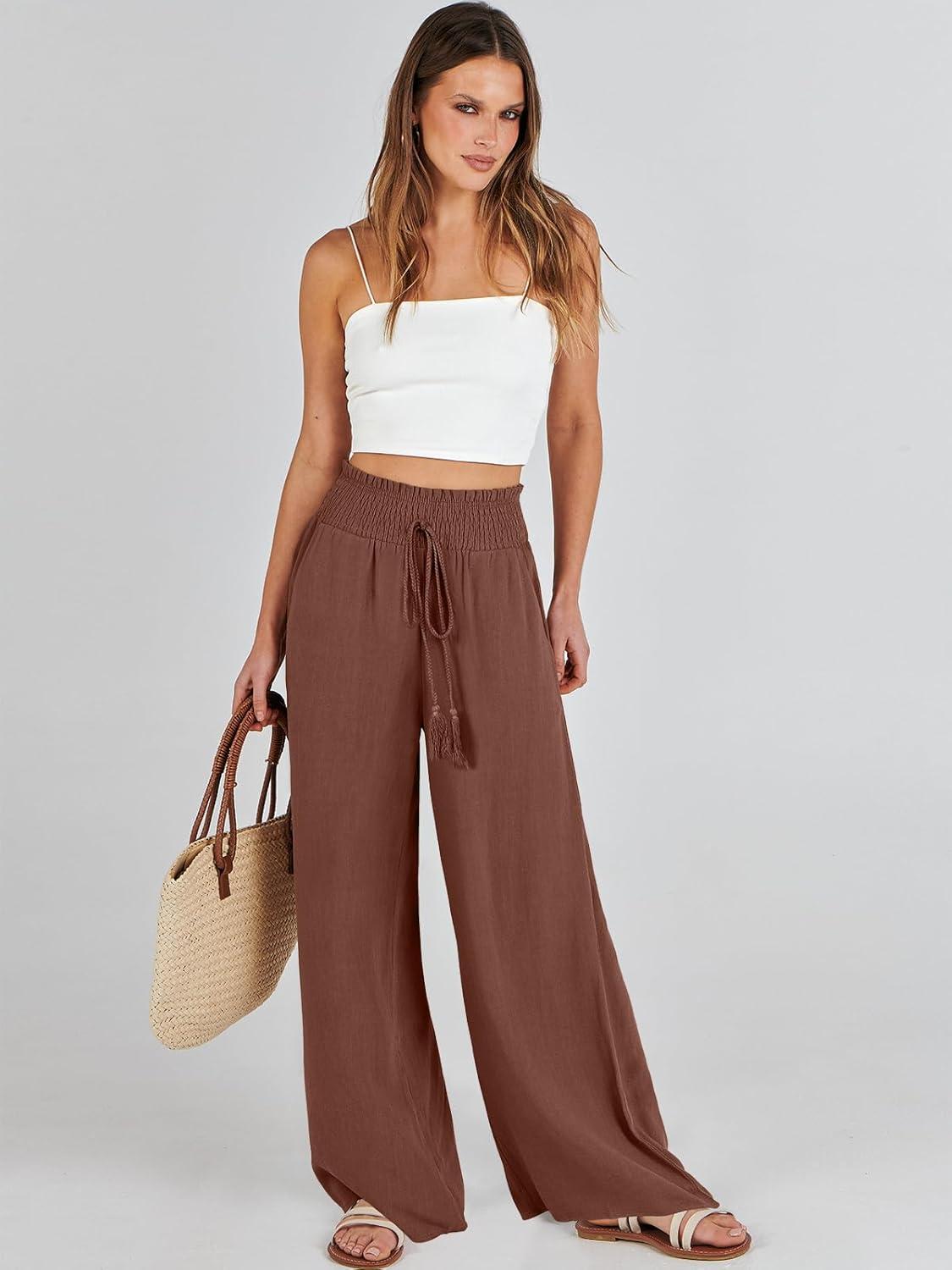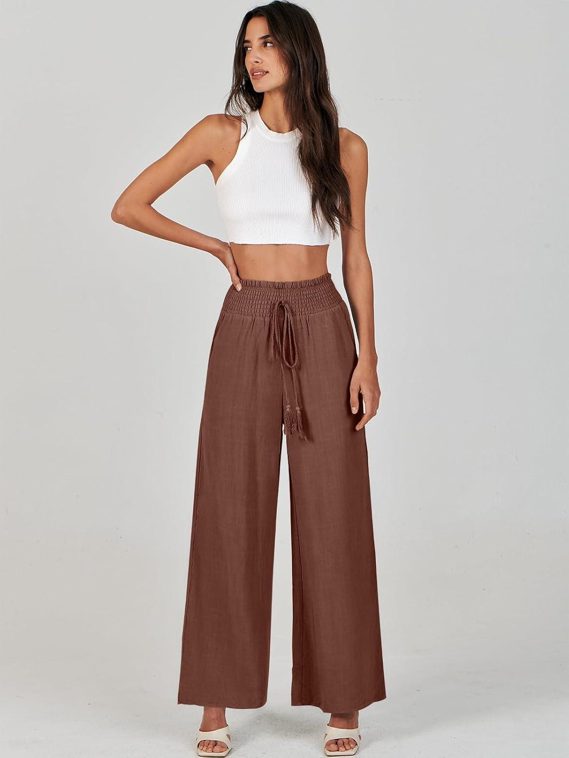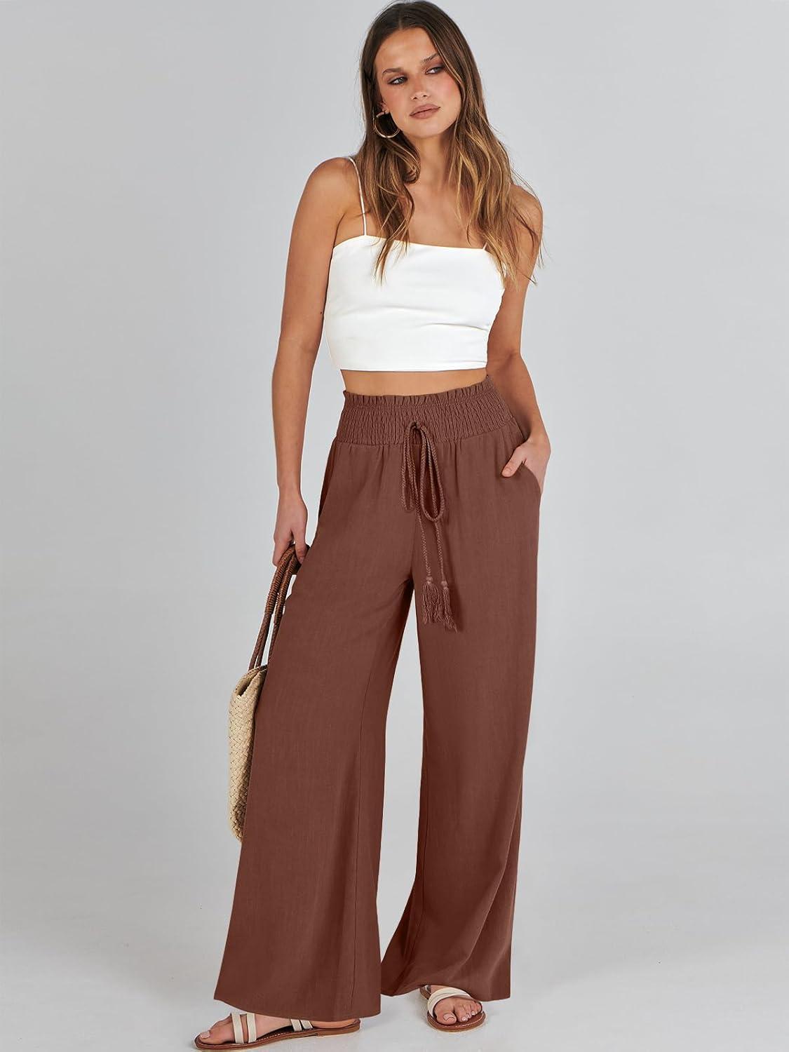 ANRABESS Women’s Linen Pants Summer Casual Palazzo Beach Pant Drawstring High Waist Wide Leg Trousers Vacation Outfits(Red Brown)