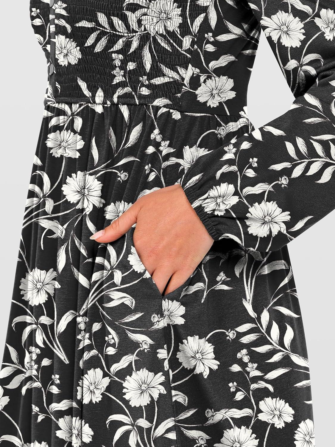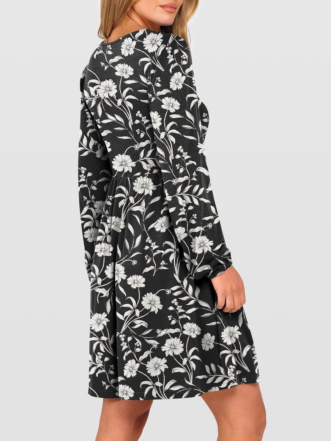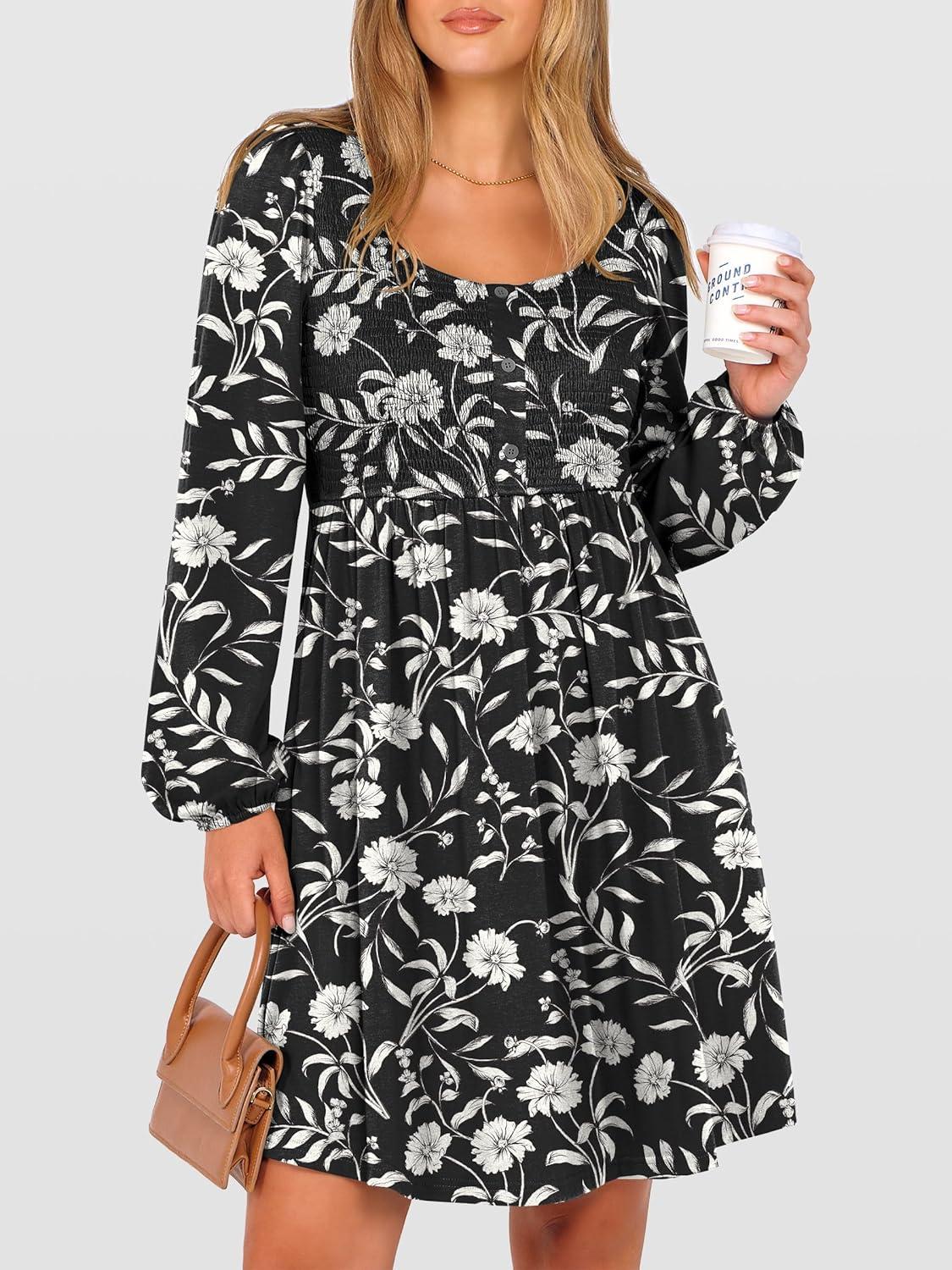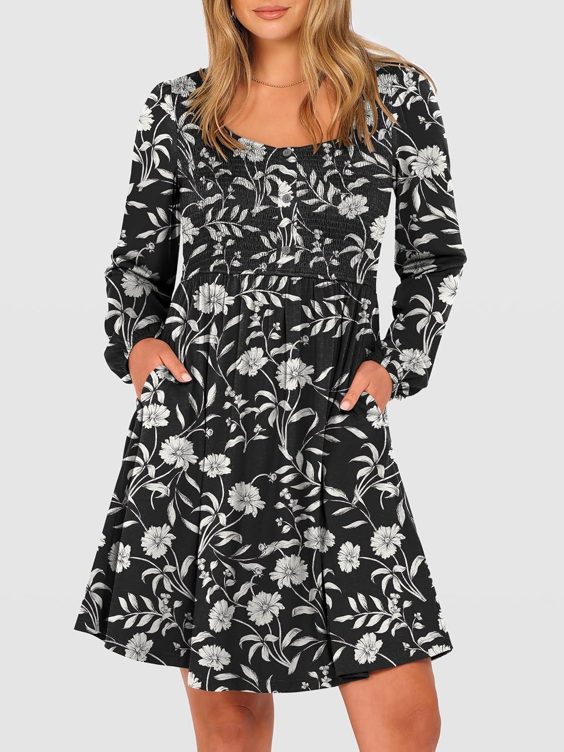 ANRABESS Womens Long Lantern Sleeve Dresses 2025 Fall Casual Smocked A-Line High Waist Flowy Short Dress with Pockets Trendy(Black Floral)