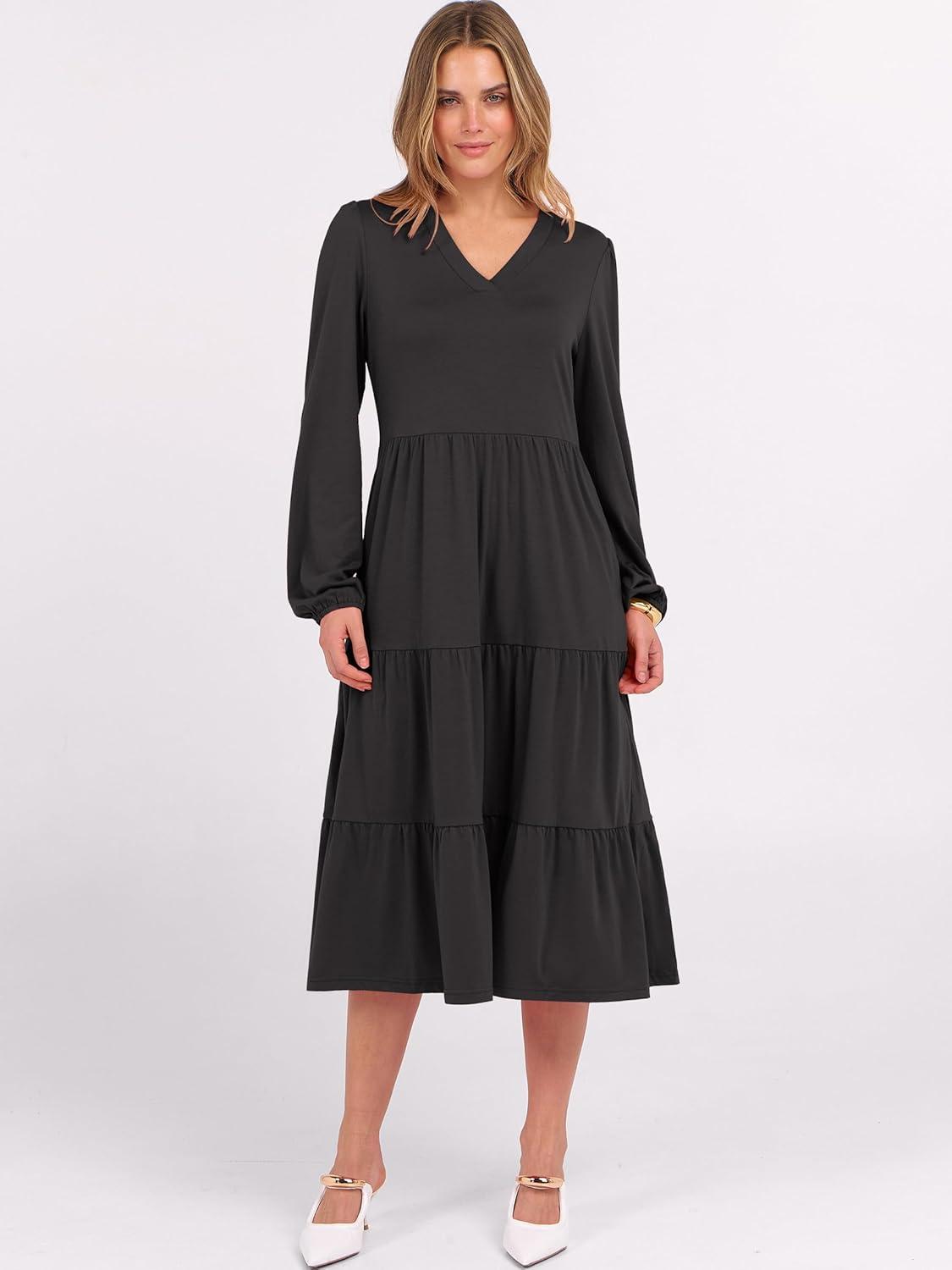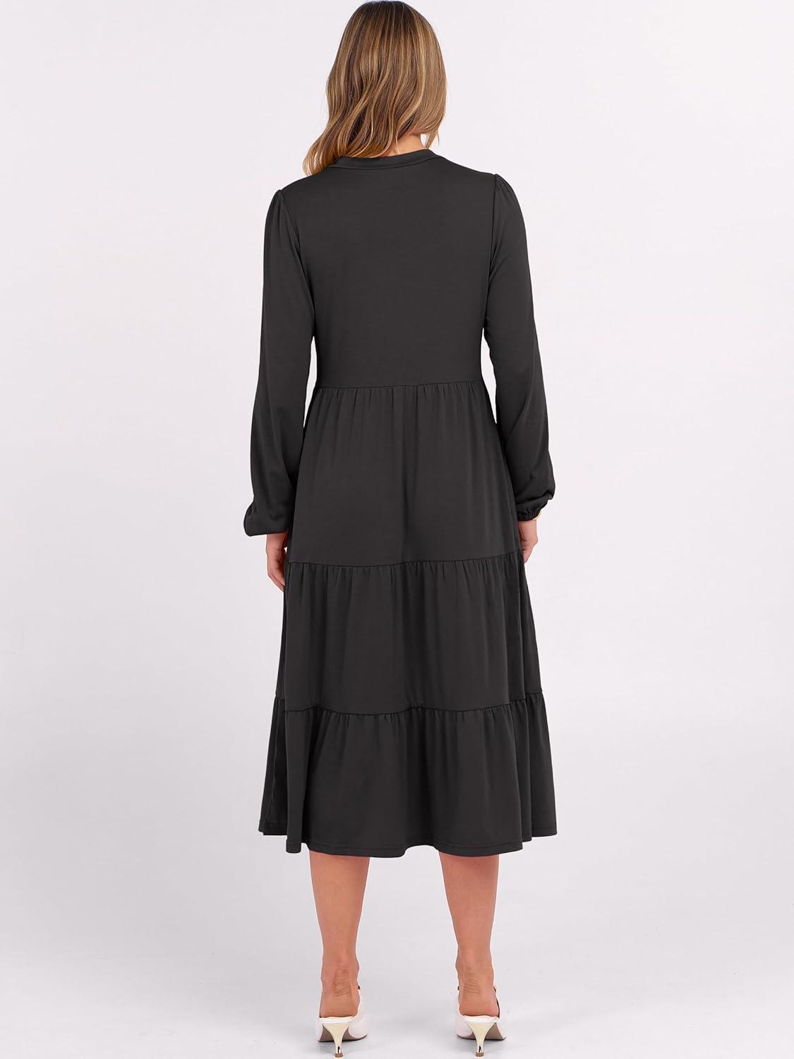 ANRABESS Women’s Long Lantern Sleeve Floral Midi Dresses 2025 Fall V Neck Casual Flowy A-line Tiered Boho Vacation Long Dress(Black)