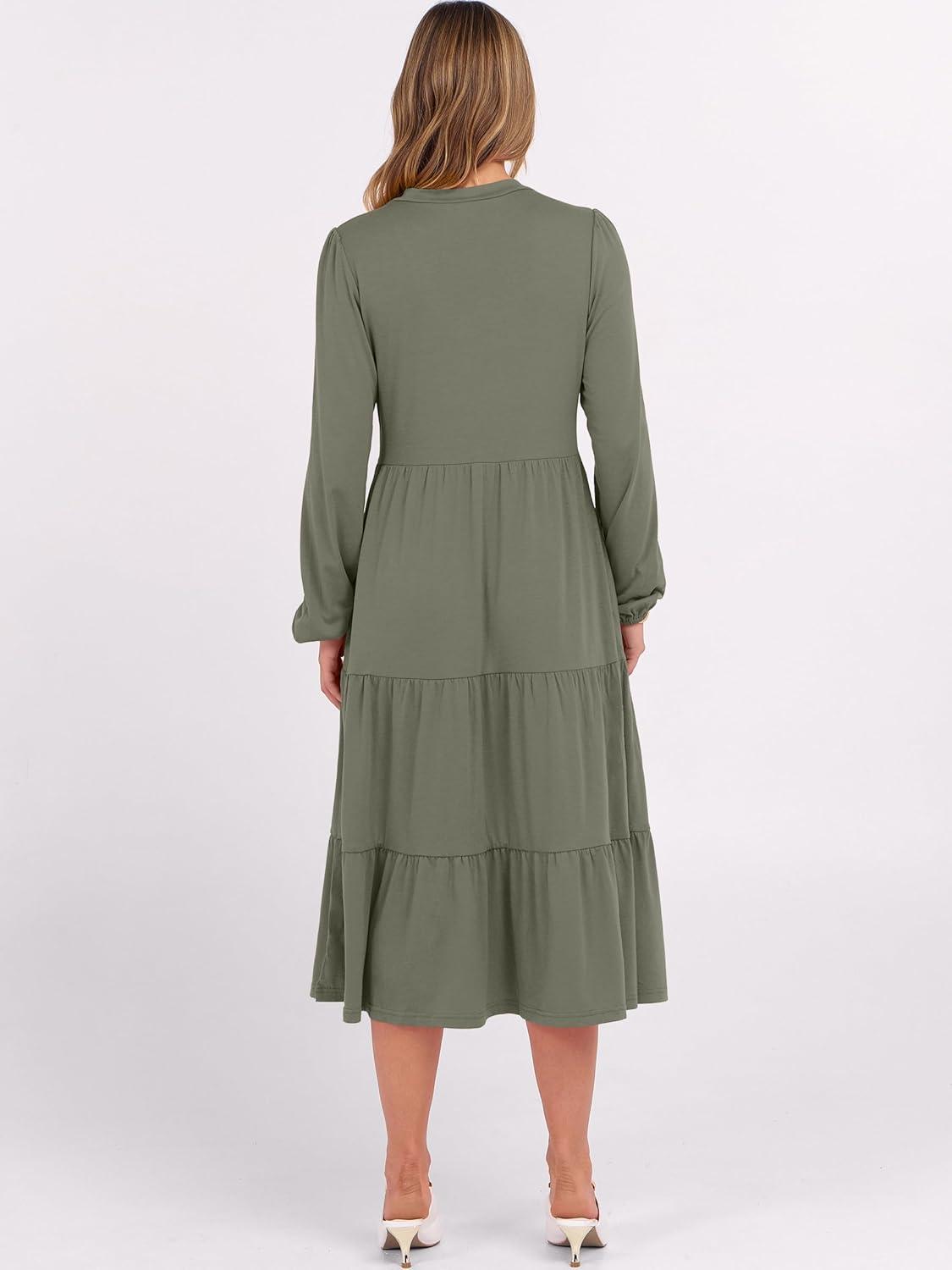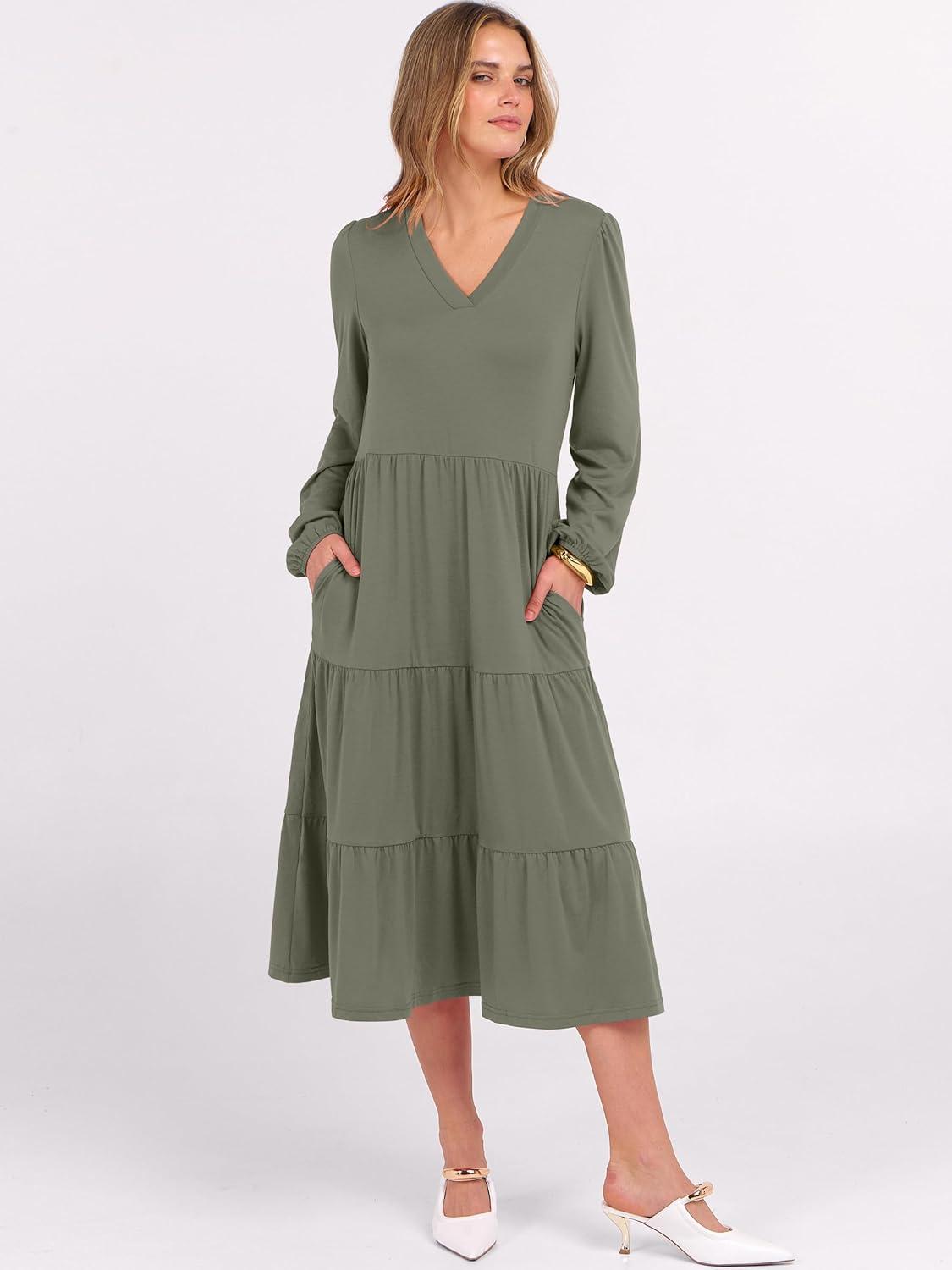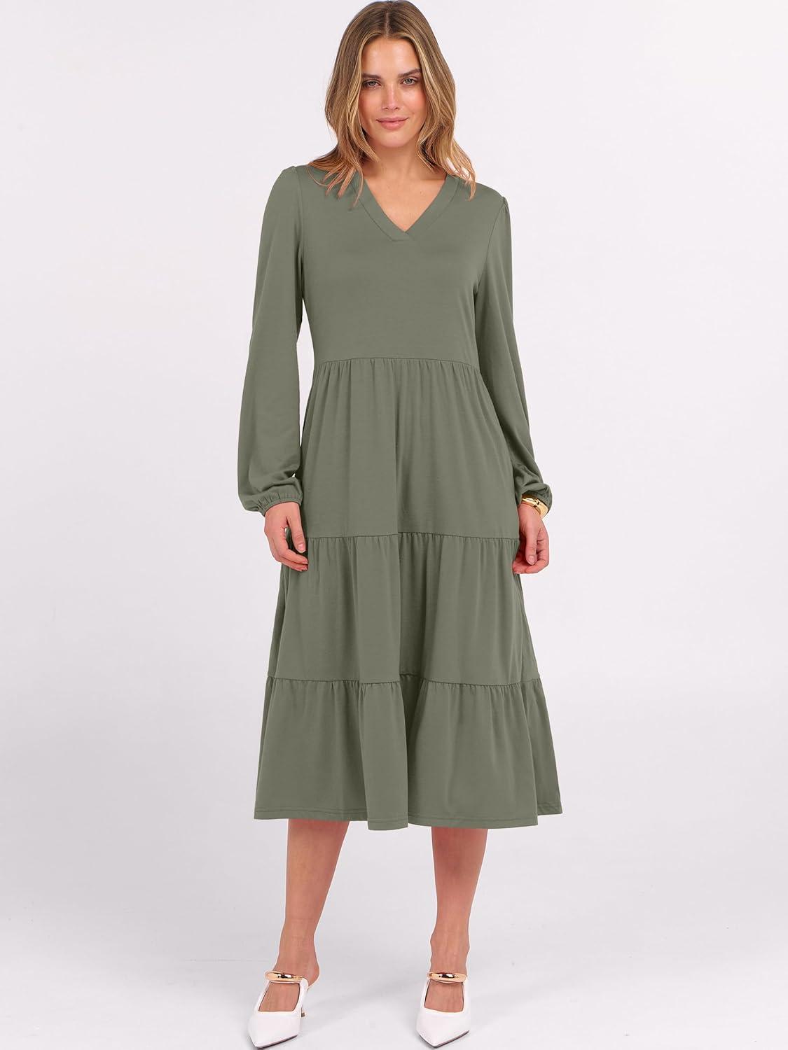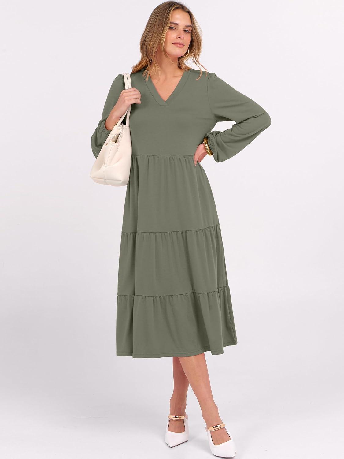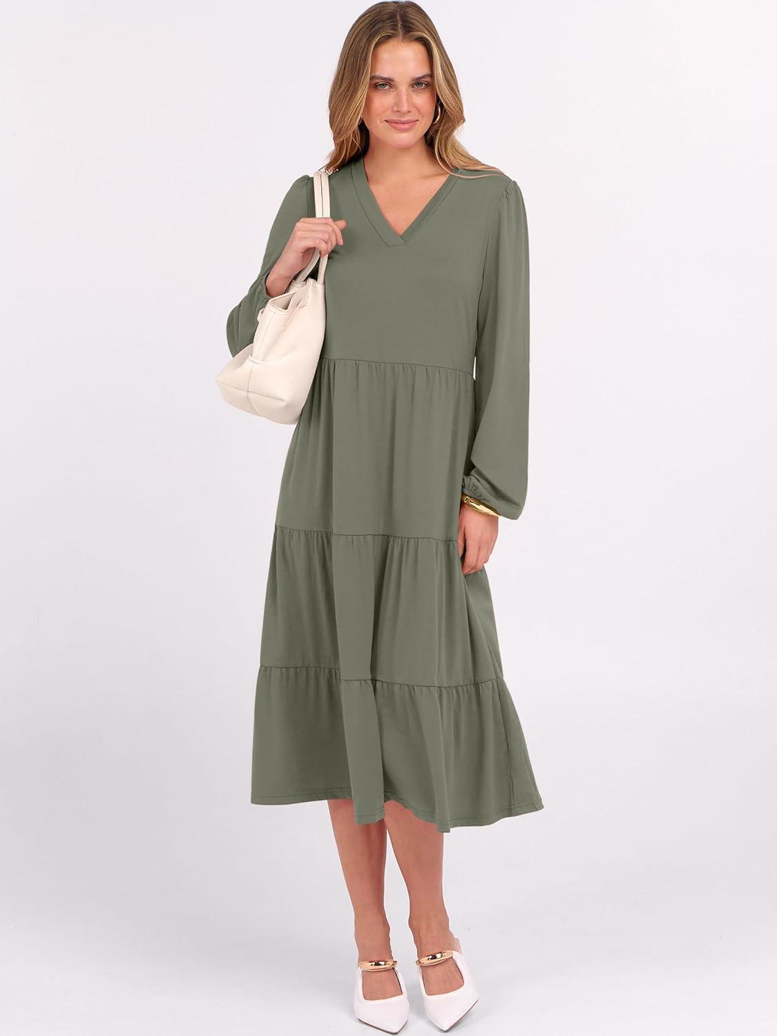 ANRABESS Women’s Long Lantern Sleeve Floral Midi Dresses 2025 Fall V Neck Casual Flowy A-line Tiered Boho Vacation Long Dress(Olive Green)