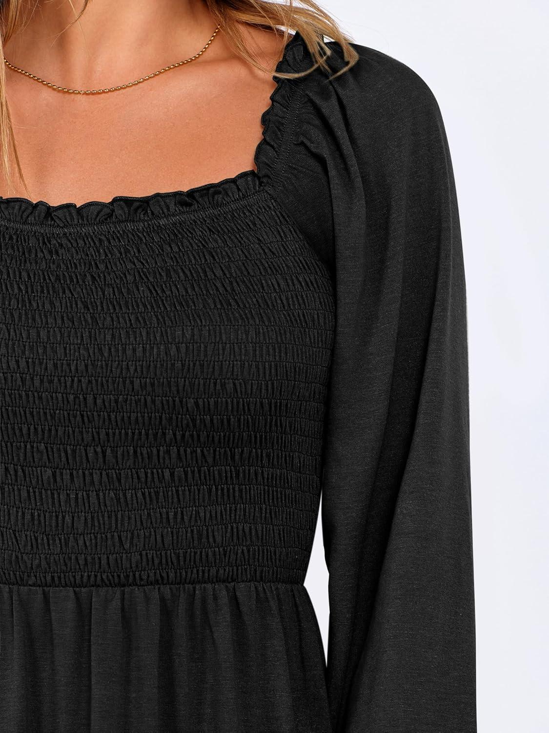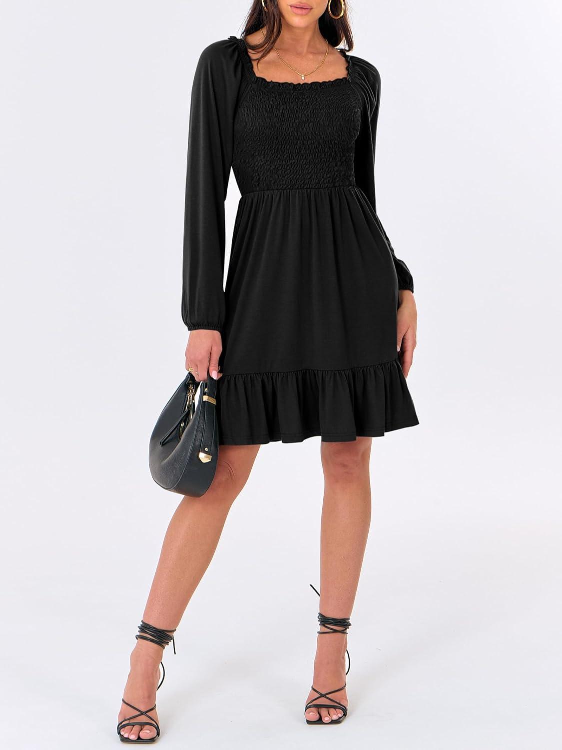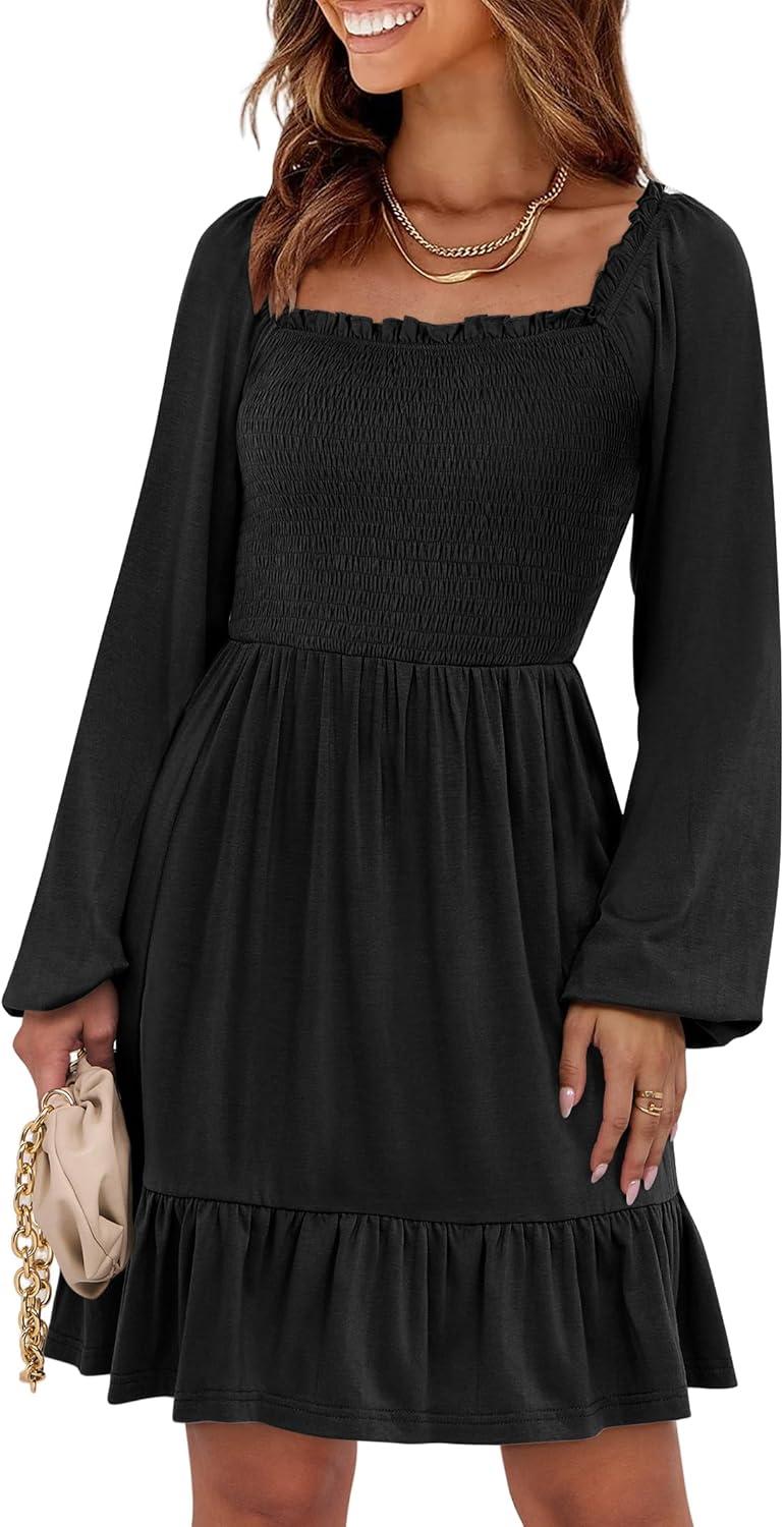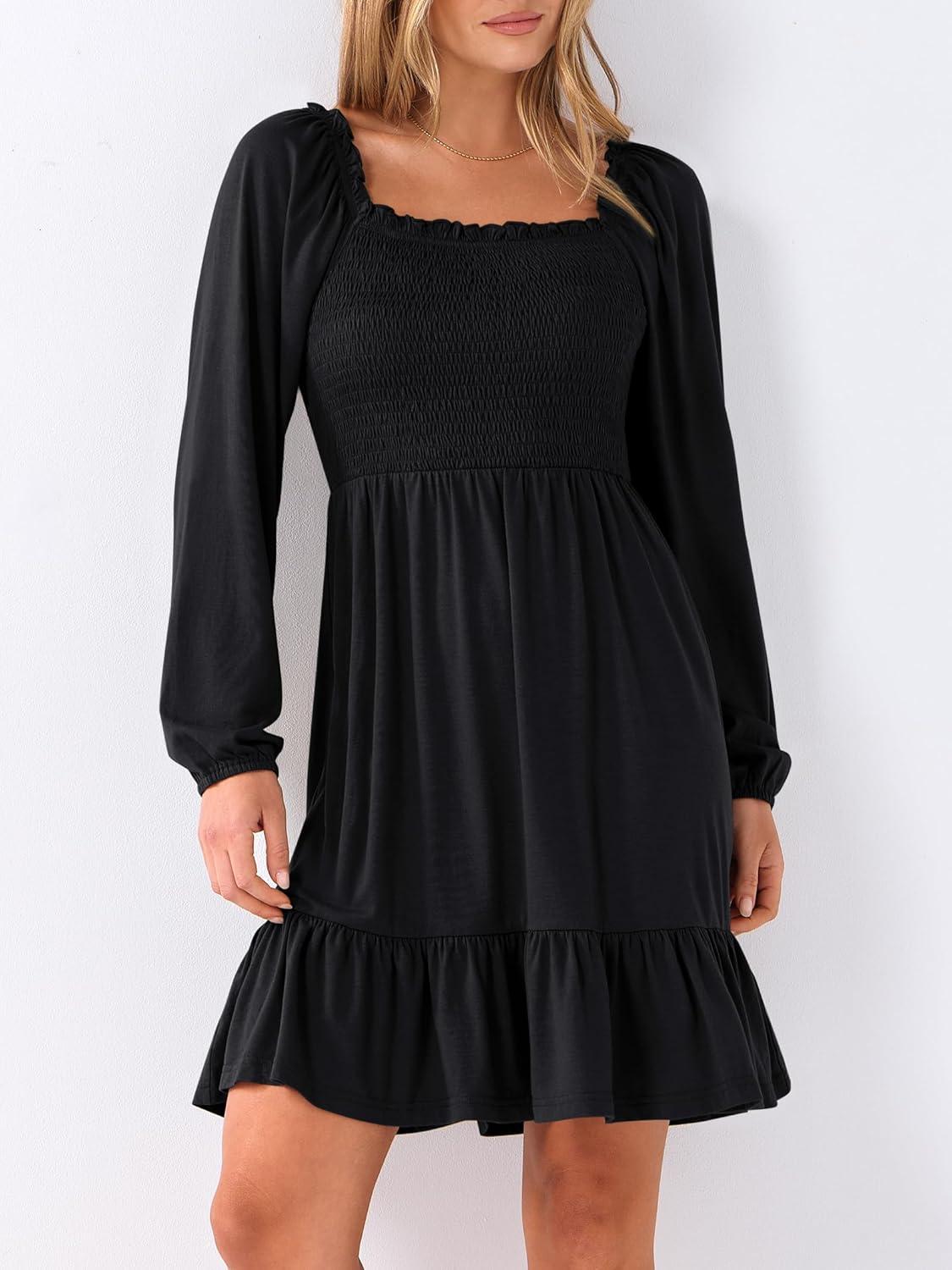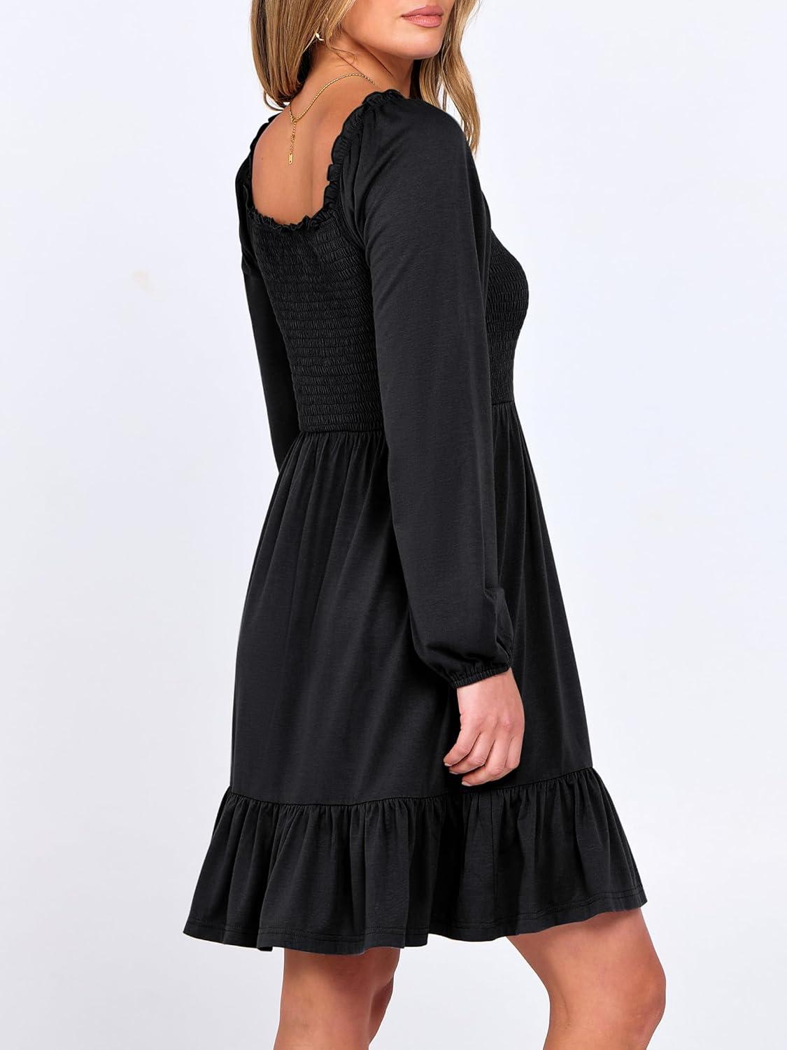 ANRABESS Womens Long Lantern Sleeve Square Neck Dress Smocked Tiered High Waist Ruffle Flowy Swing 2025 Fall Short Dresses(Black)