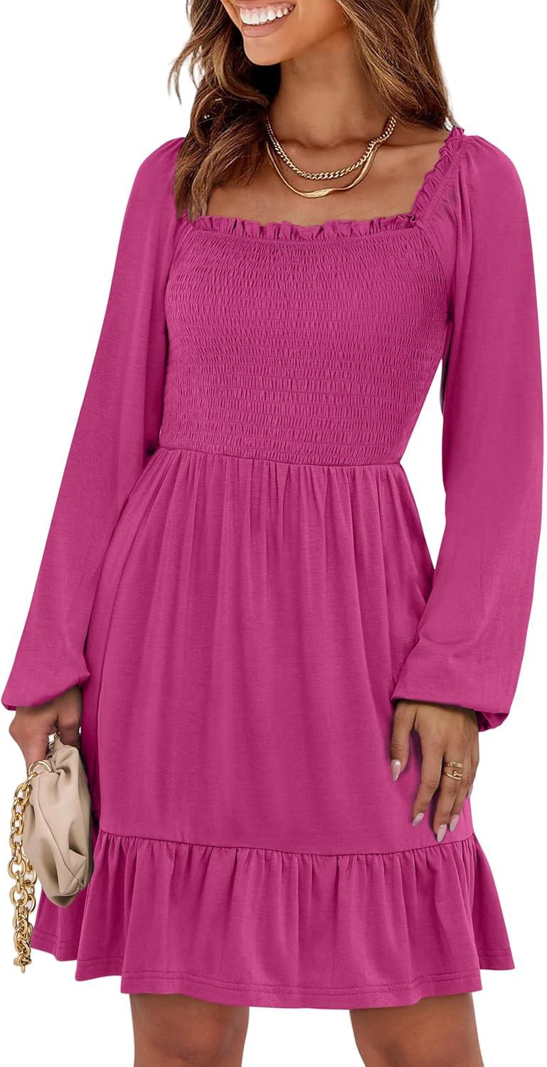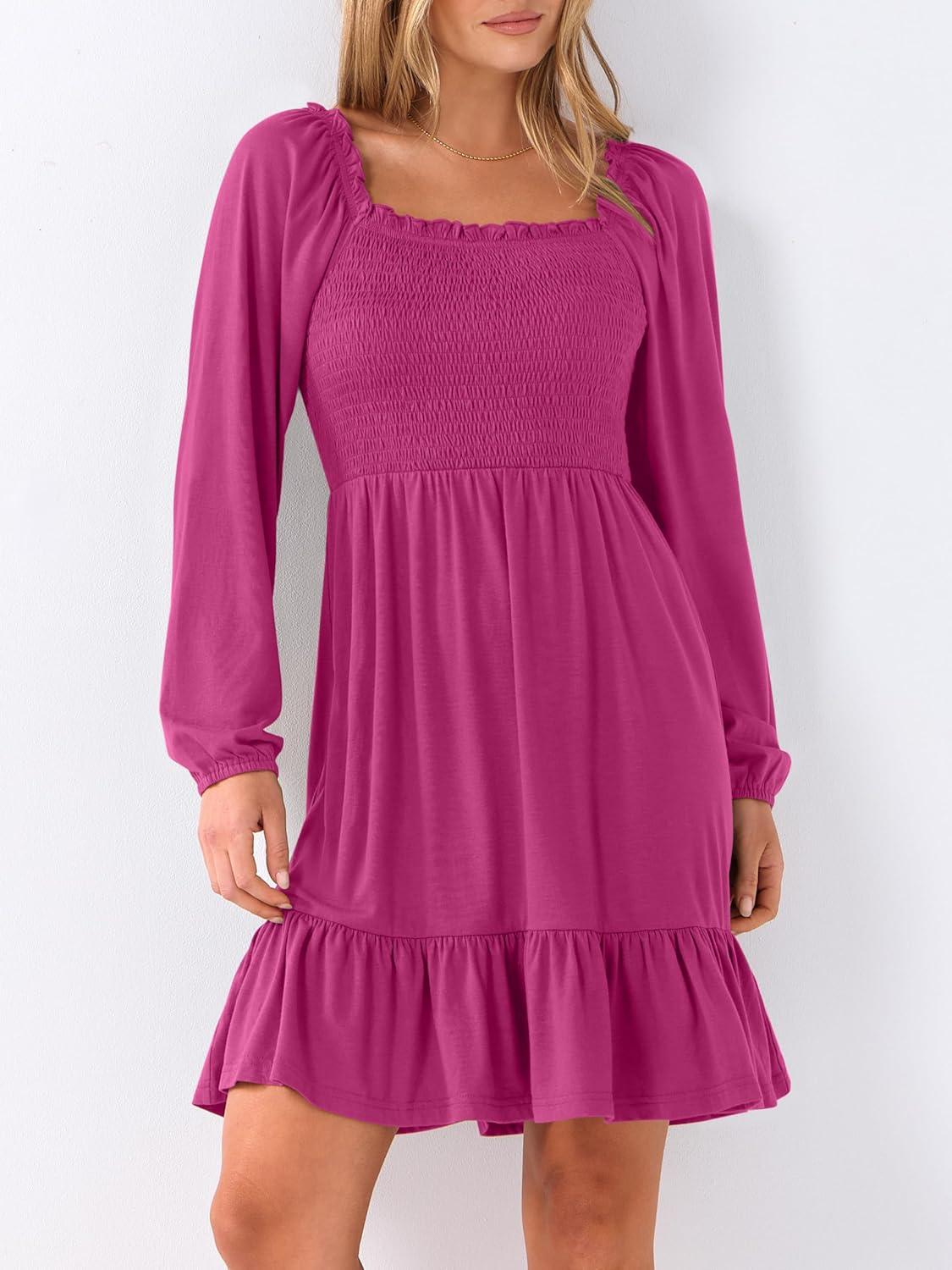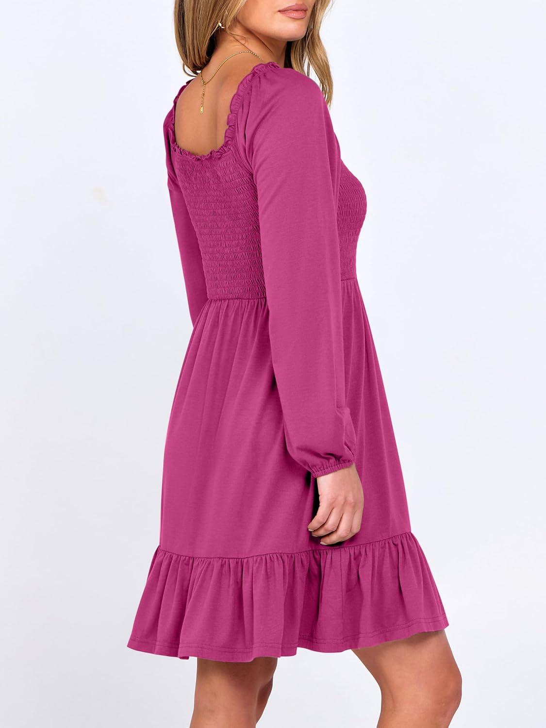 ANRABESS Womens Long Lantern Sleeve Square Neck Dress Smocked Tiered High Waist Ruffle Flowy Swing 2025 Fall Short Dresses(Hot Pink)