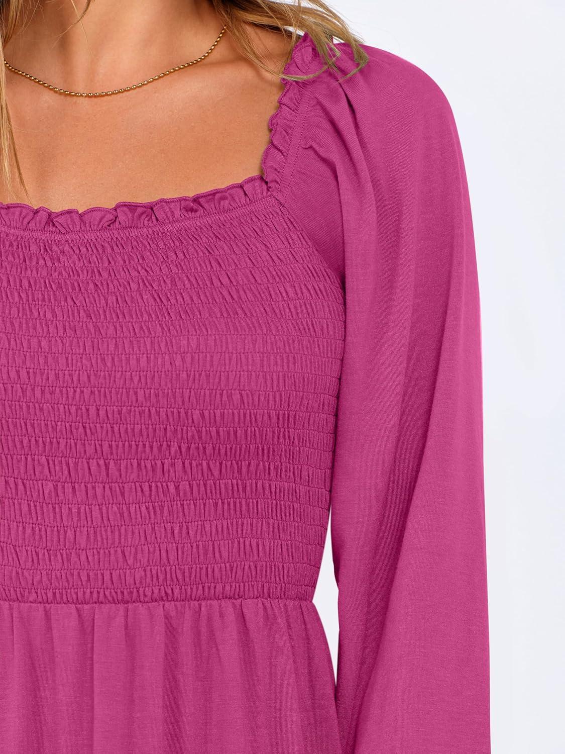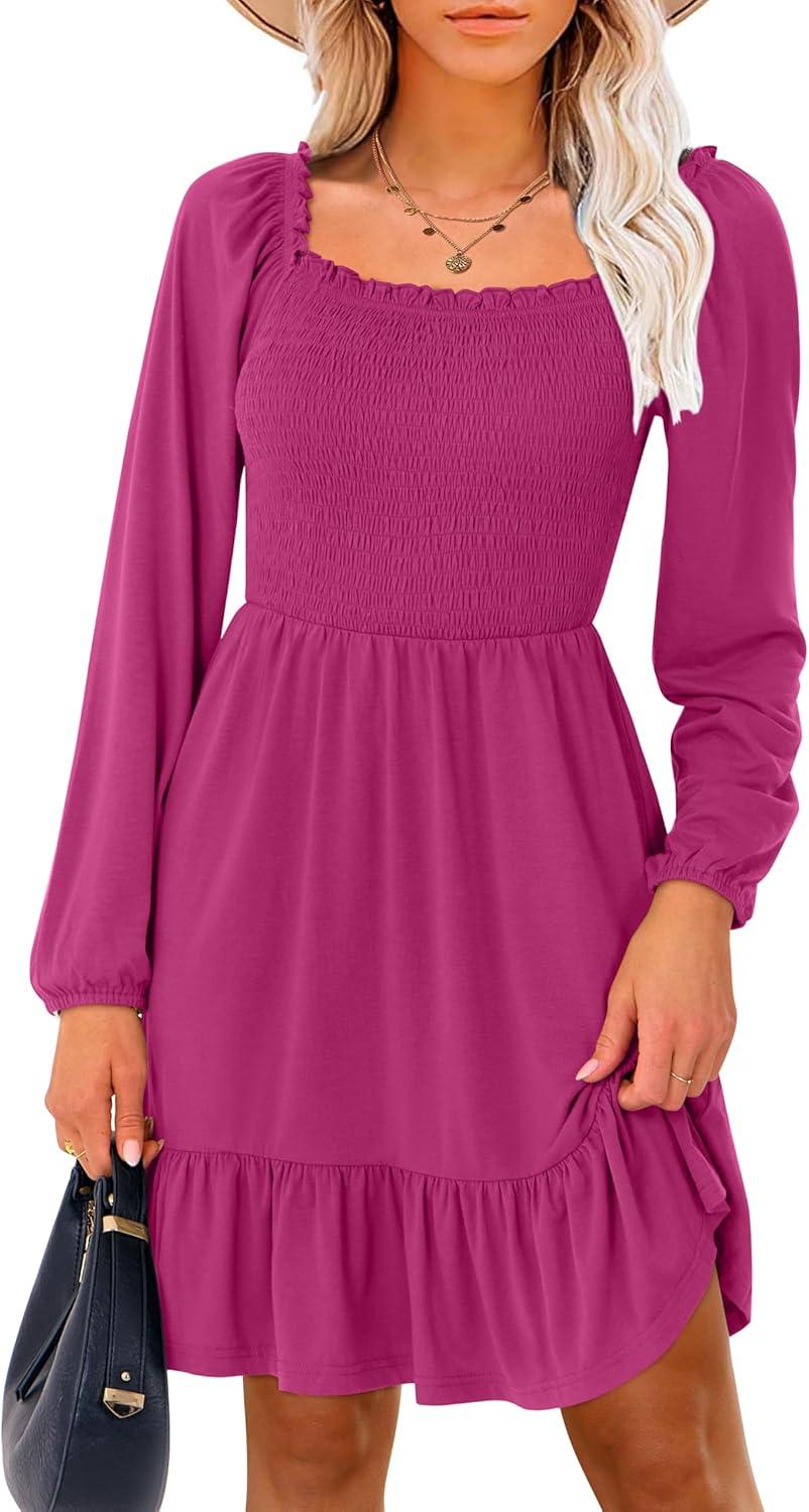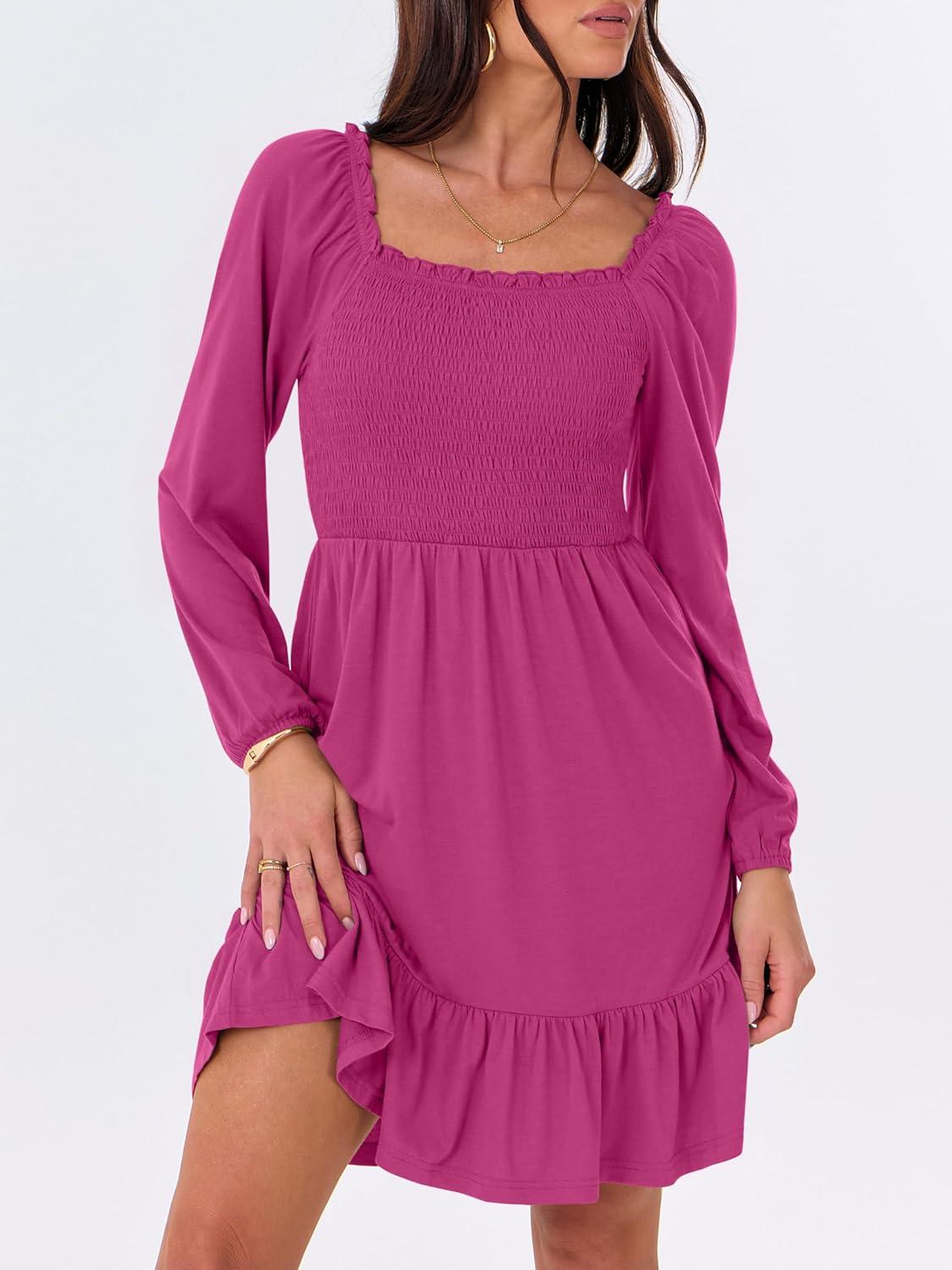 ANRABESS Womens Long Lantern Sleeve Square Neck Dress Smocked Tiered High Waist Ruffle Flowy Swing 2025 Fall Short Dresses(Hot Pink)