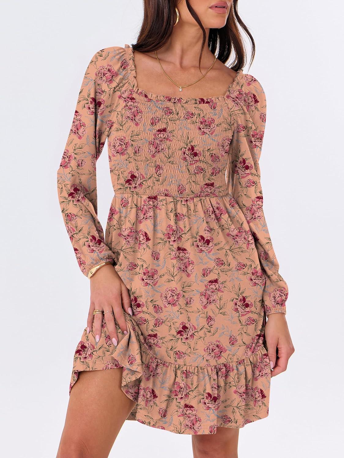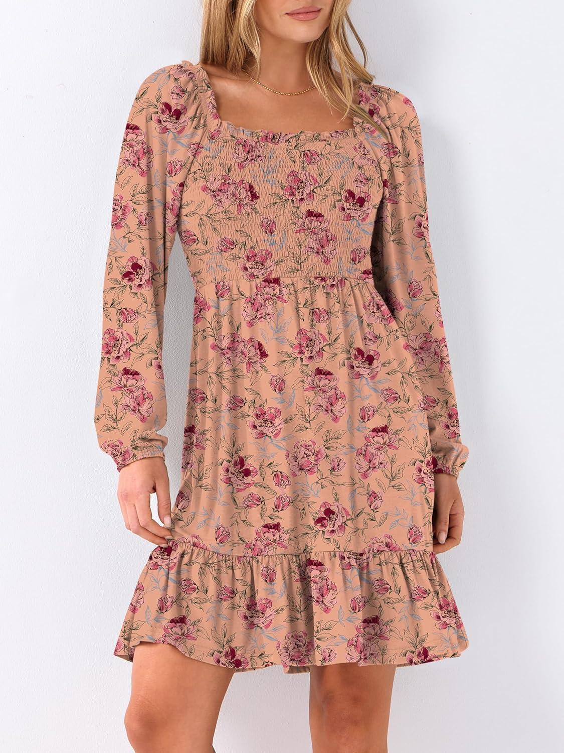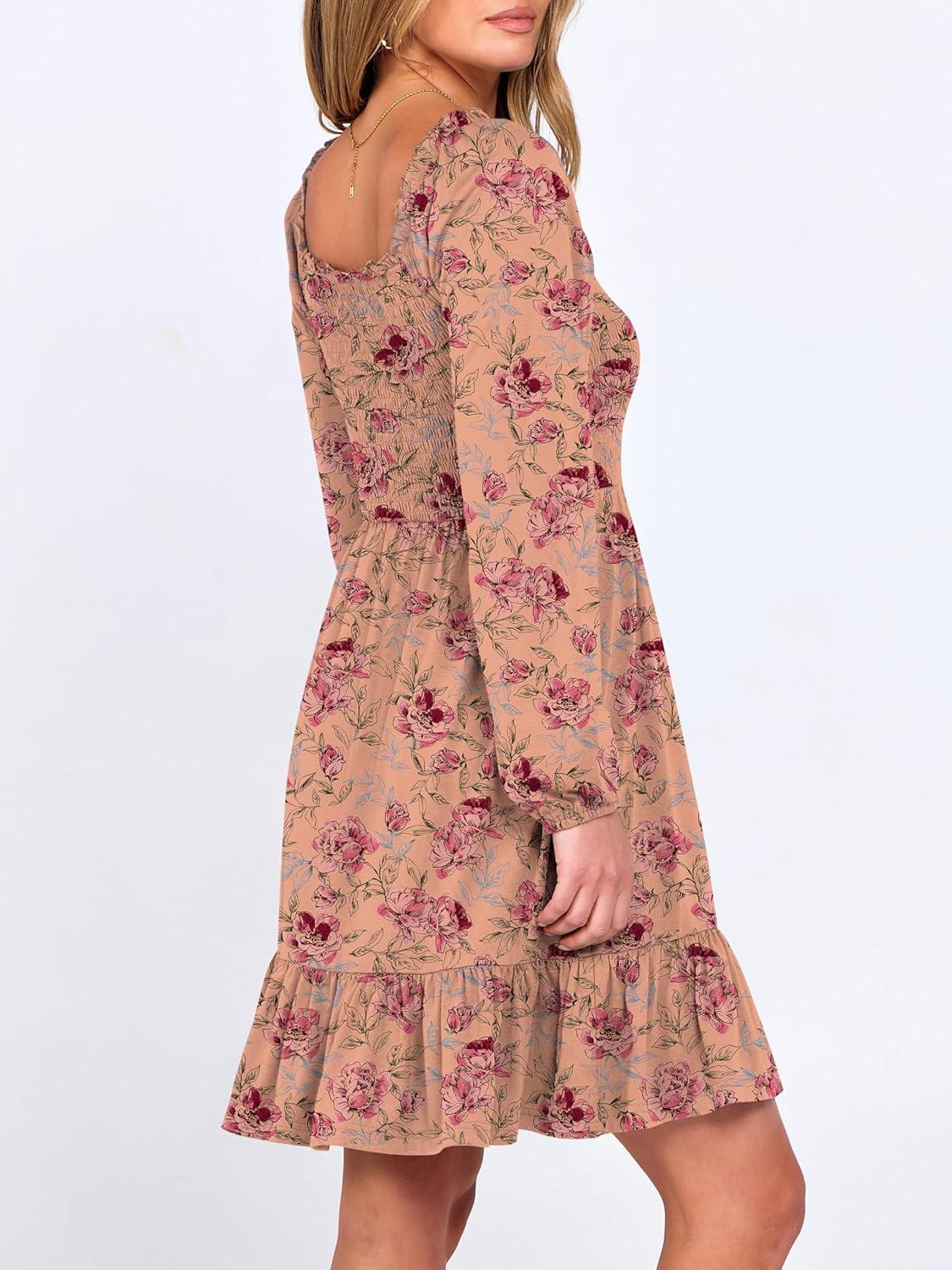 ANRABESS Womens Long Lantern Sleeve Square Neck Dress Smocked Tiered High Waist Ruffle Flowy Swing 2025 Fall Short Dresses(Print Rose Pink)