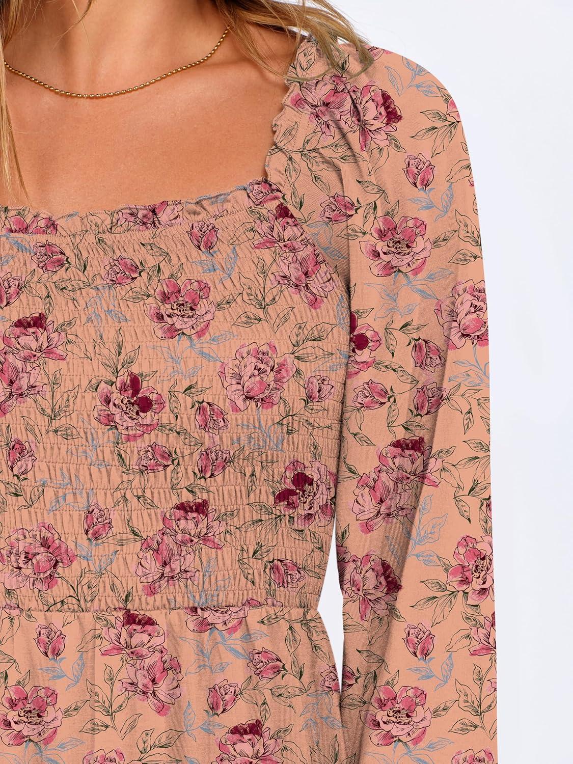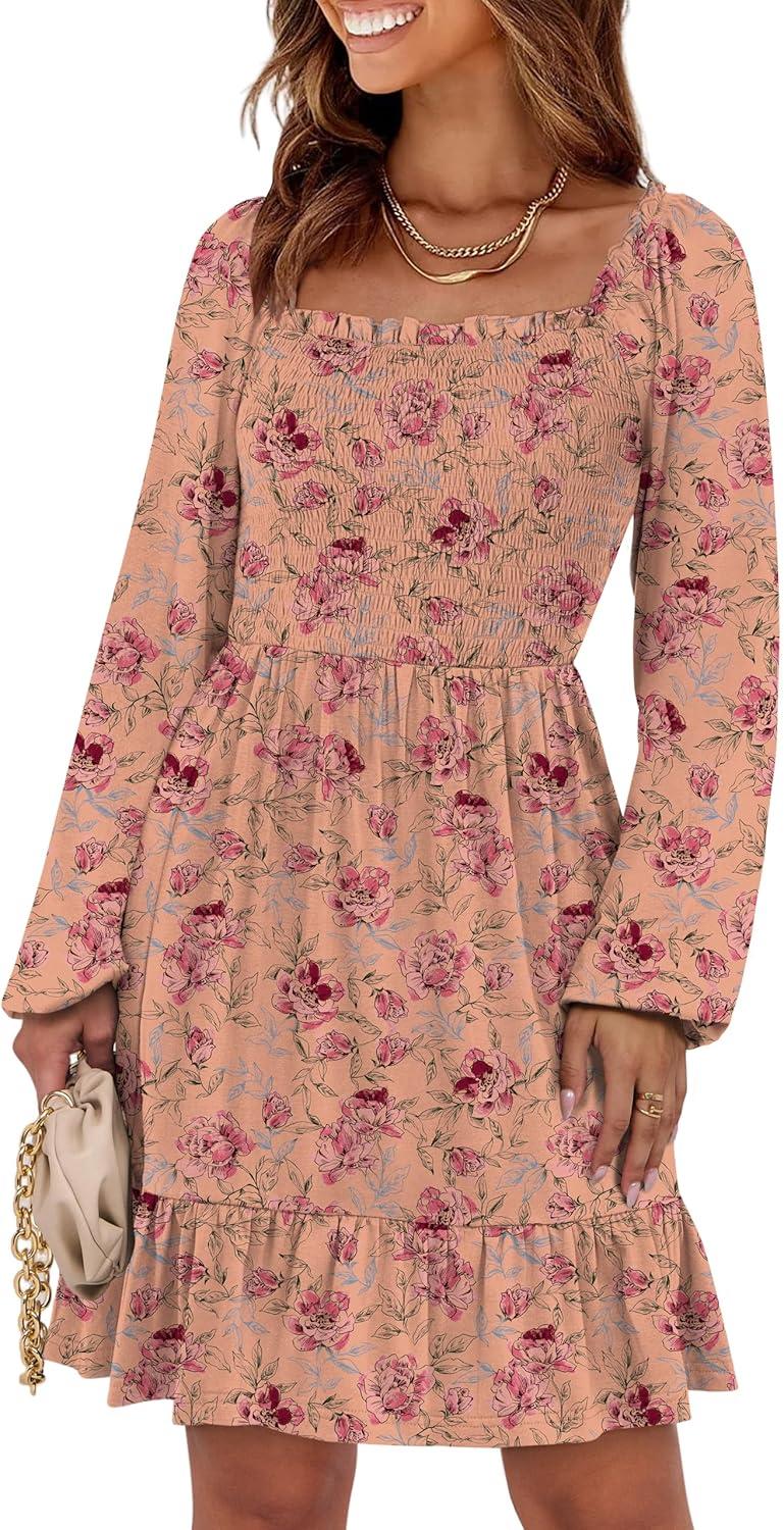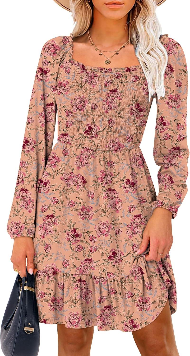 ANRABESS Womens Long Lantern Sleeve Square Neck Dress Smocked Tiered High Waist Ruffle Flowy Swing 2025 Fall Short Dresses(Print Rose Pink)
