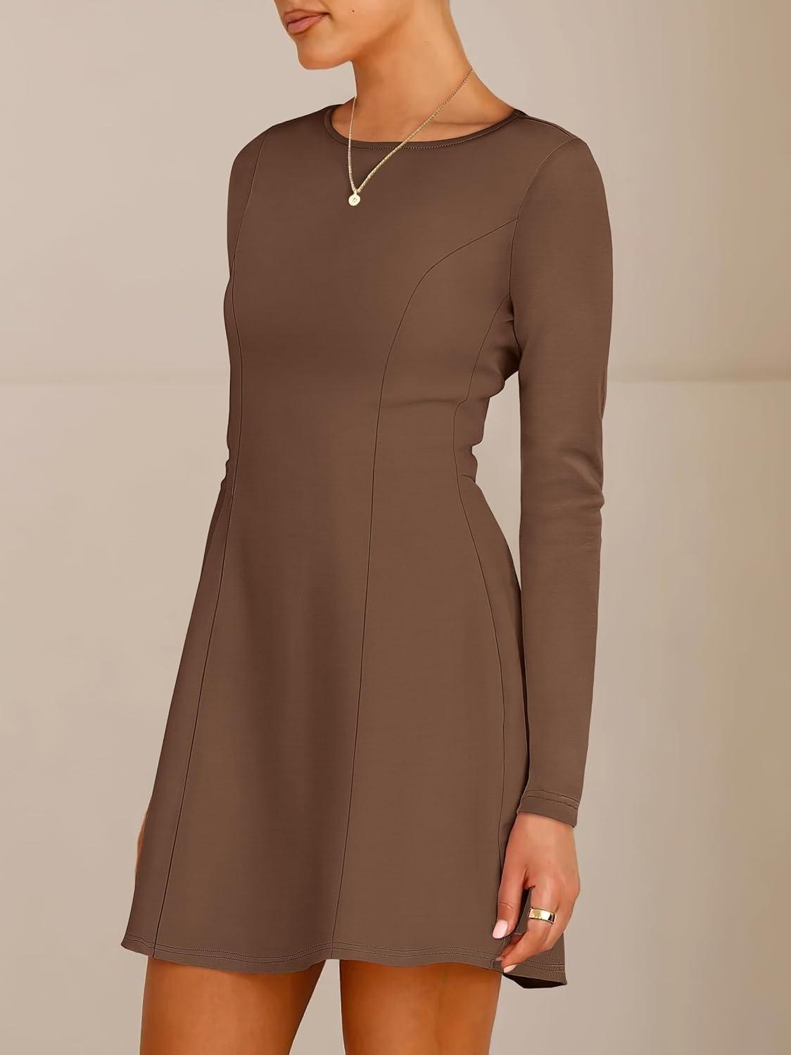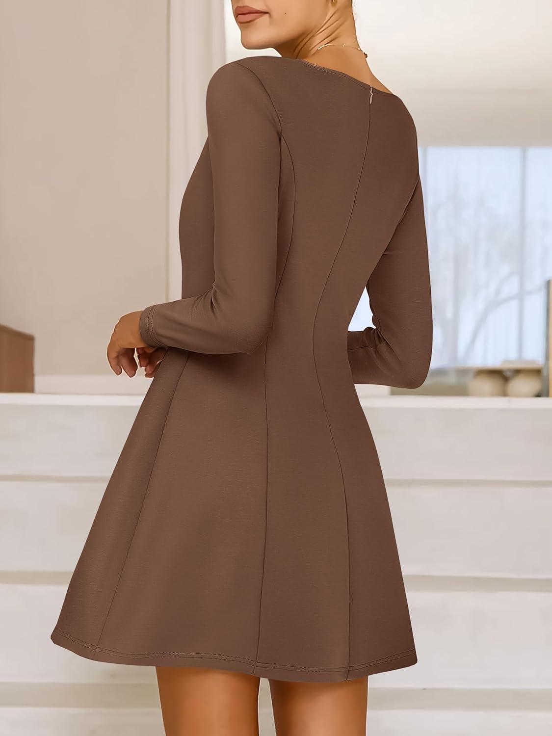 ANRABESS Women’s Long Sleeve A-Line Mini Dress 2025 Fall Boat Neck Semi Formal Fit and Flare Casual Business Short Dresses(Brown)