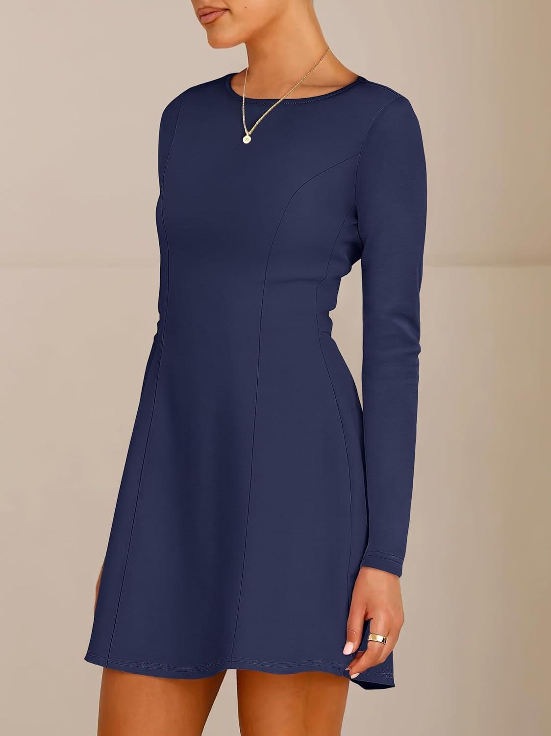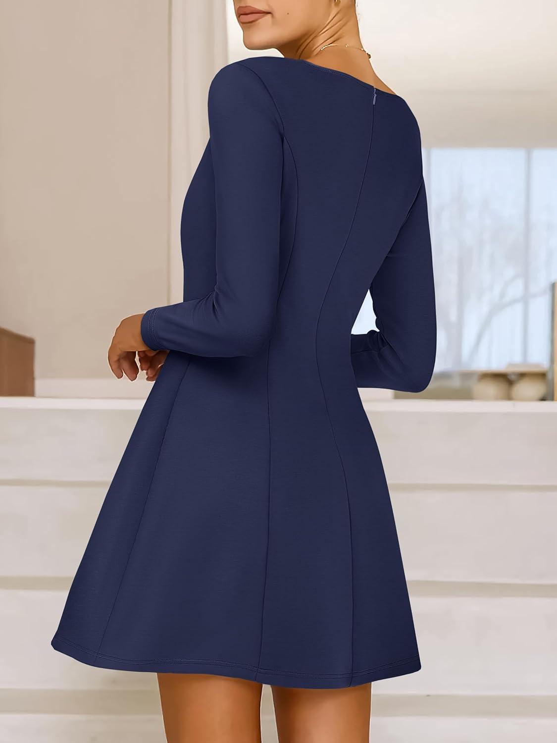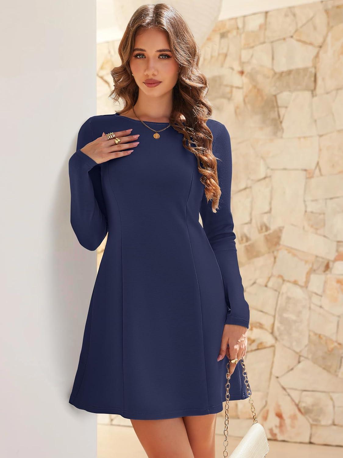 ANRABESS Women’s Long Sleeve A-Line Mini Dress 2025 Fall Boat Neck Semi Formal Fit and Flare Casual Business Short Dresses(Navy Blue)