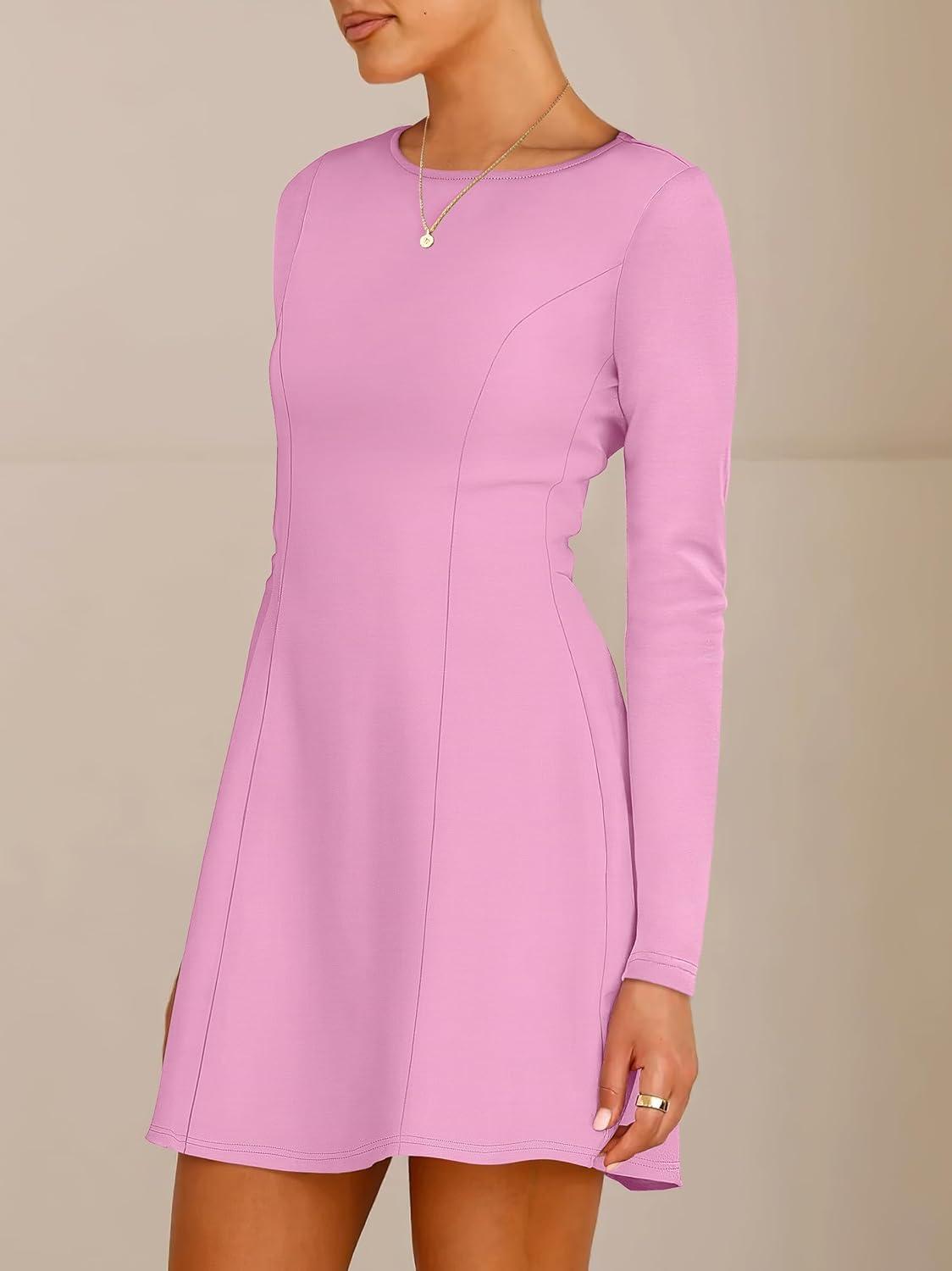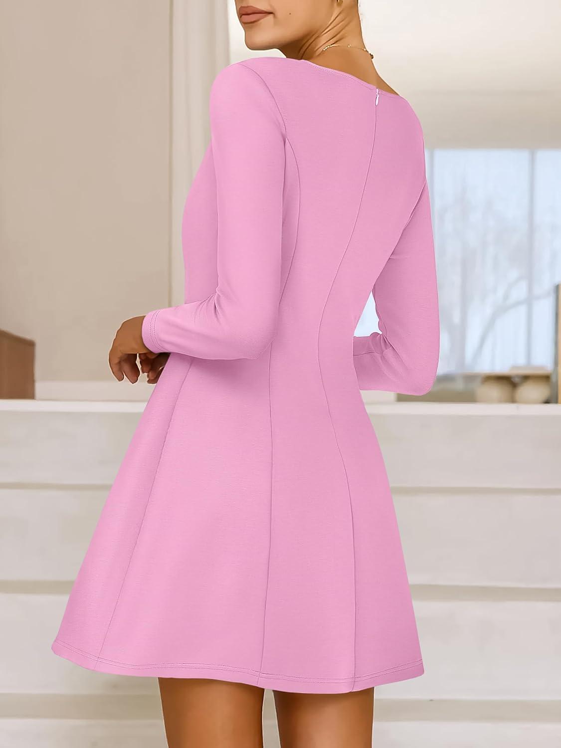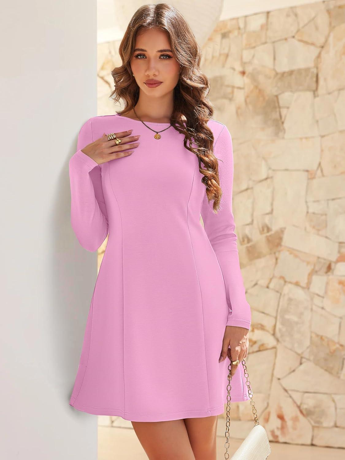 ANRABESS Women’s Long Sleeve A-Line Mini Dress 2025 Fall Boat Neck Semi Formal Fit and Flare Casual Business Short Dresses(Pink)