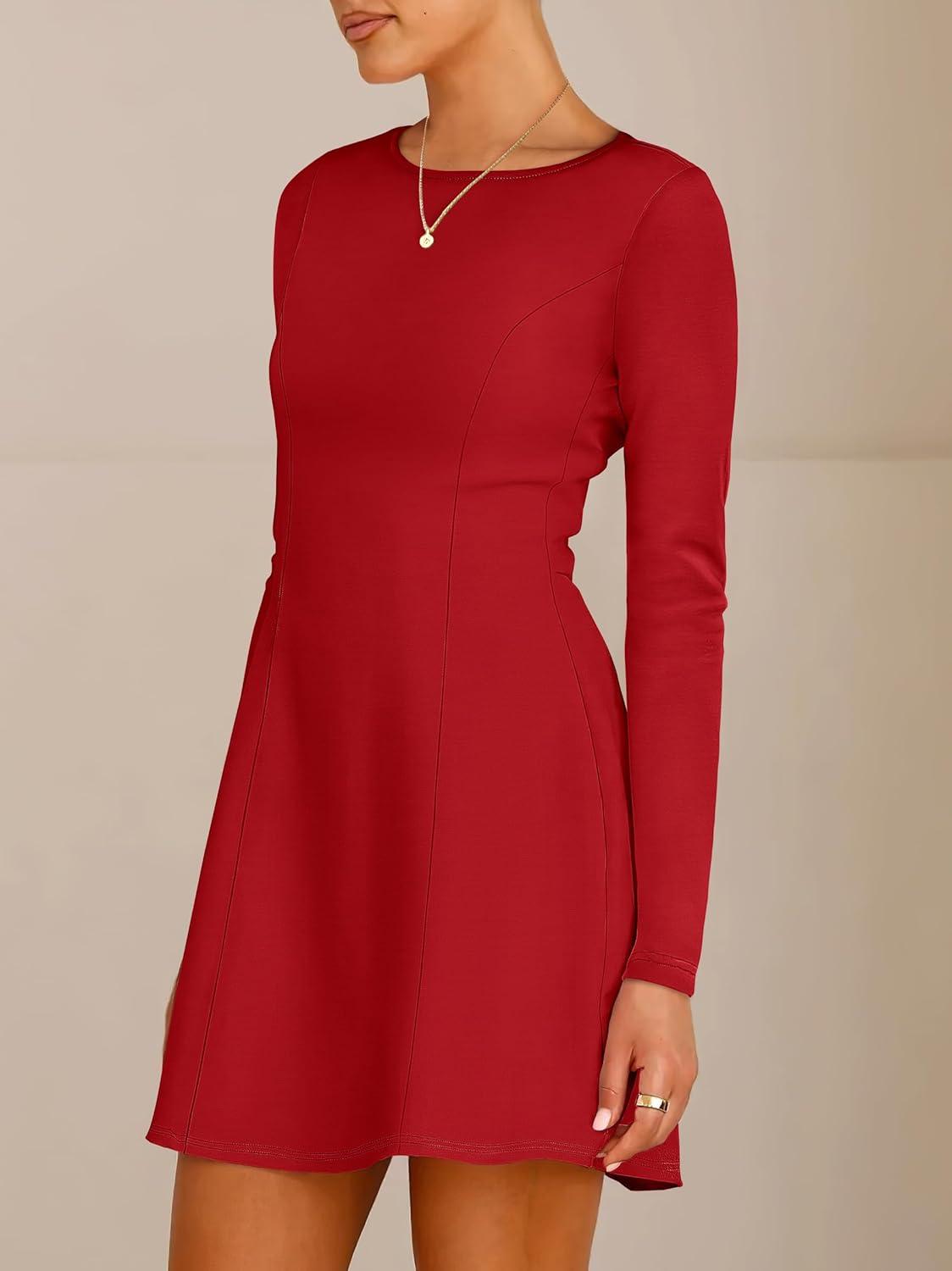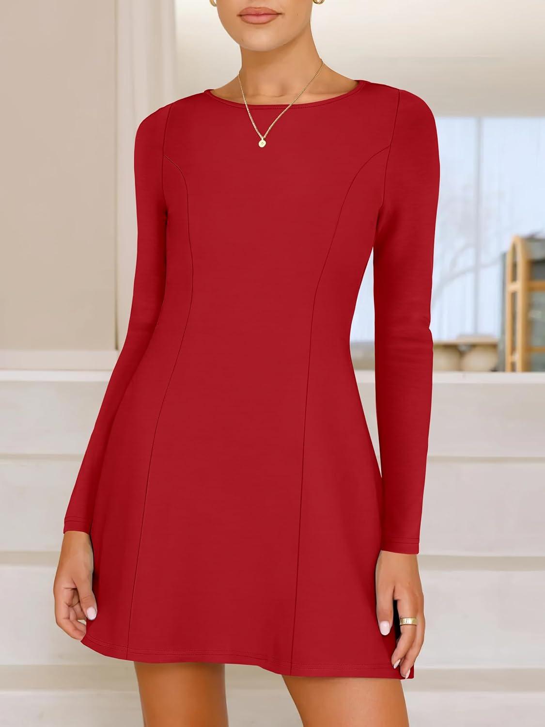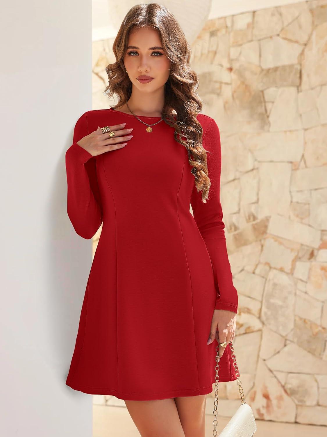 ANRABESS Women’s Long Sleeve A-Line Mini Dress 2025 Fall Boat Neck Semi Formal Fit and Flare Casual Business Short Dresses(Red)