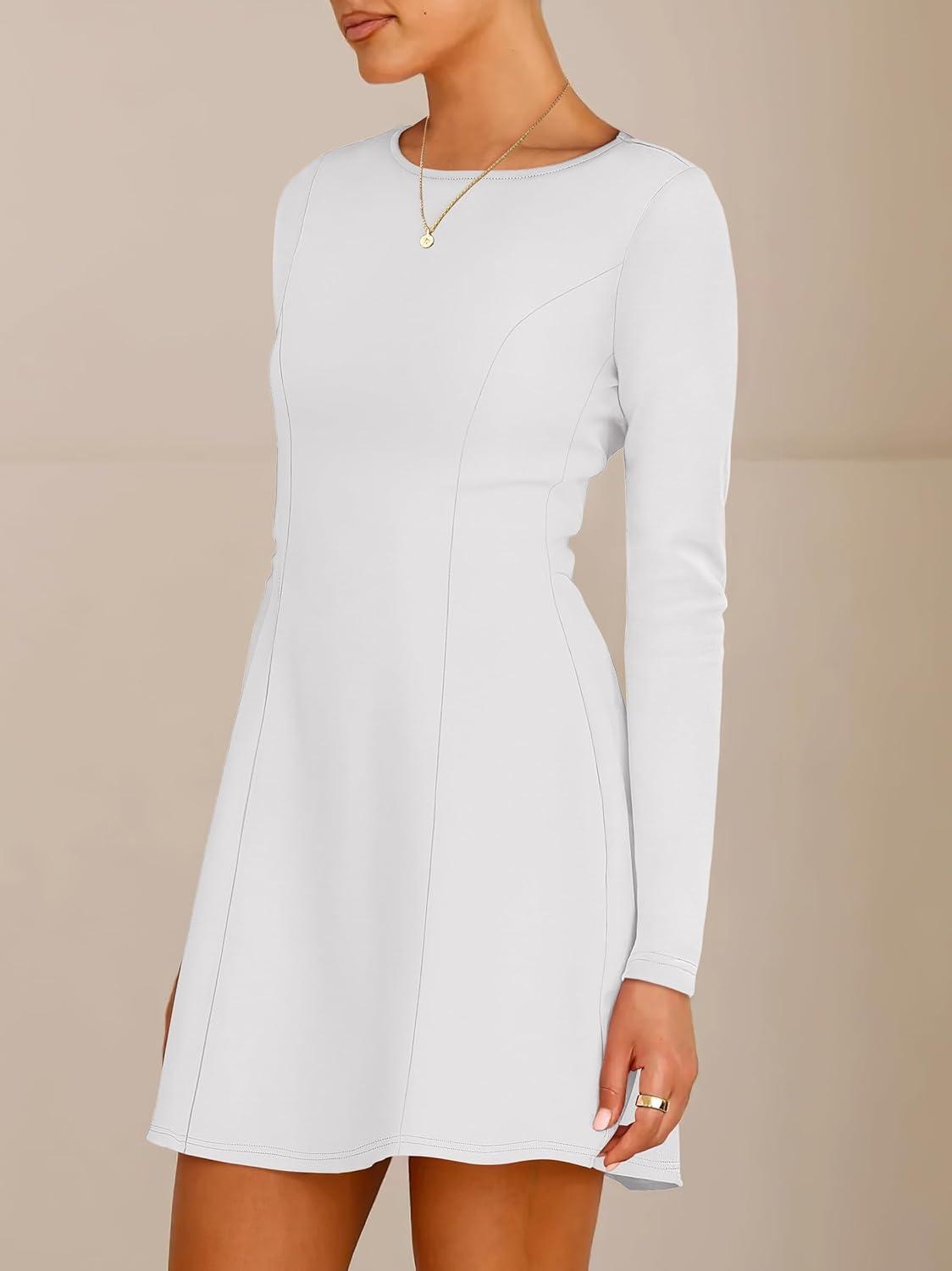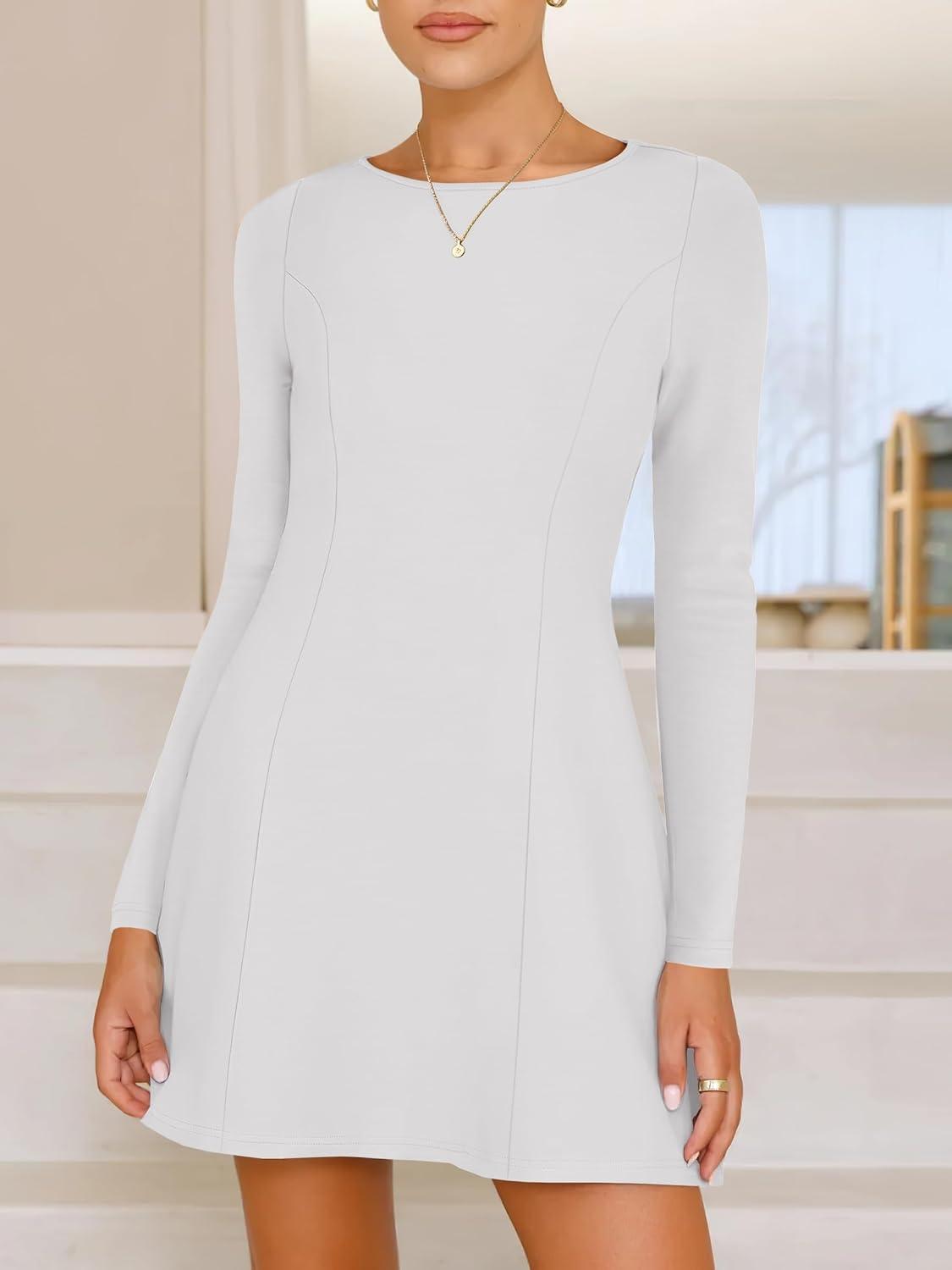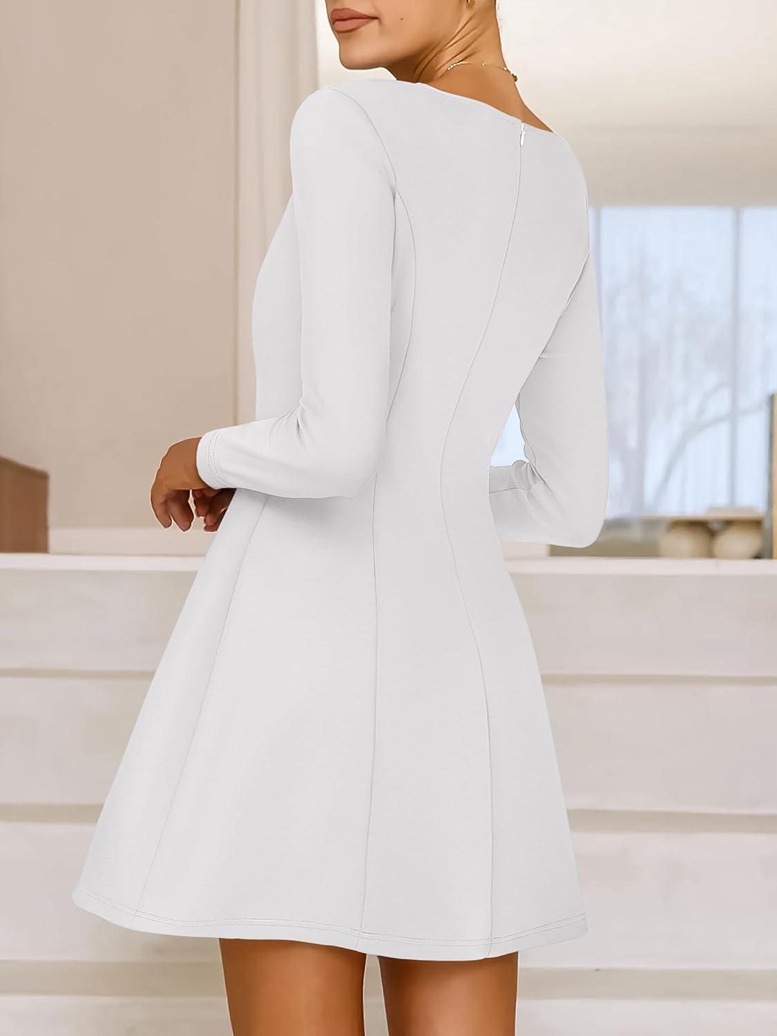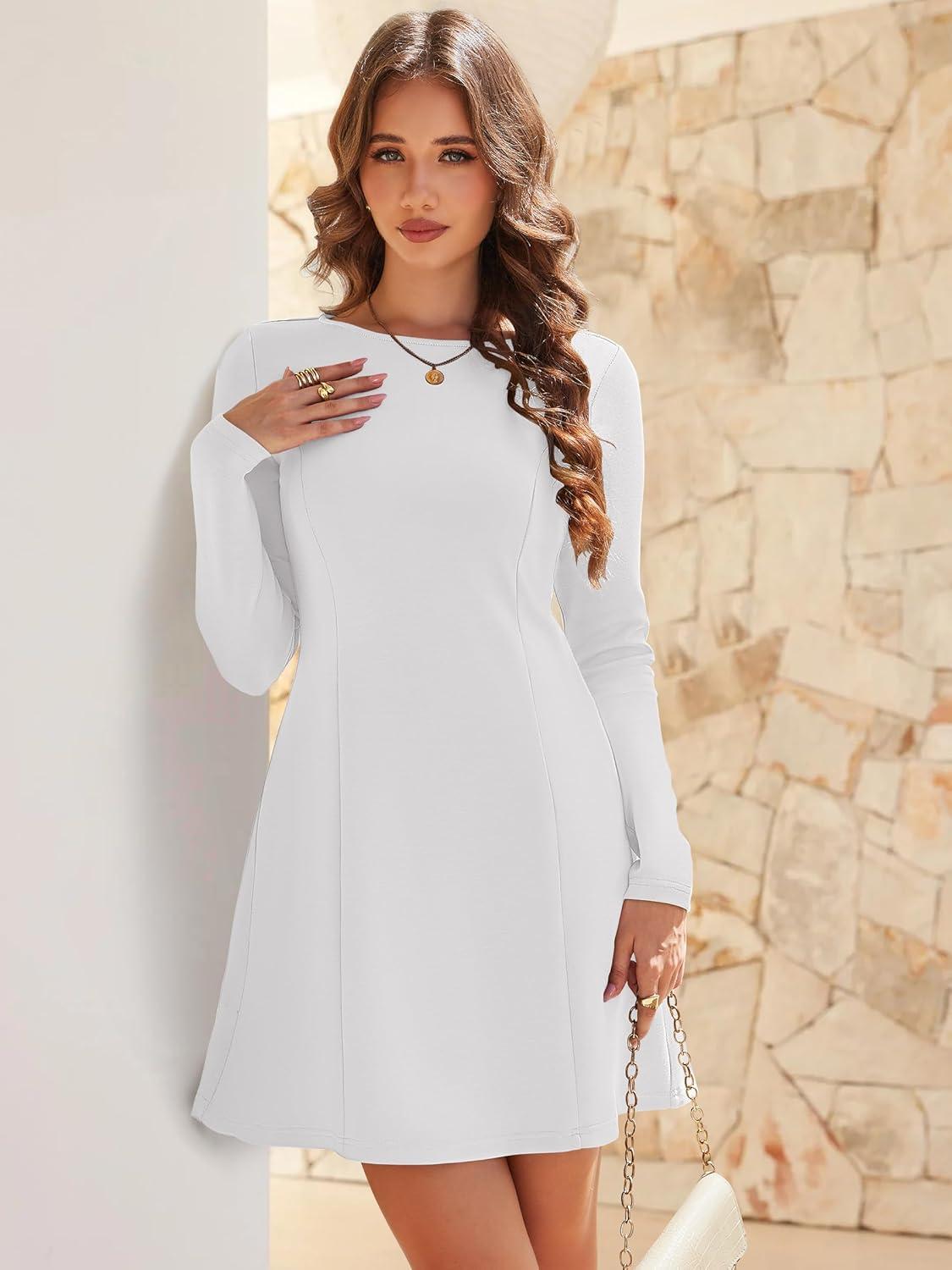 ANRABESS Women’s Long Sleeve A-Line Mini Dress 2025 Fall Boat Neck Semi Formal Fit and Flare Casual Business Short Dresses(White)