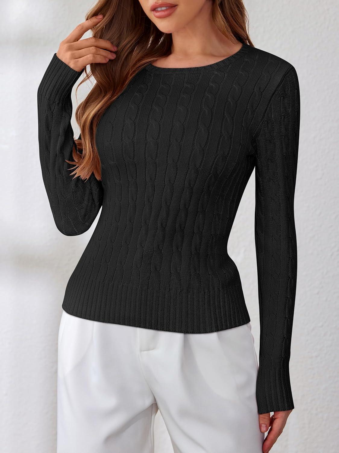 ANRABESS Womens Long Sleeve Cable Knit Sweater Jumper Crewneck Pullover Soft Dressy Casual Tops Cute 2025 Fall Trendy Outfits(Black)